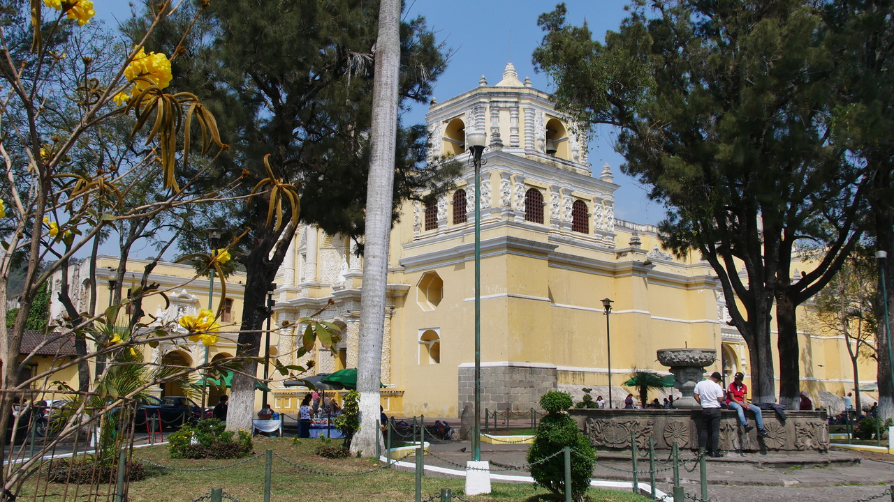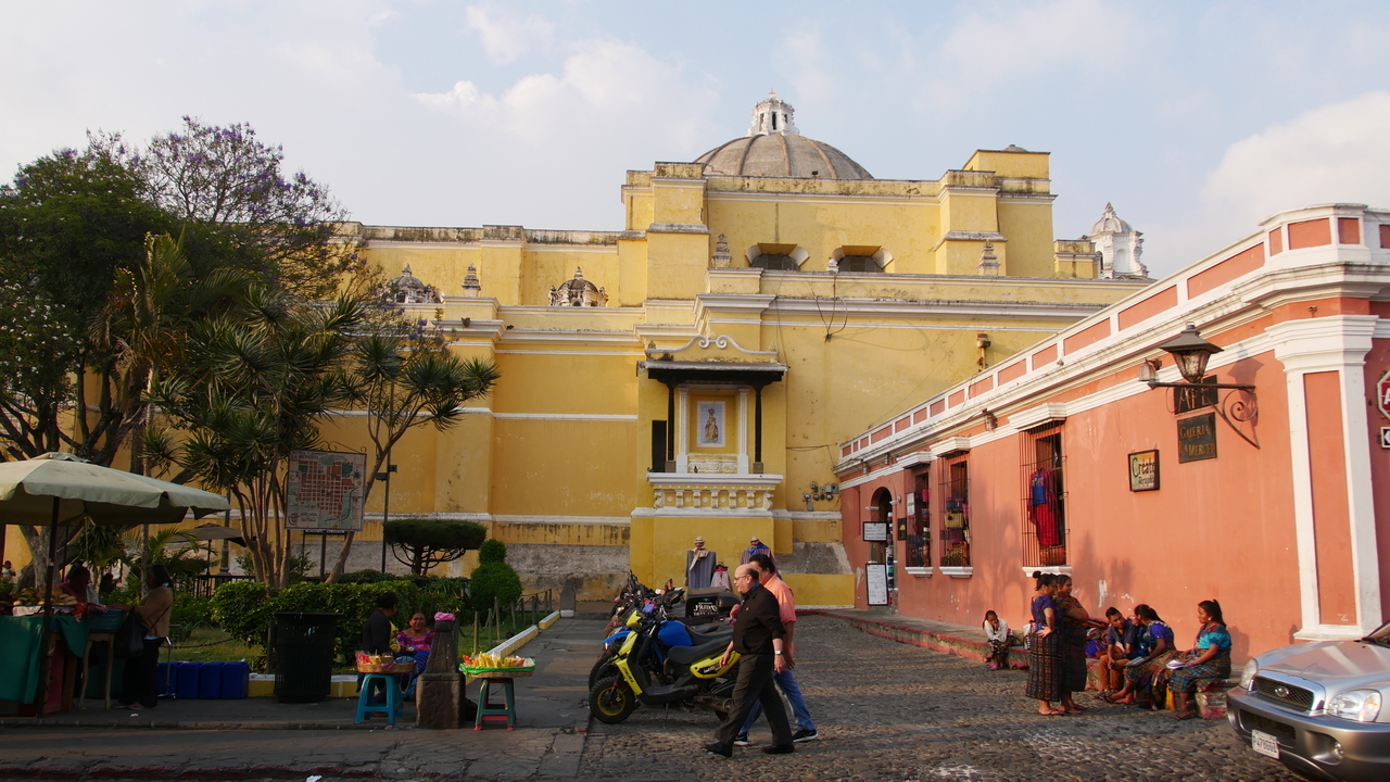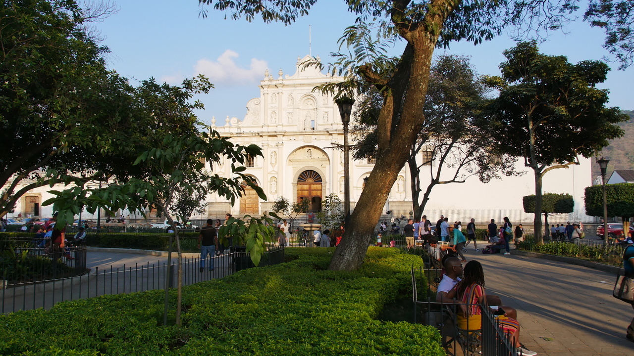 Auf dem Parque Central füttern Kinder Tauben, während Frauen in traditionellen Kleidern Schals verkaufen und eine Band Marima-Musik spielt. Vom Balkon des Palacio del Ayuntamiento können wir das bunte Treiben beobachten und die im Abendlicht golden erstrahlende Fassade der Kathedrale bewundern. Das größte und reichste Kloster ist heute im Luxushotel Casa Santo Domingo untergebracht, wo sich Loros, die in einem Piratenfilm mitspielen könnten, unter Strohdächern das Gefieder putzen.