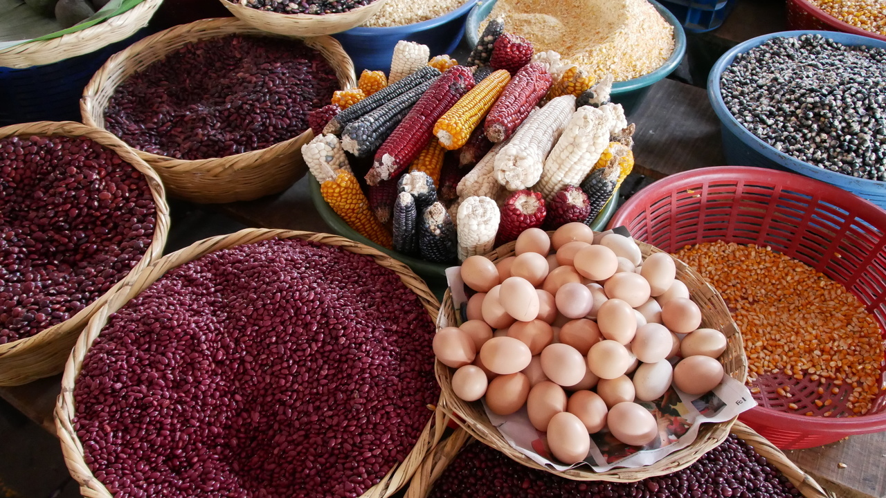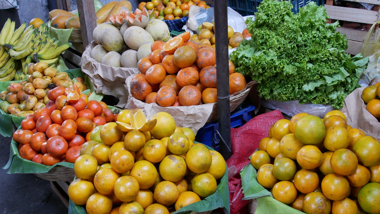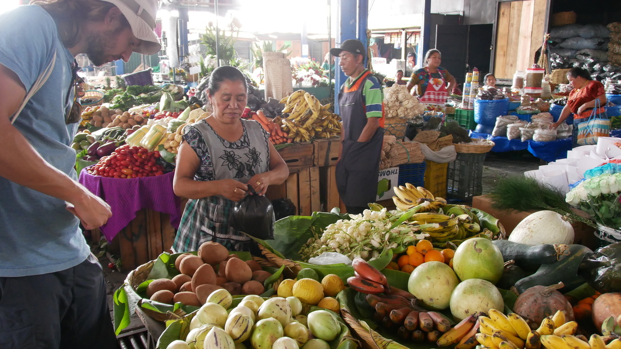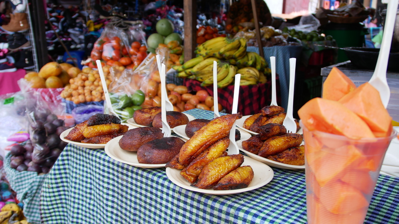 Der sonntags besonders große Markt ist ein buntes Farbenspiel aus frischem Obst, Gemüse, Bohnen und Mais. Wir essen frittierte Bananen, trinken eine grüne Kokosnuss und kaufen Macadamias, rote Bananen und ein paar uns unbekannte Früchte, von denen sich die braune Zapote als eine rote, herrlich schmeckende Frucht herausstellt.
