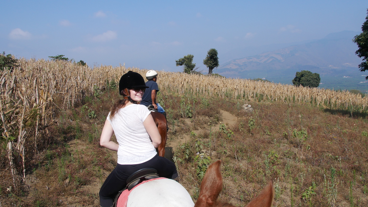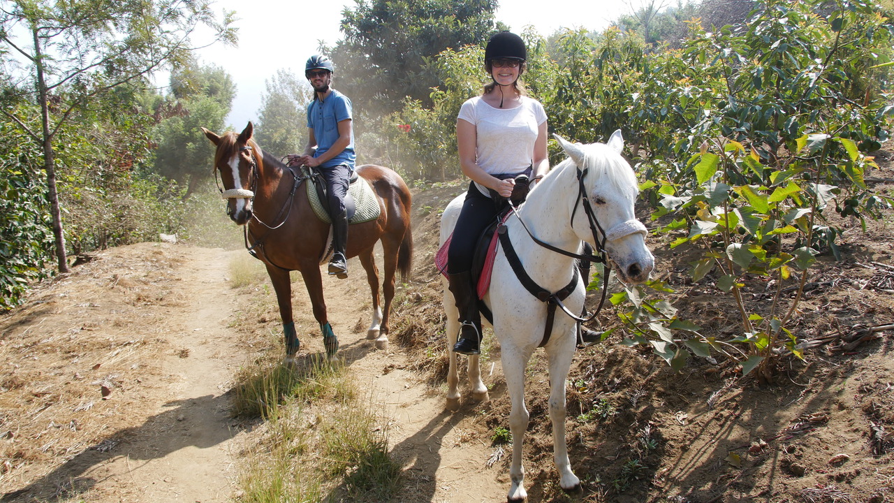 Von San Juan del Obispo aus erkunden wir die Ausläufer des Vulkans Agua. Wir reiten durch Kaffeeplantagen, vorbei an Avocadobäumen und genießen weite Blicke auf die umliegenden Wälder, Örtchen und Vulkane. In San Miguel sehen wir die Kontraste Guatemalas: zuerst reiten wir an einer „Gated Community“ vorbei mit gepflegten Gärten hinter hohen Mauern und Stacheldrahtzäunen, kurz darauf durch ein Armenviertel voller Müll. Unsere hübschen Pferde Merlin und Khalifa haben Arababerblut und daher ordentlich Feuer, sodass wir sie immer wieder zügeln müssen. „Feuer“ heißt auch der Vulkan Fuego auf Spanisch, der immer wieder imposante Rauchwolken in den Himmel spuckt. An einem Baum probieren wir gelbe Nísperos, die eine pflaumenähnliche Konsistenz haben. Fazit: Ein sehr schöner Austritt mit tollen Ausblicken, gut ausgebildeten Pferden und bequemen Sätteln.