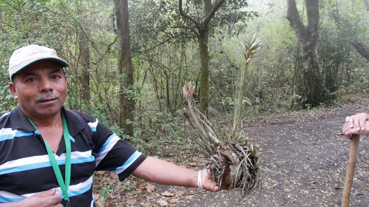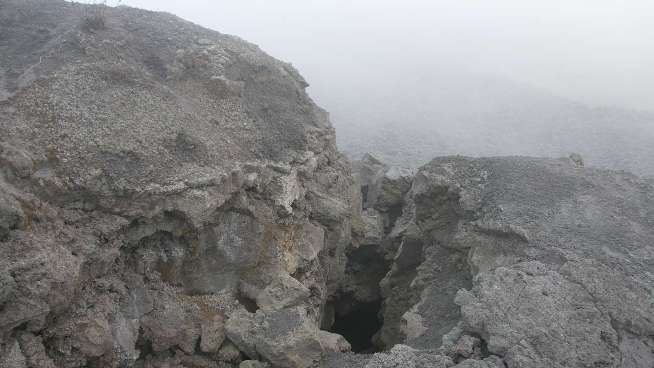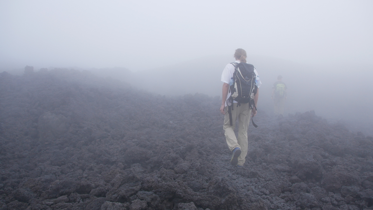 Nachdem wir von Antigua aus fast anderthalb Stunden lang für 50 Kilometer Strecke im engen Minibus ohne Kopflehnen durch die Berge geholpert sind, starten wir die Vulkanwanderung zum Pacaya. Auf uns fünf Traveller aus Belgien, Kanada und Deutschland kommen drei Guides und ein Pferd: Greg aus den USA, Carlos aus dem Nachbardorf und für die ersten Kilometer ein weiterer lokaler Guide, der ein Pferd führt und uns immer wieder anbietet, uns doch auf dessen Rücken den steilen Berg hinauftragen zu lassen. Was aber niemand in Anspruch nimmt. Carlos zeigt uns eine Pflanze namens Gallito, die hier als Weihnachtsschmuck verwendet wird. Erst sind die Wolken über uns, dann sind wir mittendrin. Nach einiger Zeit erreichen wir die erkaltete Lava. Sehen können wir den Vulkan nicht, dafür hören wir die herabrauschenden Lavagesteine. Die Lavaströme scheinen heute recht laut und nah zu sein, meint Carlos.