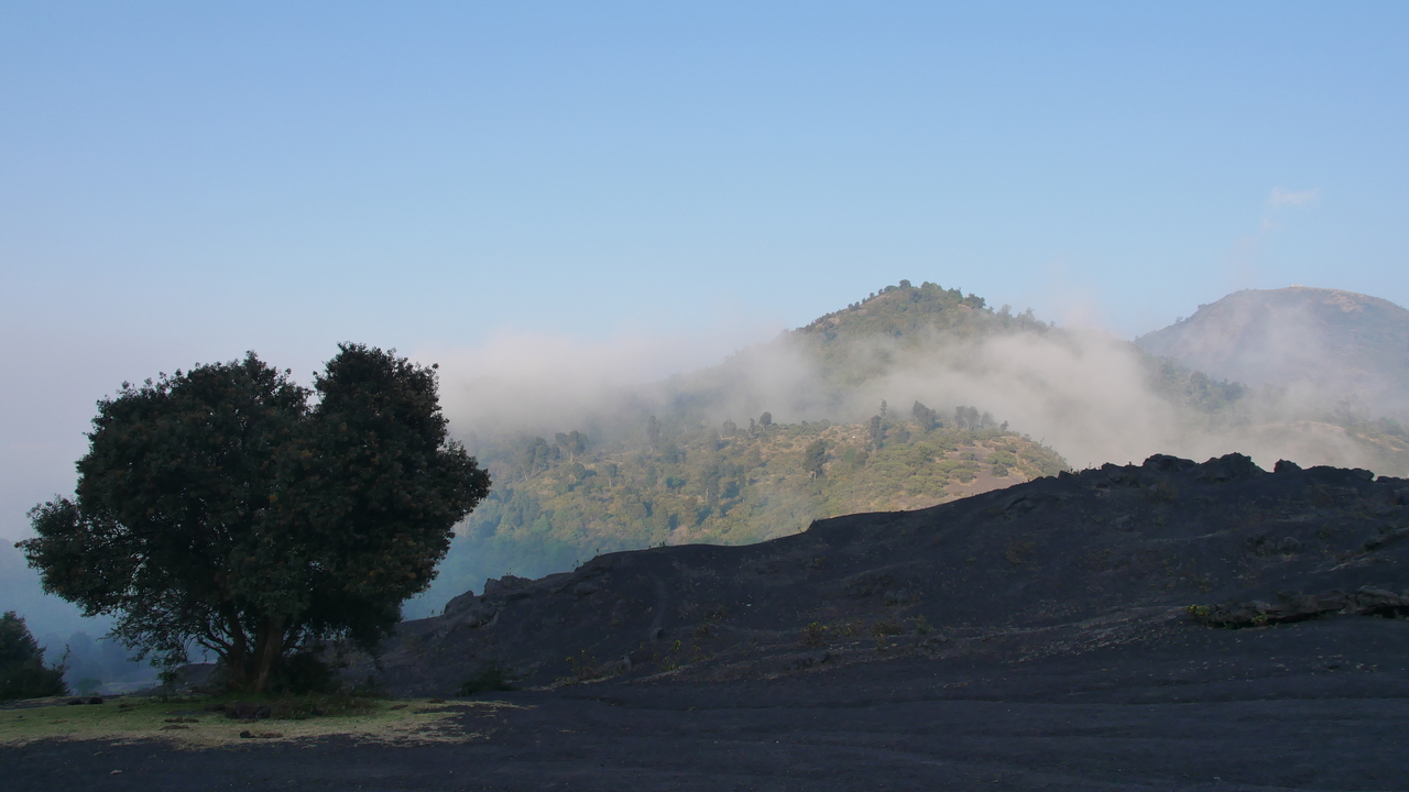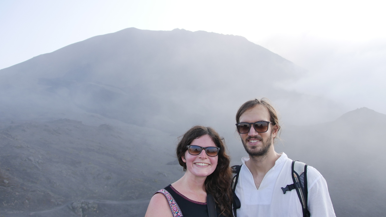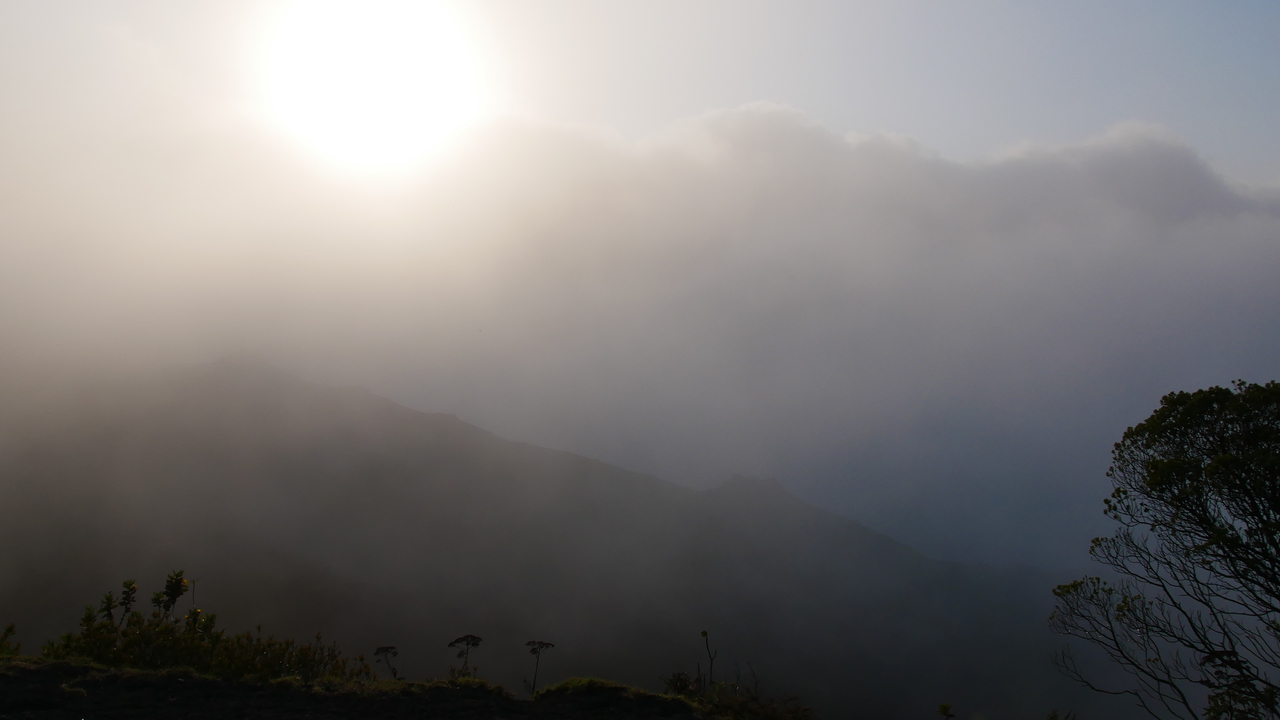 Dann haben wir Glück. Genau als wir am Aussichtspunkt sind, reißt mit einem Mal die Wolkenwand auf und wir genießen tolle Blicke auf den Vulkan. Durch die vorbeiziehenden Wolken ändert sich die Aussicht sekündlich. Andeutungsweise können wir das rote Glimmen der Lava erkennen. Weiter geht es über scharf gezackte Lavagesteine, vorbei an Farnen, die seit dem letzten Ausbruch vor einem halben Jahr schon wieder sprießen. An vielen Stellen ist der Boden heiß. Wir verspeisen unsere Gemüse-Sandwichs, während wir beobachten, wie die untergehende Sonne die Wolken unter uns in rosafarbenes Licht taucht.