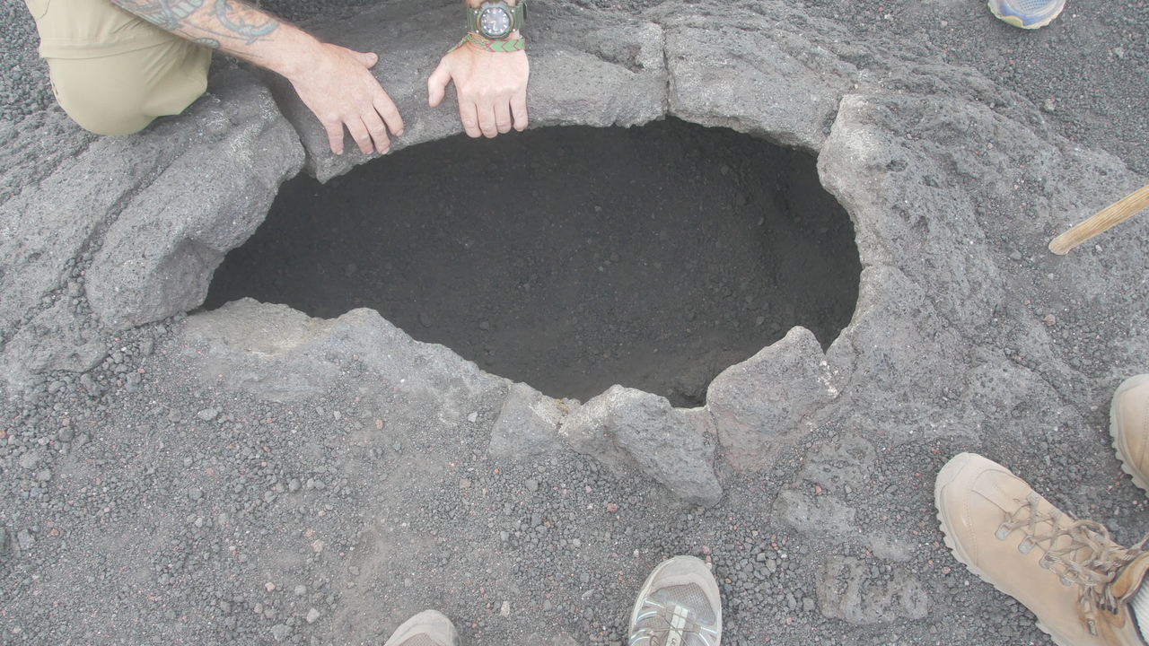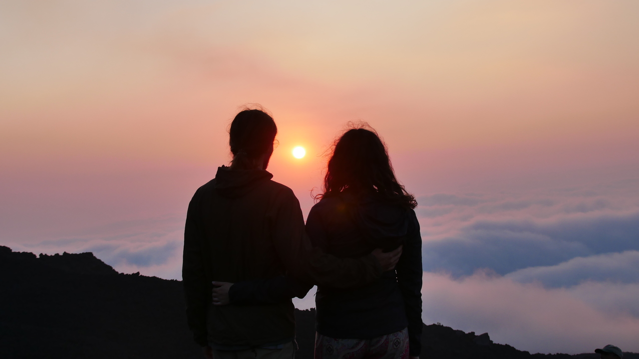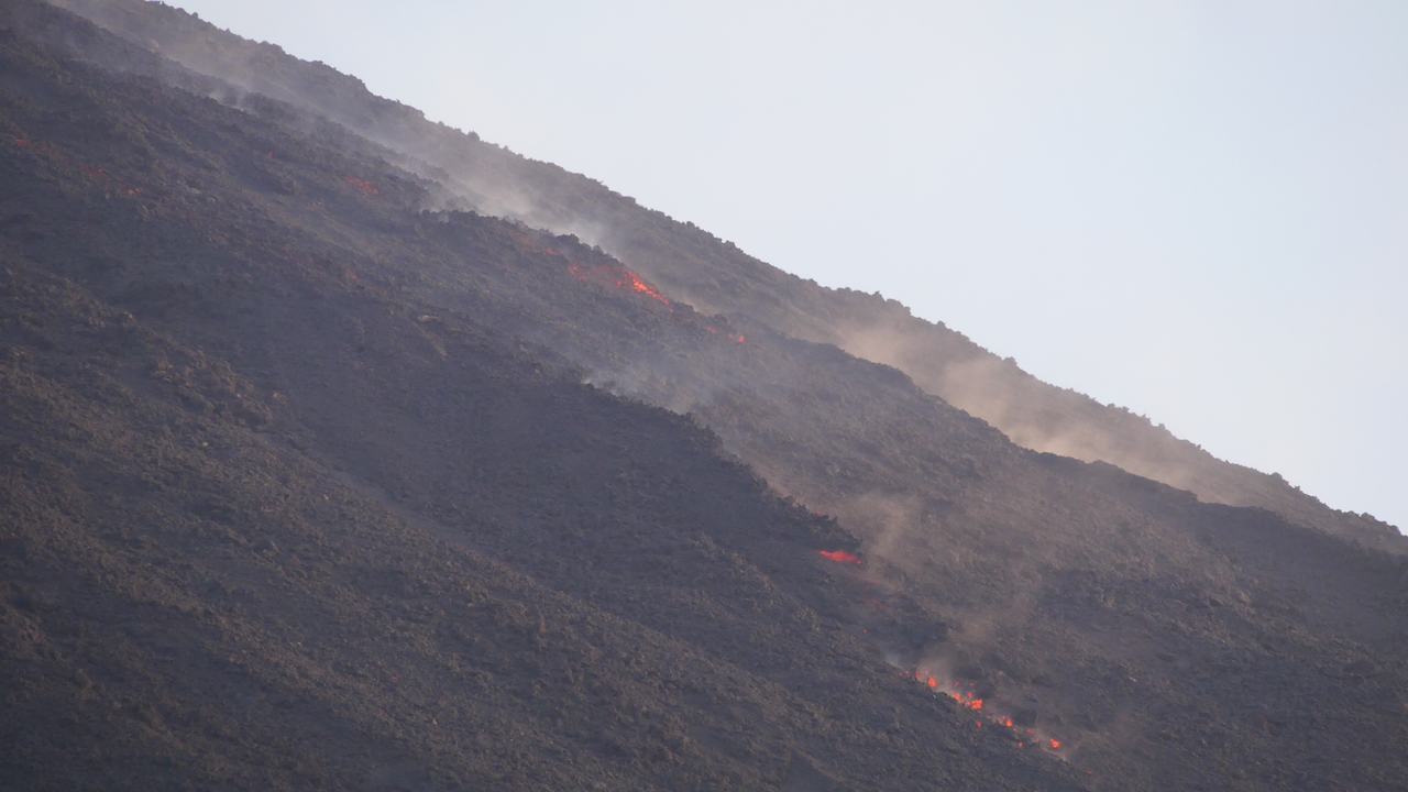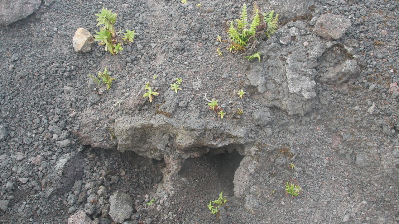 Dann haben wir Glück. Genau als wir am Aussichtspunkt sind, reißt mit einem Mal die Wolkenwand auf und wir genießen tolle Blicke auf den Vulkan. Durch die vorbeiziehenden Wolken ändert sich die Aussicht sekündlich. Andeutungsweise können wir das rote Glimmen der Lava erkennen. Weiter geht es über scharf gezackte Lavagesteine, vorbei an Farnen, die seit dem letzten Ausbruch vor einem halben Jahr schon wieder sprießen. An vielen Stellen ist der Boden heiß. Wir verspeisen unsere Gemüse-Sandwichs, während wir beobachten, wie die untergehende Sonne die Wolken unter uns in rosafarbenes Licht taucht.