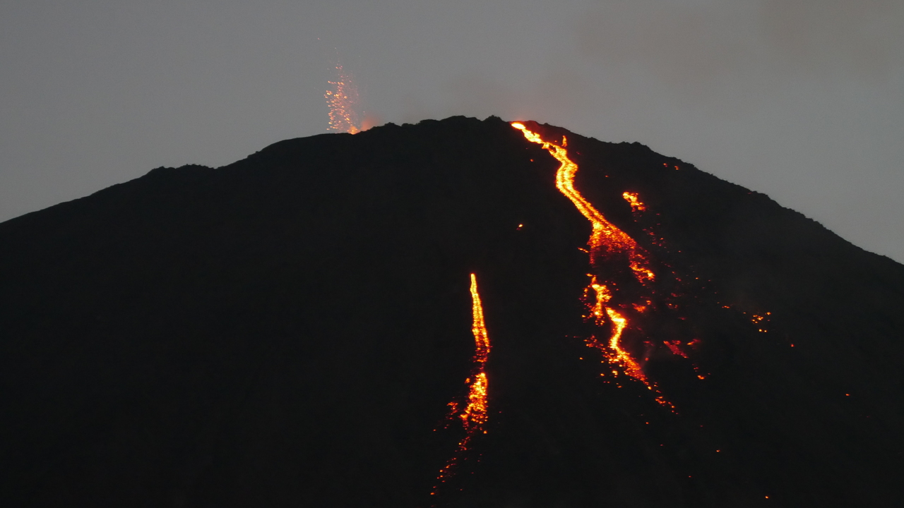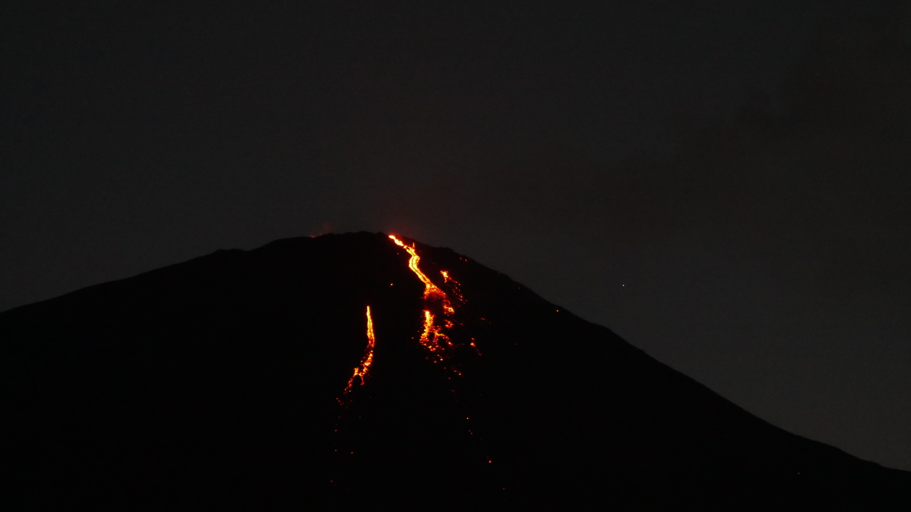 Inzwischen glühen die Lavaströme des Pacaya bernsteinfarben. Je dunkler es wird, desto greller leuchten sie und sehen aus wie eine stark befahrene Lavastraße. Jetzt können wir auch mit bloßen Augen die Lavabrocken sehen, die der Vulkan hoch in die Luft speit. Ein spektakulärer Anblick! Wir hätten uns nicht träumen lassen, hier einen Vulkan in voller Action zu sehen und das aus nur ein paar hundert Metern Entfernung.
