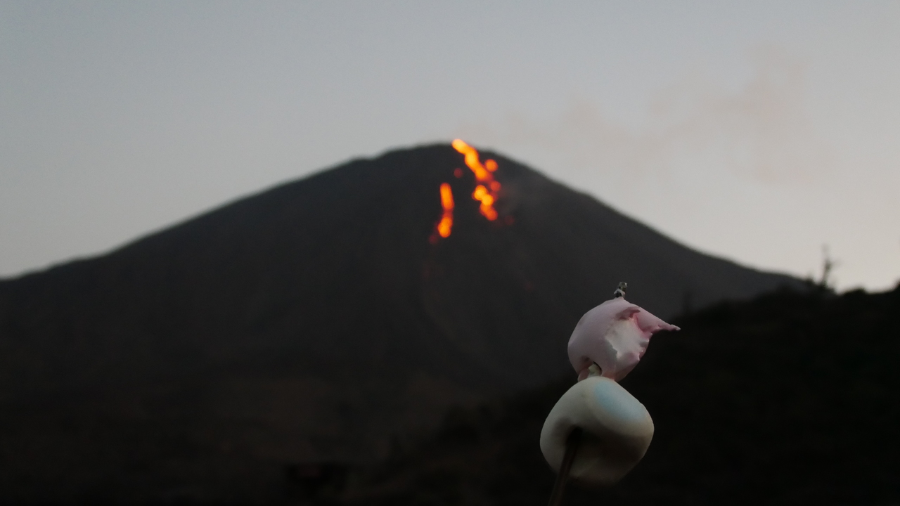 In heißen Steinlöchern grillen wir Marshmallows. Greg sorgt dafür, dass ein paar hier herumlungernde Vulkanhunde auch auf ihre Kosten kommen. Von einer Anhöhe aus genießen wir den letzten Blick auf den faszinierend leuchtenden Pacaya. Beim Abstieg begrüßt uns der Vollmond, der gerade aufgegangen ist und jede Menge Sterne.