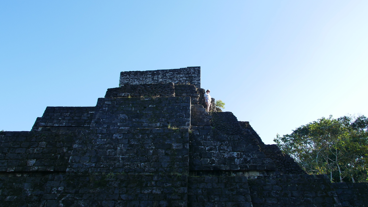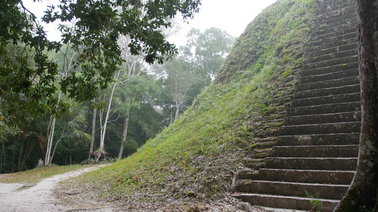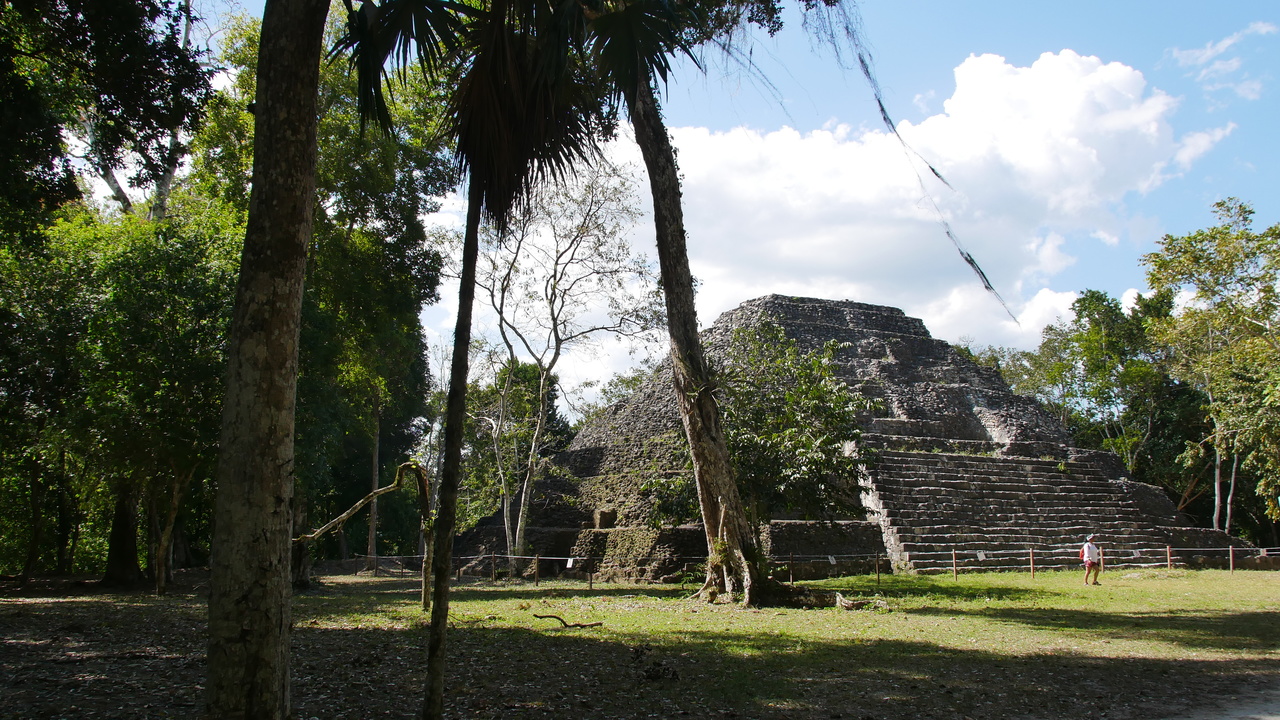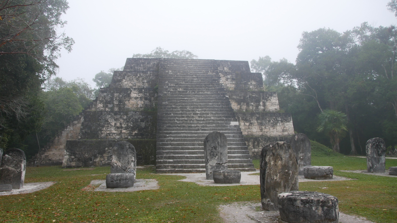 Als wir auf der Gran Plaza ankommen, lichtet sich langsam der Nebel und es klart auf. Hier befindet sich in Richtung des Sonnenaufgangs ein Mausoleum für den Herrscher Ah Cacao, der mit 1,82 Meter seine Maya-Landsleute um mehr als einen Kopf überragte. Von der Nordakropolis und dem Templo II aus können wir die Plaza und den umgebenden Dschungel gut überblicken, den Spechten lauschen und nach bunten Papageien Ausschau halten.