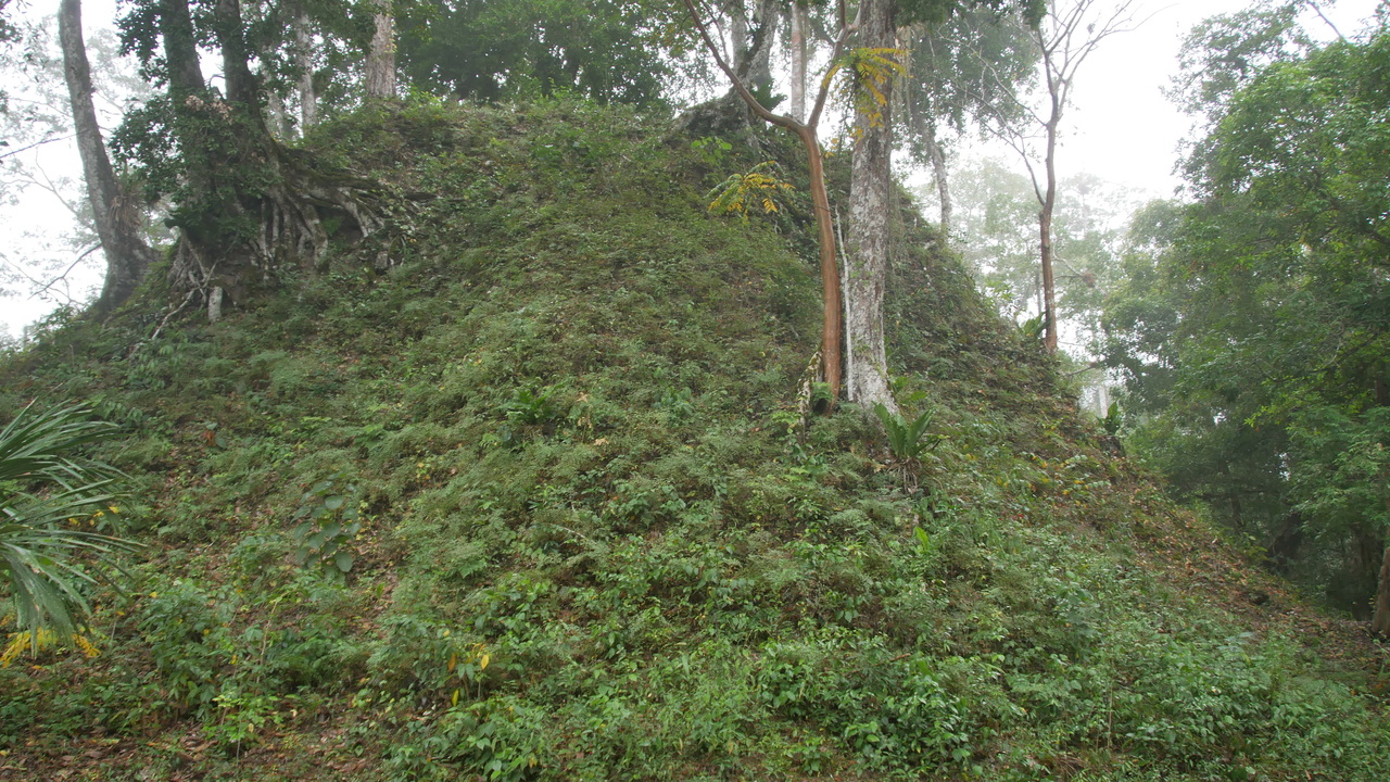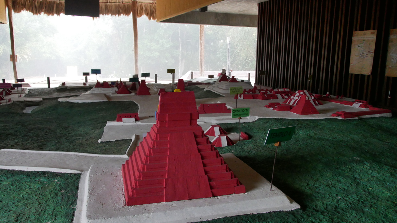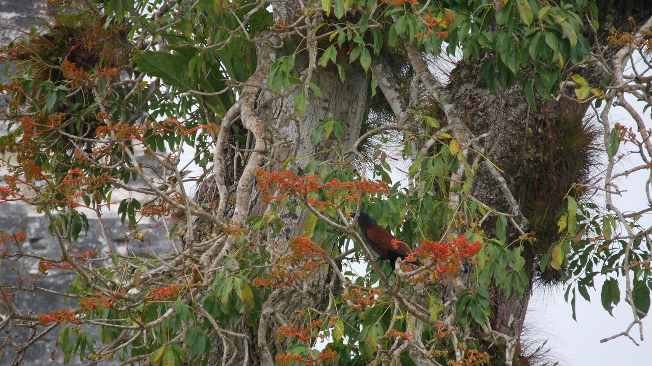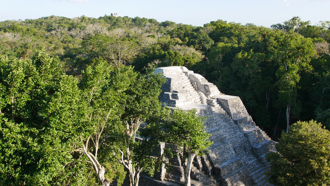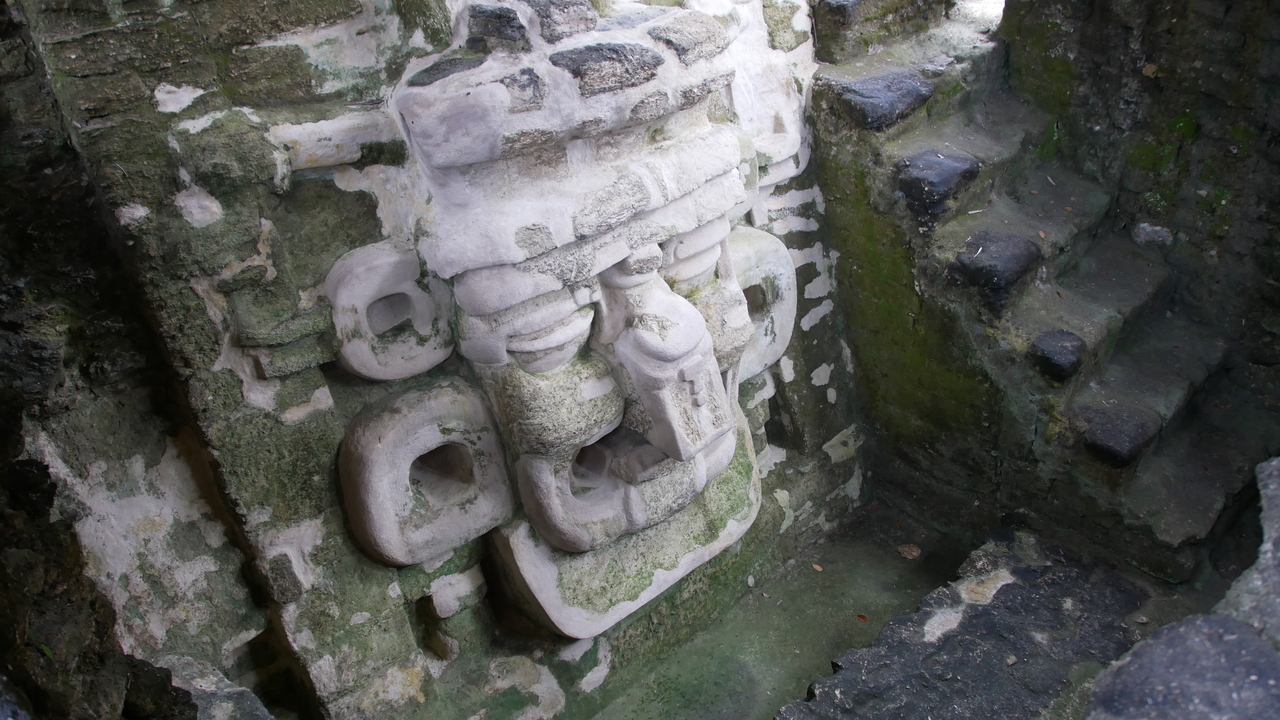 Als wir auf der Gran Plaza ankommen, lichtet sich langsam der Nebel und es klart auf. Hier befindet sich in Richtung des Sonnenaufgangs ein Mausoleum für den Herrscher Ah Cacao, der mit 1,82 Meter seine Maya-Landsleute um mehr als einen Kopf überragte. Von der Nordakropolis und dem Templo II aus können wir die Plaza und den umgebenden Dschungel gut überblicken, den Spechten lauschen und nach bunten Papageien Ausschau halten.