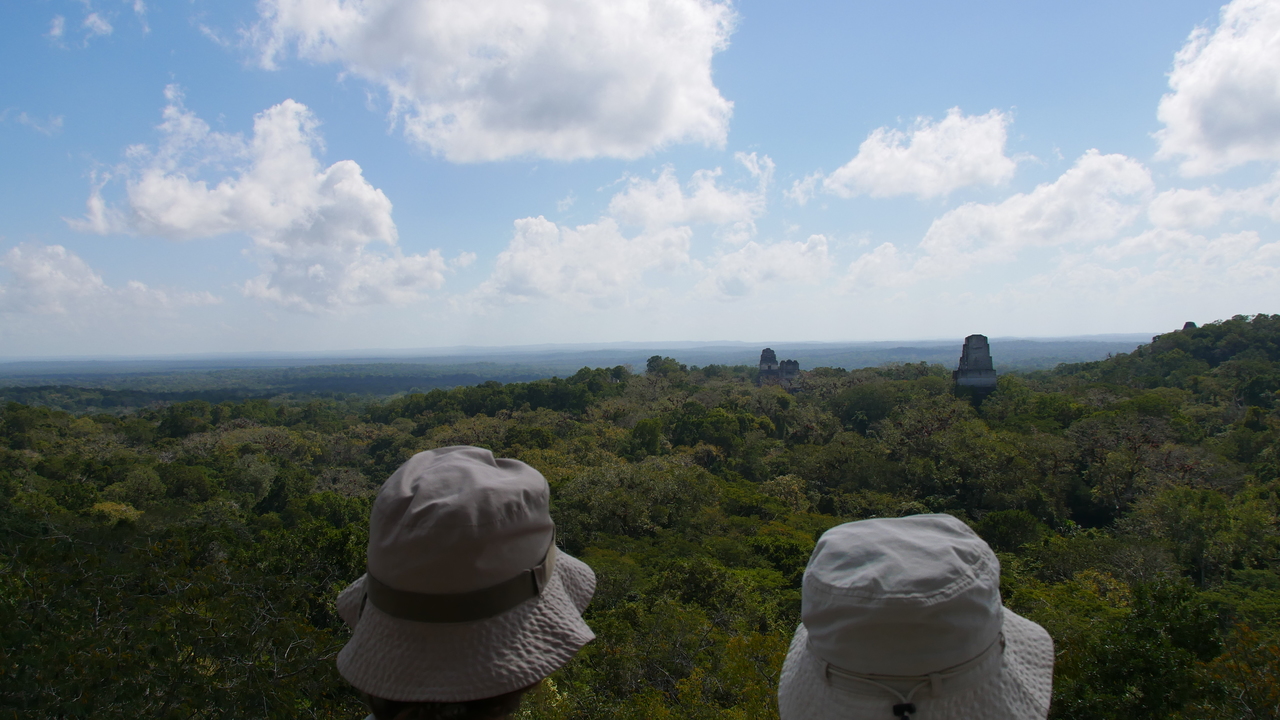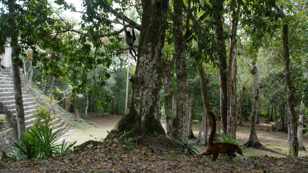 Zum Tempelkomplex des Mundo Perdido (“verlorene Welt”) gehört ein Tempel mit flachem Dach, der zur Beobachtung der Sterne diente. Von hier aus sehen wir die Spitzen der höheren Tempel aus dem Urwald ragen und hören das Grollen der Brüllaffen, das uns an Raubtiergebrüll erinnert. Tikal bedeutet “Echo”, der ursprüngliche Name der Mayastadt hingegen “gründe Stadt”. Beides irgendwie treffend.