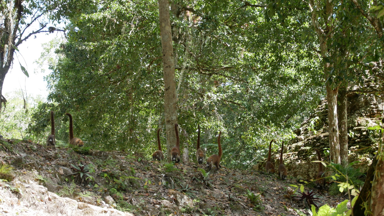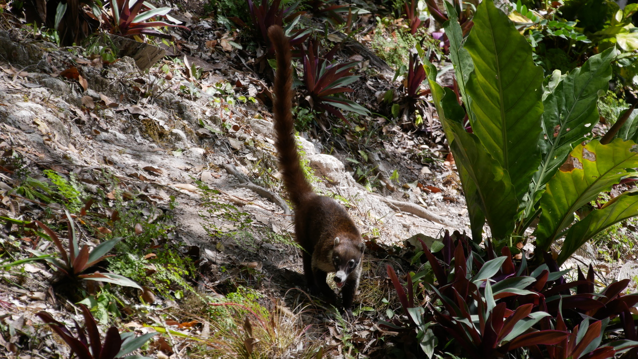 Nach der Führung wandern wir zum entlegenen Nordkomplex, wohin sich nur wenige Besucher verirren, dafür jedoch um so mehr Dschungelbewohner. Kaum haben wir die Tempel erreicht, kommen uns Dutzende von Nasenbären entgegen. Auch Klammeraffen sehen wir aus wenigen Metern Entfernung in den Bäumen herumturnen. Die Tiere sind weder aggressiv noch betteln sie um Futter, sondern lassen uns genauso in Ruhe wie wir sie.