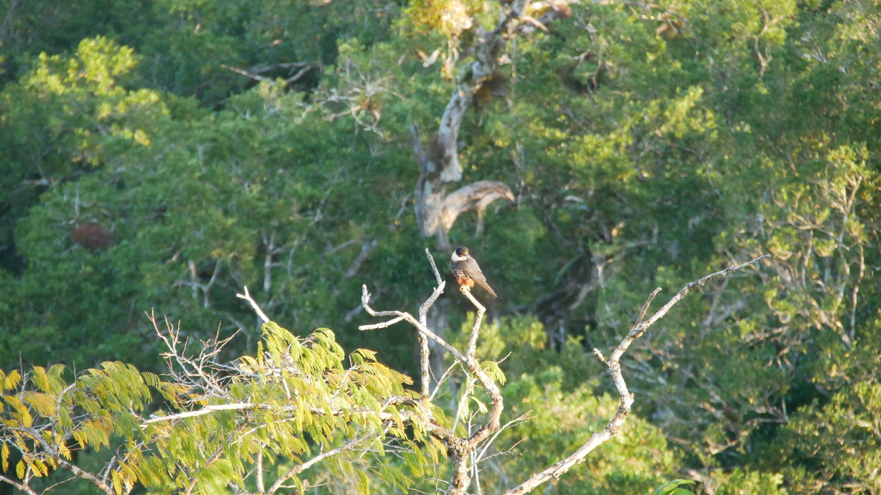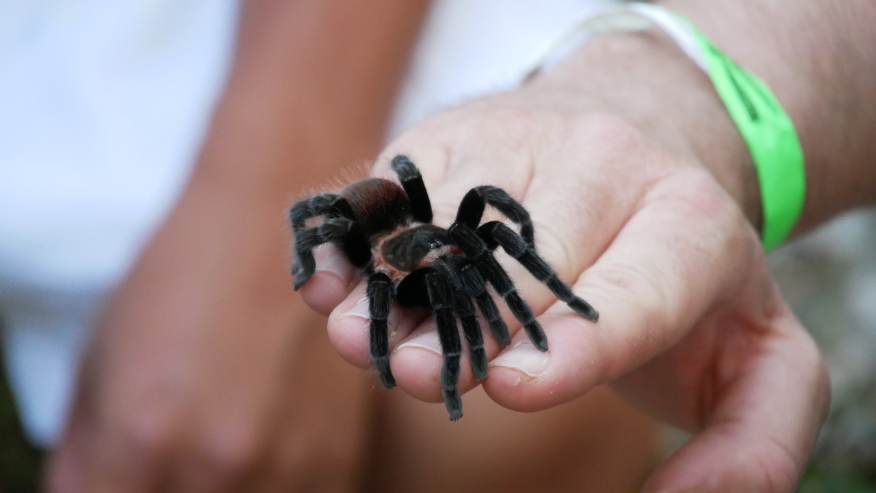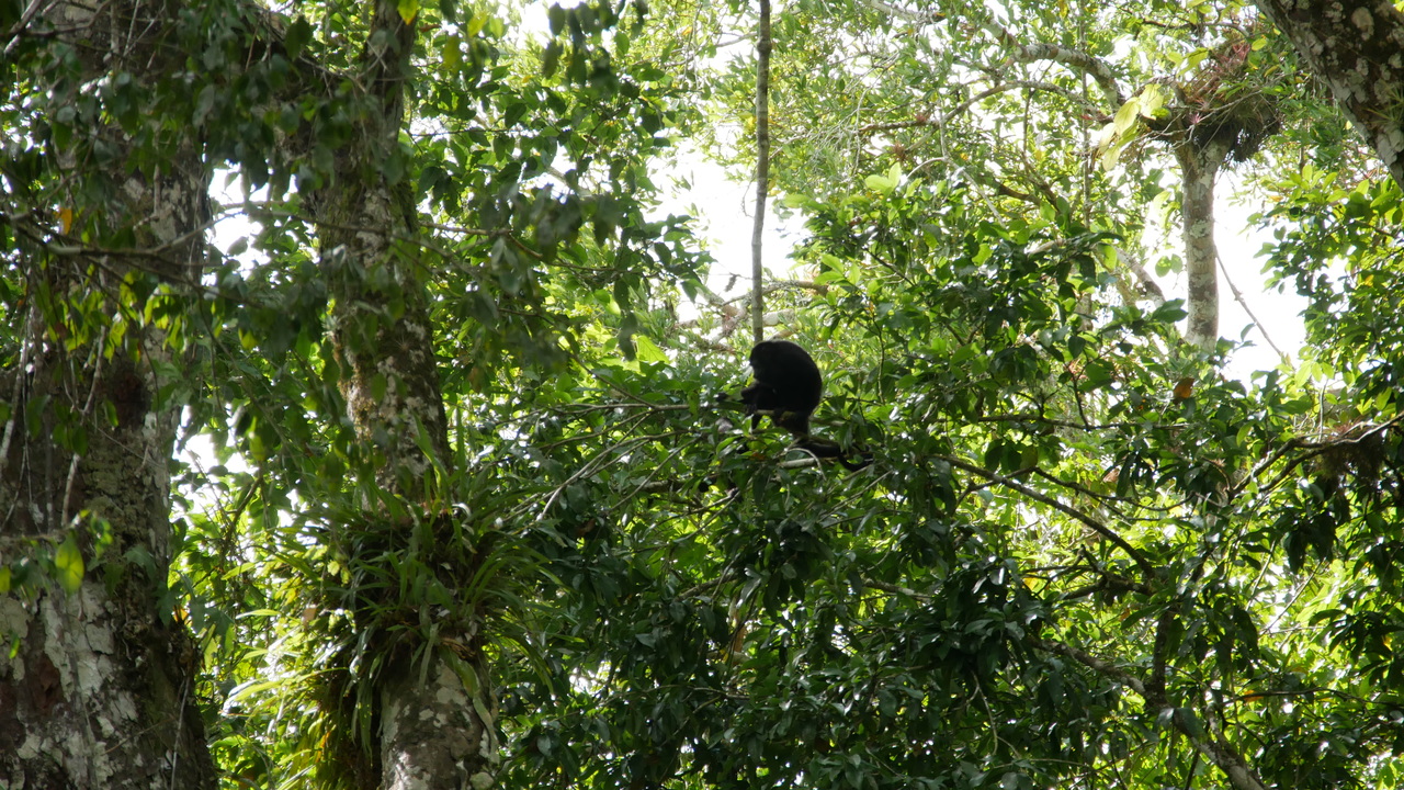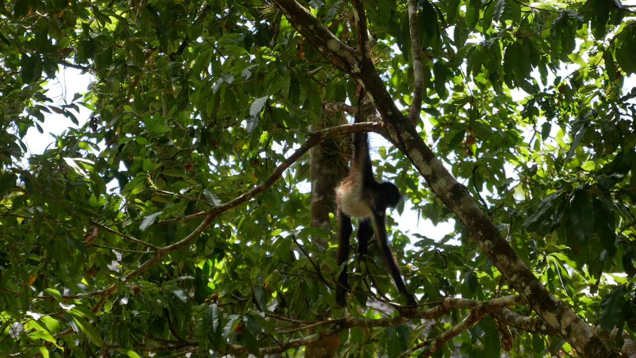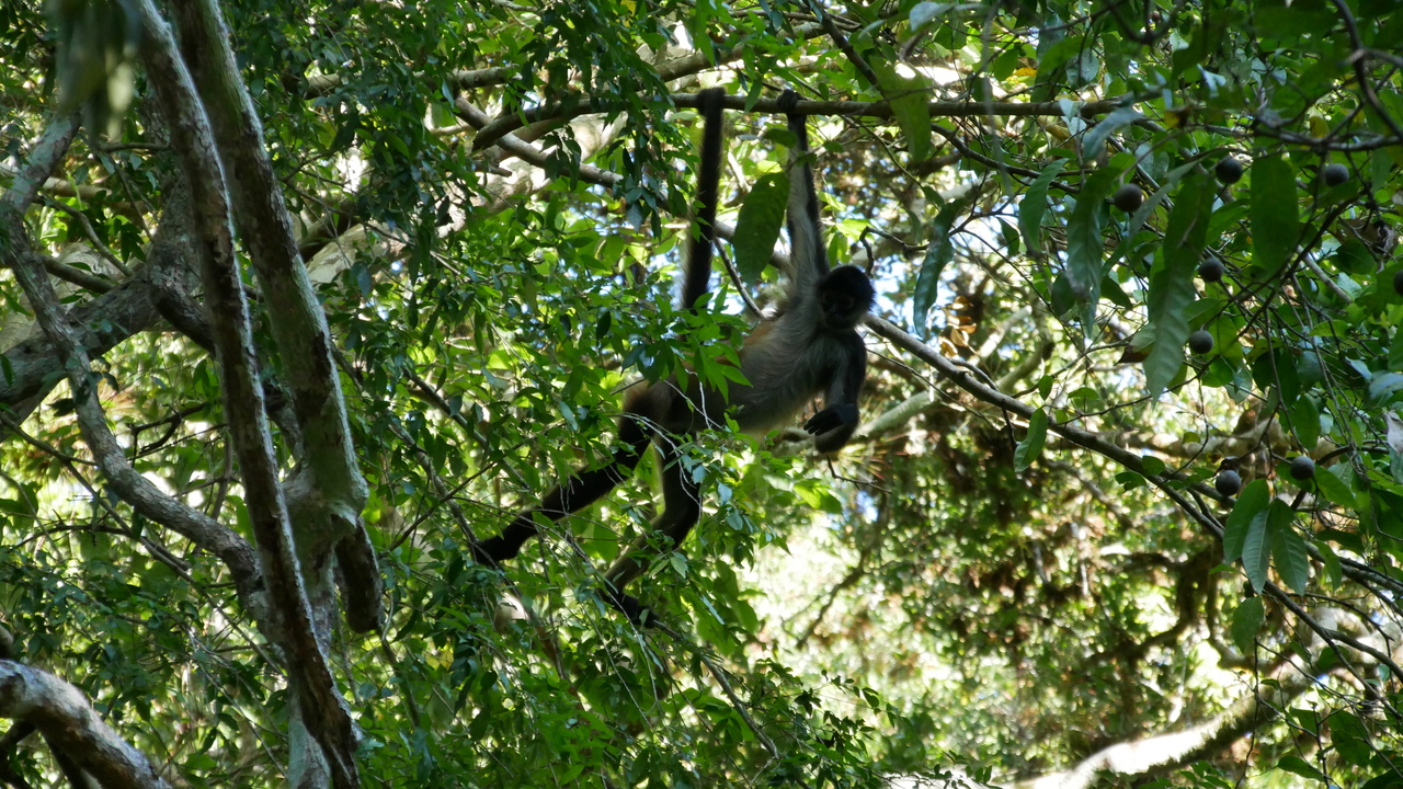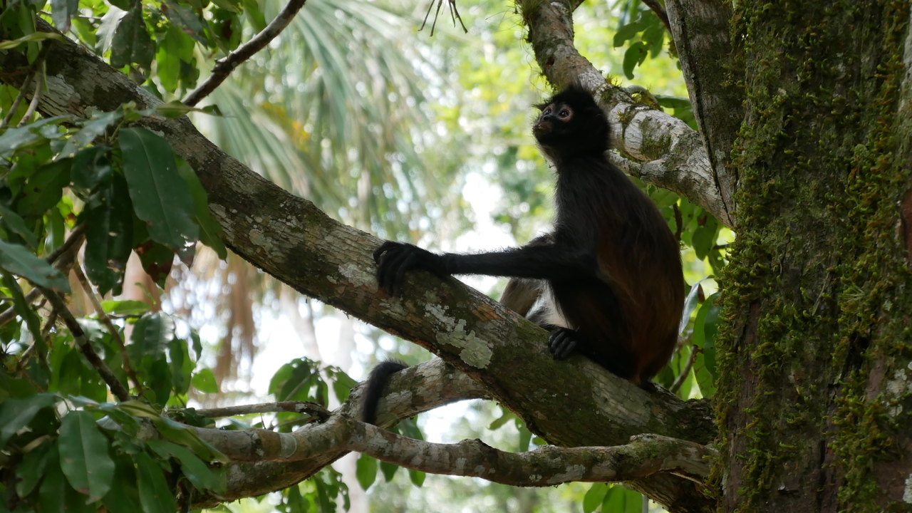 An diesem Nachmittag sind wir mit 15 Besuchern die einzige Gruppe in Yaxhá. So haben wir den Urwald und die Pyramiden für uns alleine und sehen zahlreiche wilde Tiere von ganz nahem. Neben den Klammeraffen kommen diesmal auch Brüllaffen in Sichtweite. In einem Erdloch spürt unser Guide eine Tarantel auf, die einige auf die Hand nehmen. Neben einem Tukan sehen wir seltene Rotbauchfalken, die auf der höchsten Pyramide nisten.