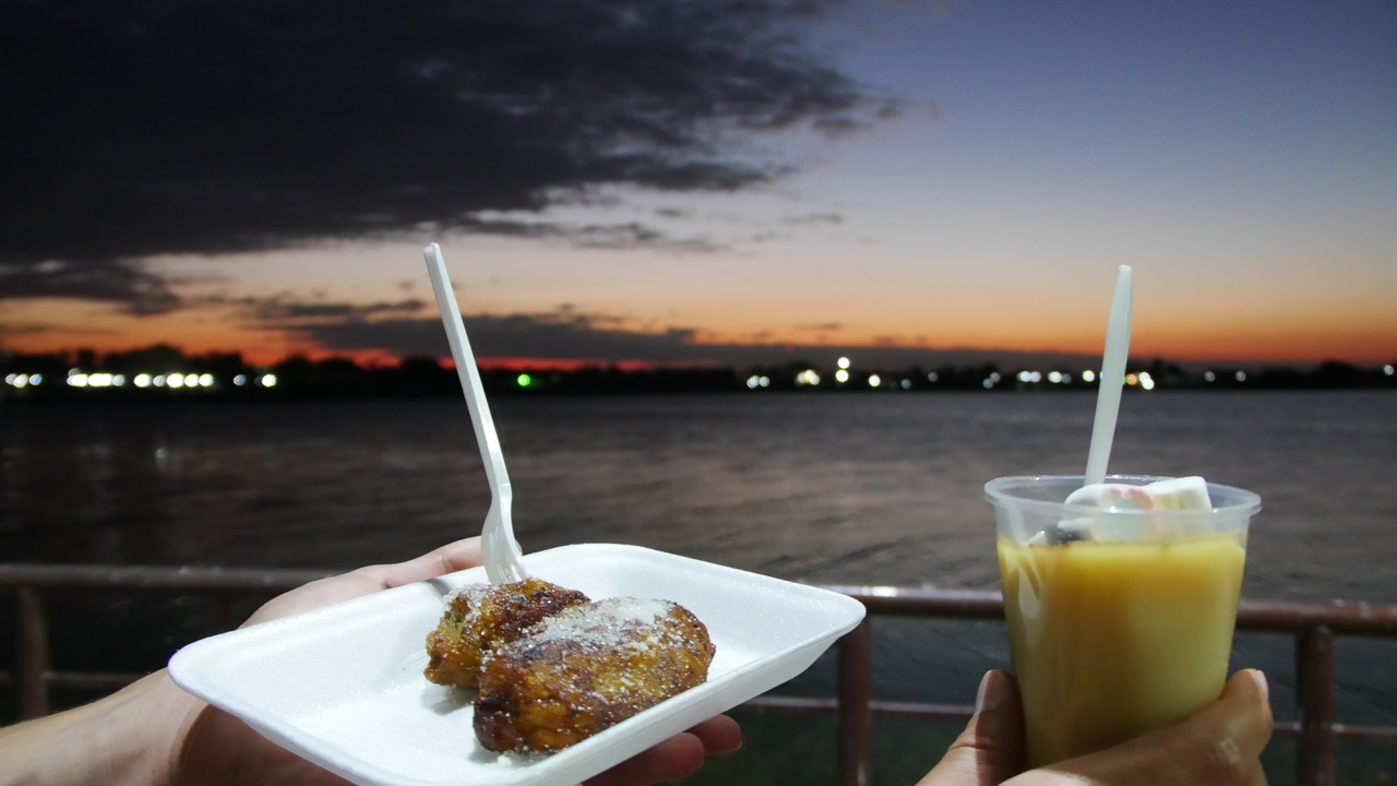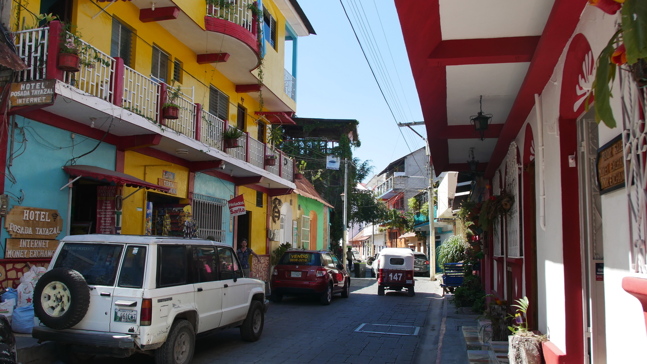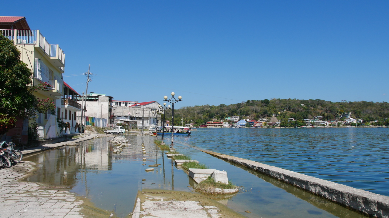 Die Isla de Flores ist verkehrstechnisch der Ausgangspunkt zur Erkundung Tikals. Mit ihren bunten Kolonialhäusern lädt sie zu einem Spaziergang ein. Da der Wasserstand des umliegenden Sees gestiegen ist, ist der Norden des Inselchens überflutet, sodass hier kleine Fische auf der Straße neben uns her schwimmen. Im Café Doña Goya lassen wir uns ein guatemaltekisches Frühstück samt Eiern, Bohnen und Tortillas mit Blick auf den See und die winzige Museumsinsel schmecken. Nach Einbruch der Dunkelheit gönnen wir uns bei den Ständen des Night Marktes “Las Mesitas” gebackene Bananen und karamellartigen Pudding.