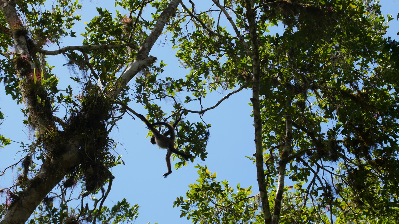 Mystischer Nebel umgibt uns, als wir die Hauptwege verlassen und über schmale Dschungelpfade wandern. “My friends...” beginnt unser Guide Lloyd jeden seiner Sätze. Immer wieder unterbricht er seinen Vortrag, um uns auf Dschungelbewohner aufmerksam zu machen. In der Frühe des Morgens begegnen uns tapsige Nasenbären (pisotes), eine Art felliges Waldschein, sich von Baum zu Baum schwingende Klammeraffen mit spinnenartigen Armen und Beinen (daher deren englischer Name “spider monkeys”), Kolibris und viele weitere exotische Vögel.