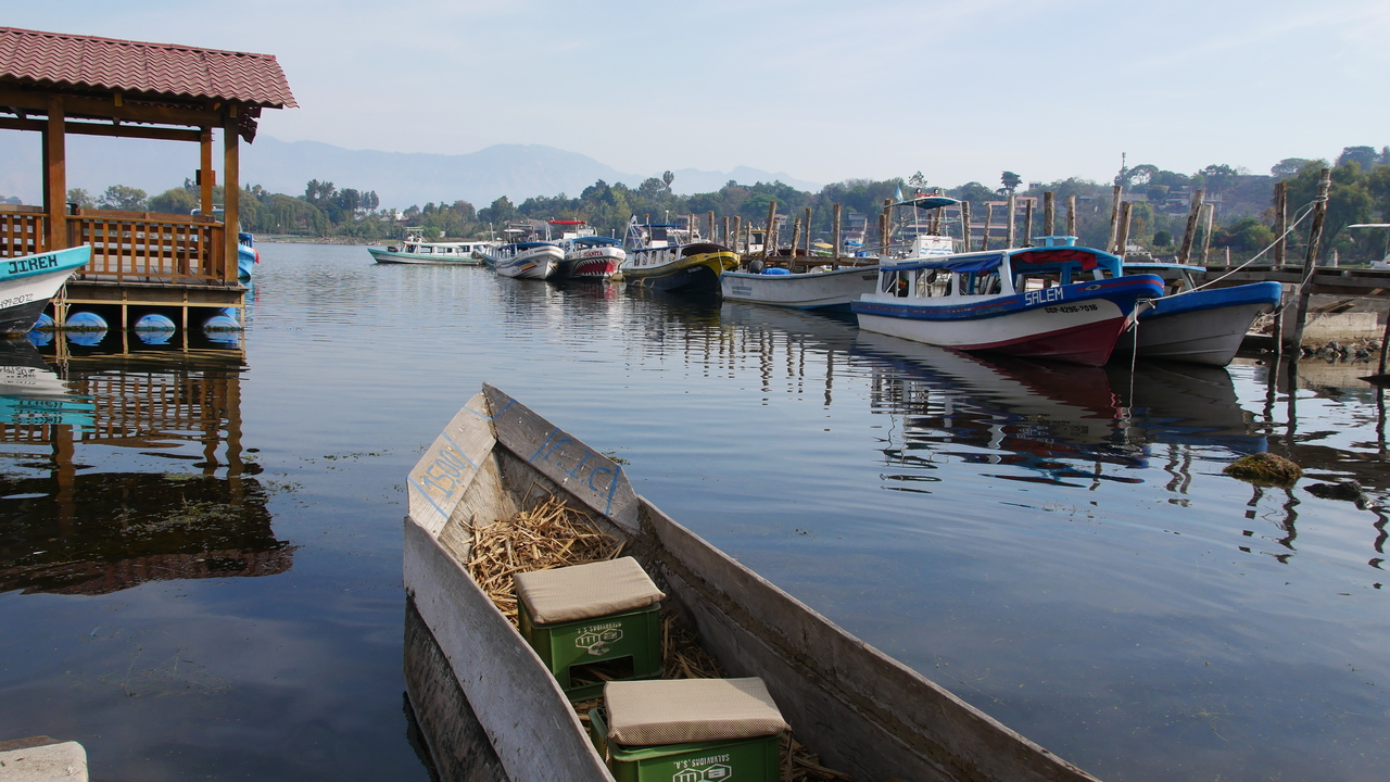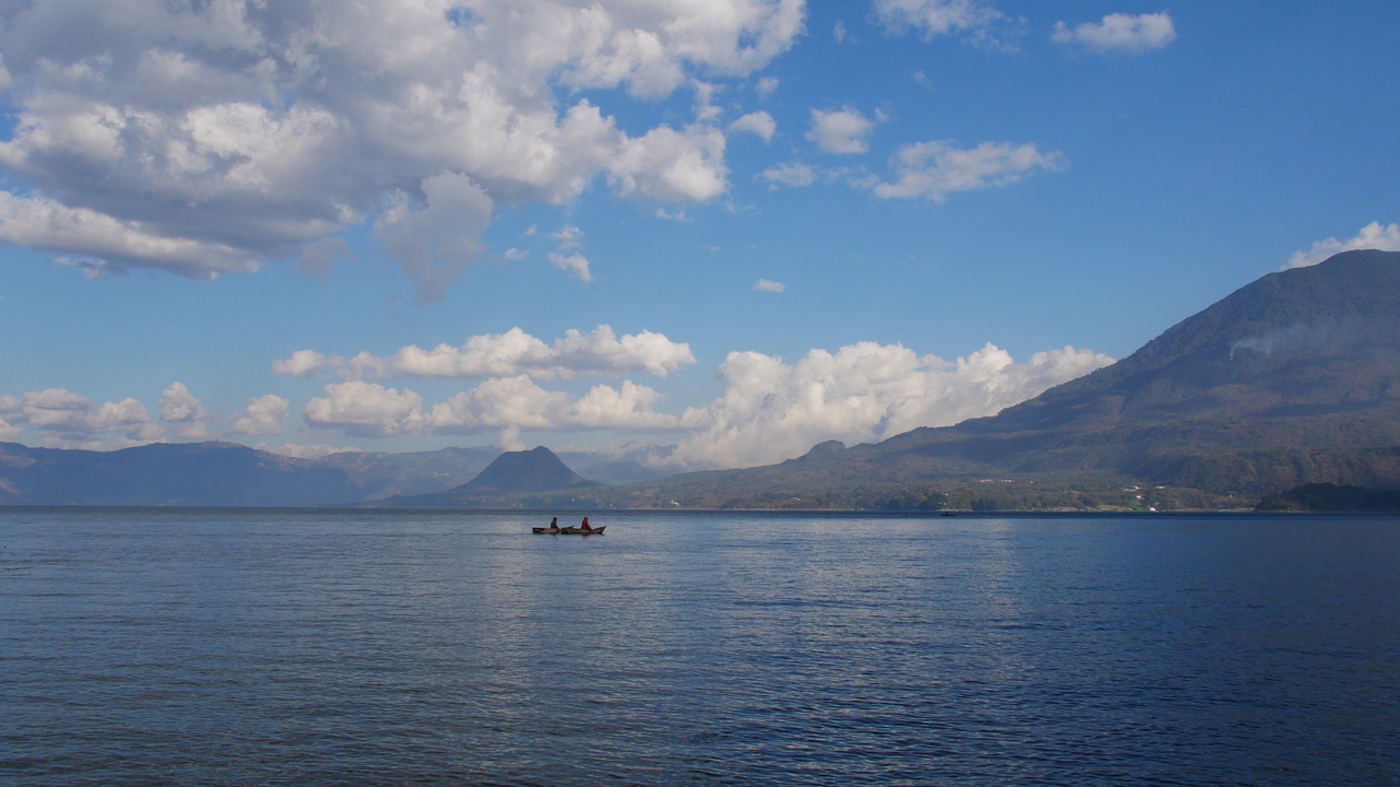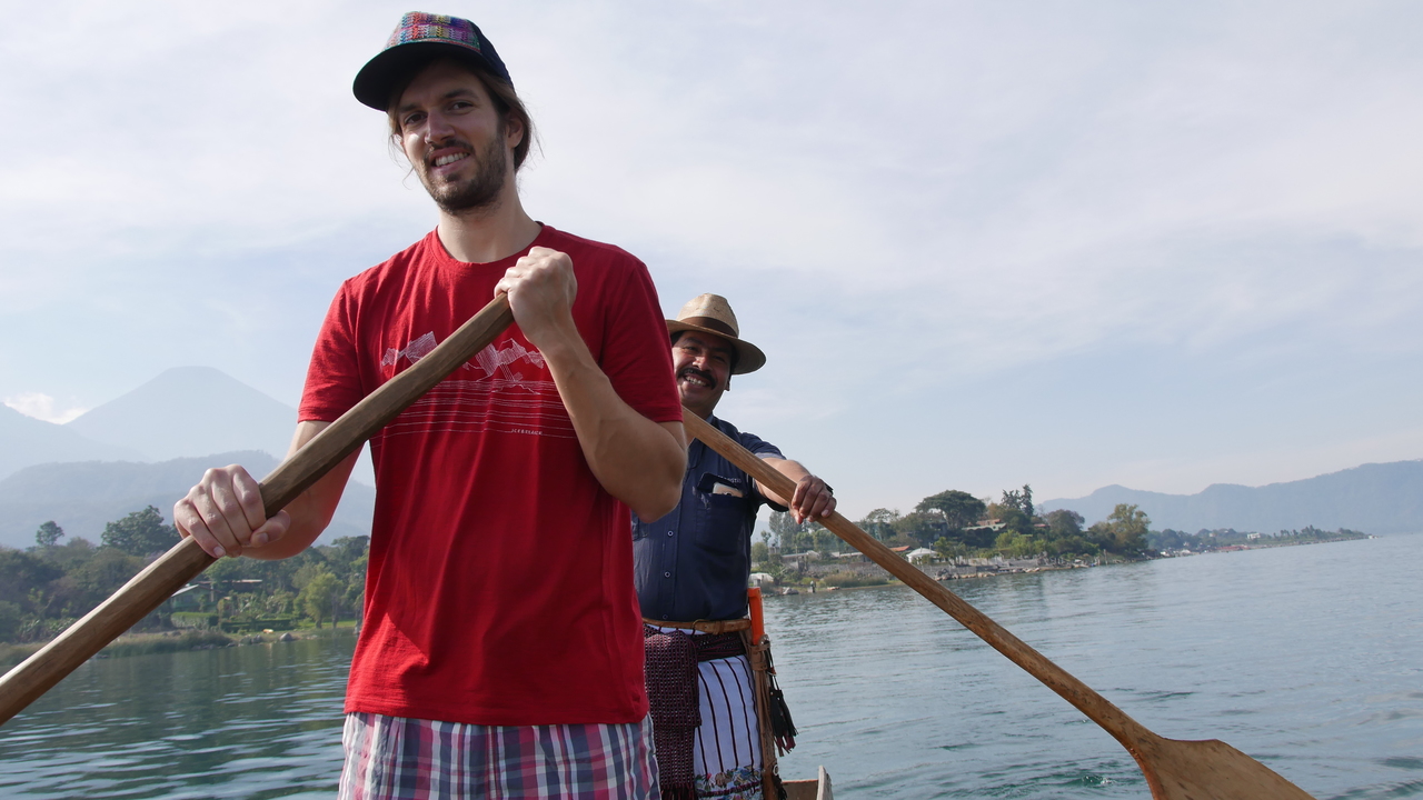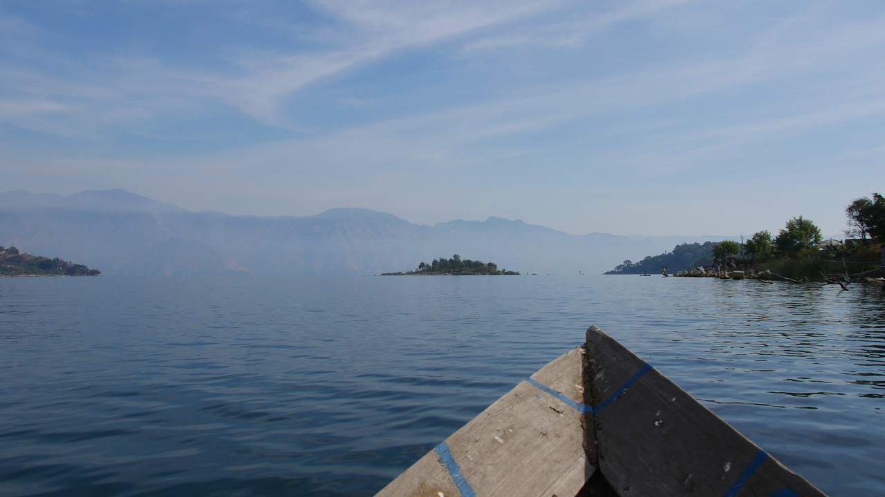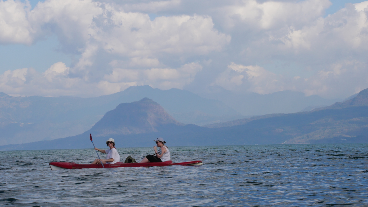 Berge, Vulkane und Wolken spiegeln sich im See. Fischer grüßen uns aus ihren hölzernen Bötchen. Wir paddeln mit Amélie in zwei Kajaks von San Pedro in Richtung Santiago, wo wir einen kleinen Strand ansteuern. Als wir wieder aufbrechen, fließt Wasser aus dem Inneren des Doppelkajaks in den Fußraum. Das hätte uns stutzig machen können. Wir sind noch nicht lange unterwegs - „Anna. Something‘s wrong.“ Amélie sitzt hinten im Kajak und ist nicht mehr weit von der Wasseroberfläche entfernt. Wir sinken! Und Rettungswesten haben wir natürlich keine bekommen. Wir signalisieren Max unser Problem per Pantomime, dann paddeln wir mit voller Kraft ans Ufer. Wobei wir eine beeindruckende Geschwindigkeit erreichen.