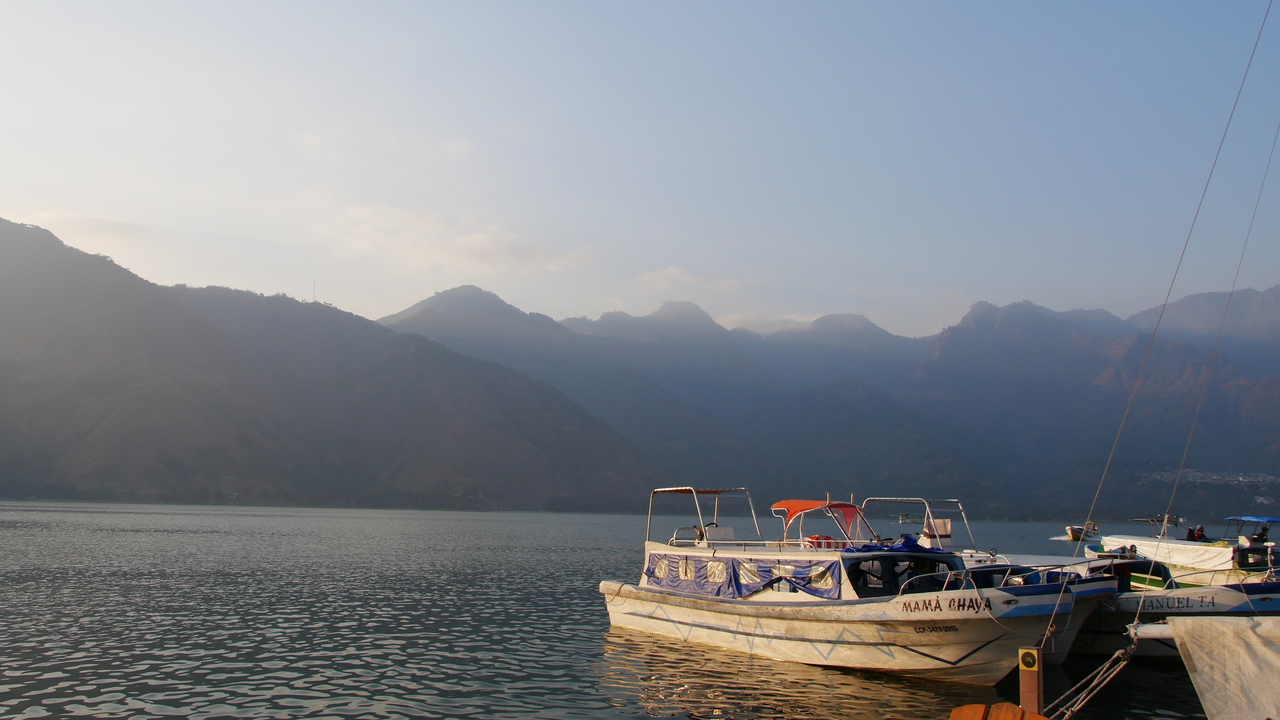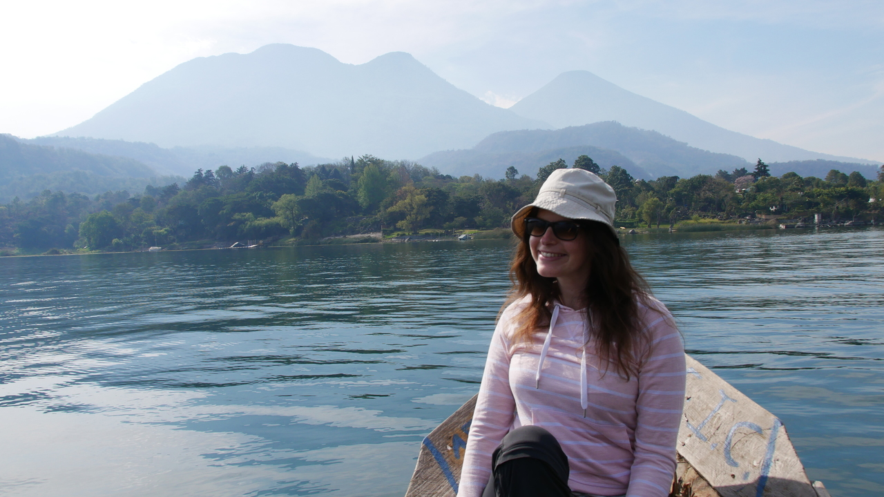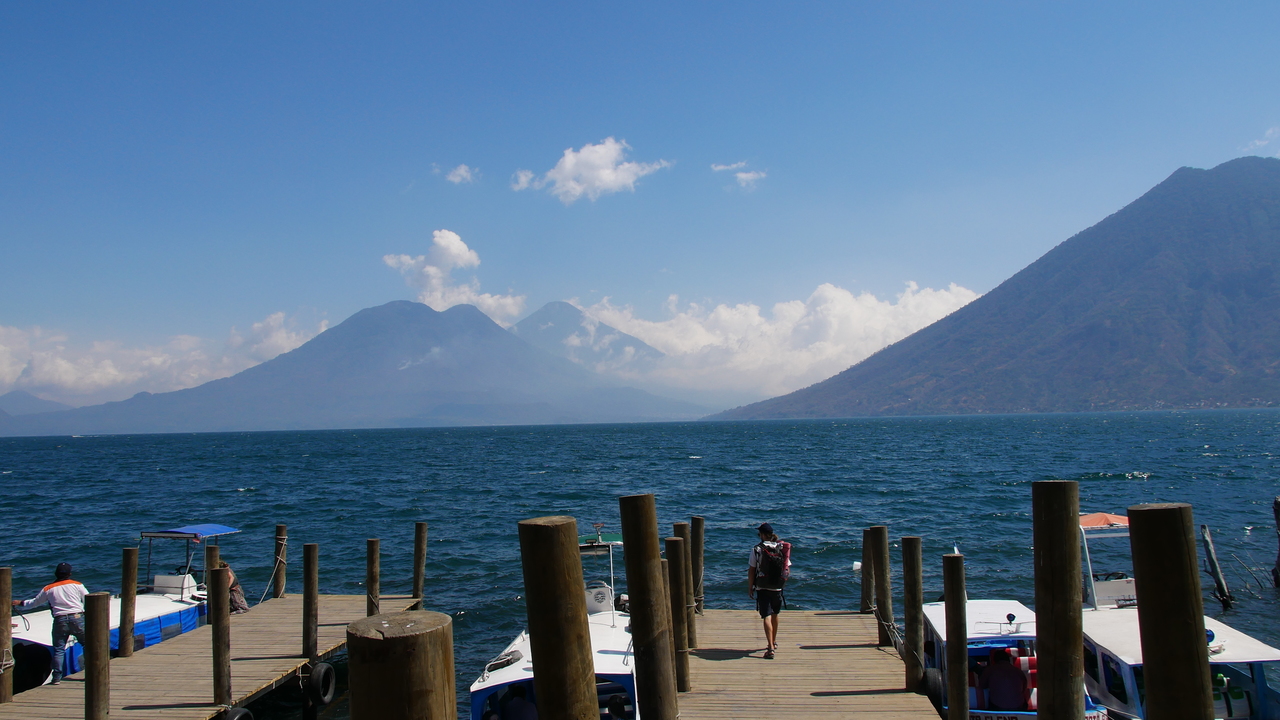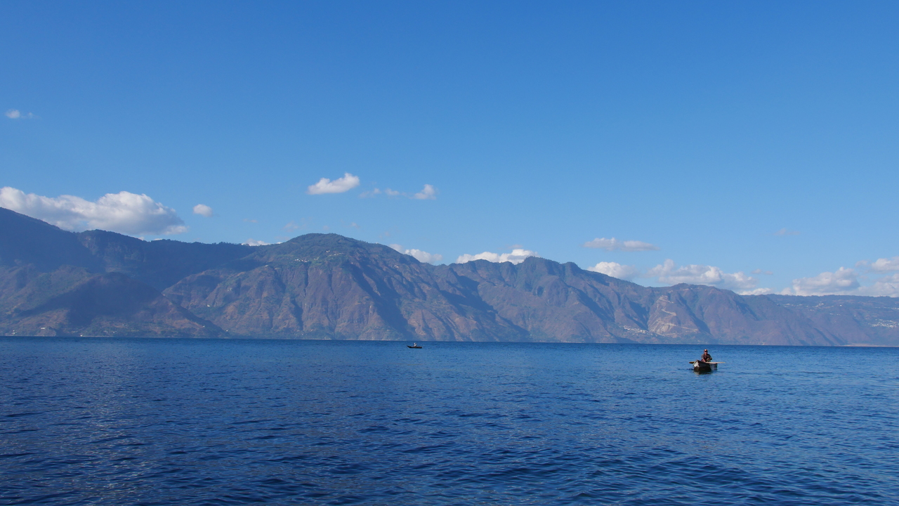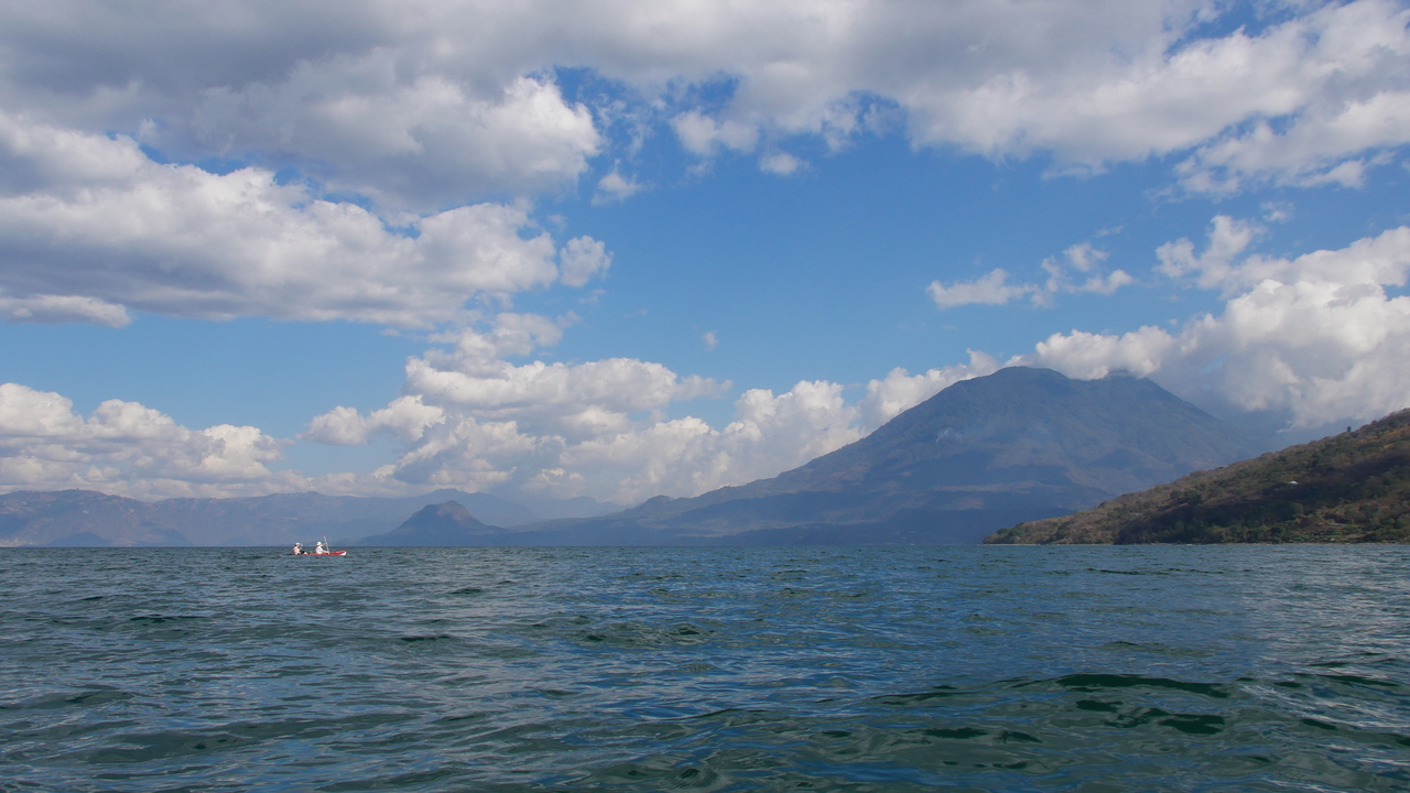 Berge, Vulkane und Wolken spiegeln sich im See. Fischer grüßen uns aus ihren hölzernen Bötchen. Wir paddeln mit Amélie in zwei Kajaks von San Pedro in Richtung Santiago, wo wir einen kleinen Strand ansteuern. Als wir wieder aufbrechen, fließt Wasser aus dem Inneren des Doppelkajaks in den Fußraum. Das hätte uns stutzig machen können. Wir sind noch nicht lange unterwegs - „Anna. Something‘s wrong.“ Amélie sitzt hinten im Kajak und ist nicht mehr weit von der Wasseroberfläche entfernt. Wir sinken! Und Rettungswesten haben wir natürlich keine bekommen. Wir signalisieren Max unser Problem per Pantomime, dann paddeln wir mit voller Kraft ans Ufer. Wobei wir eine beeindruckende Geschwindigkeit erreichen.