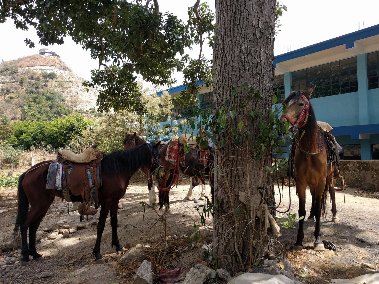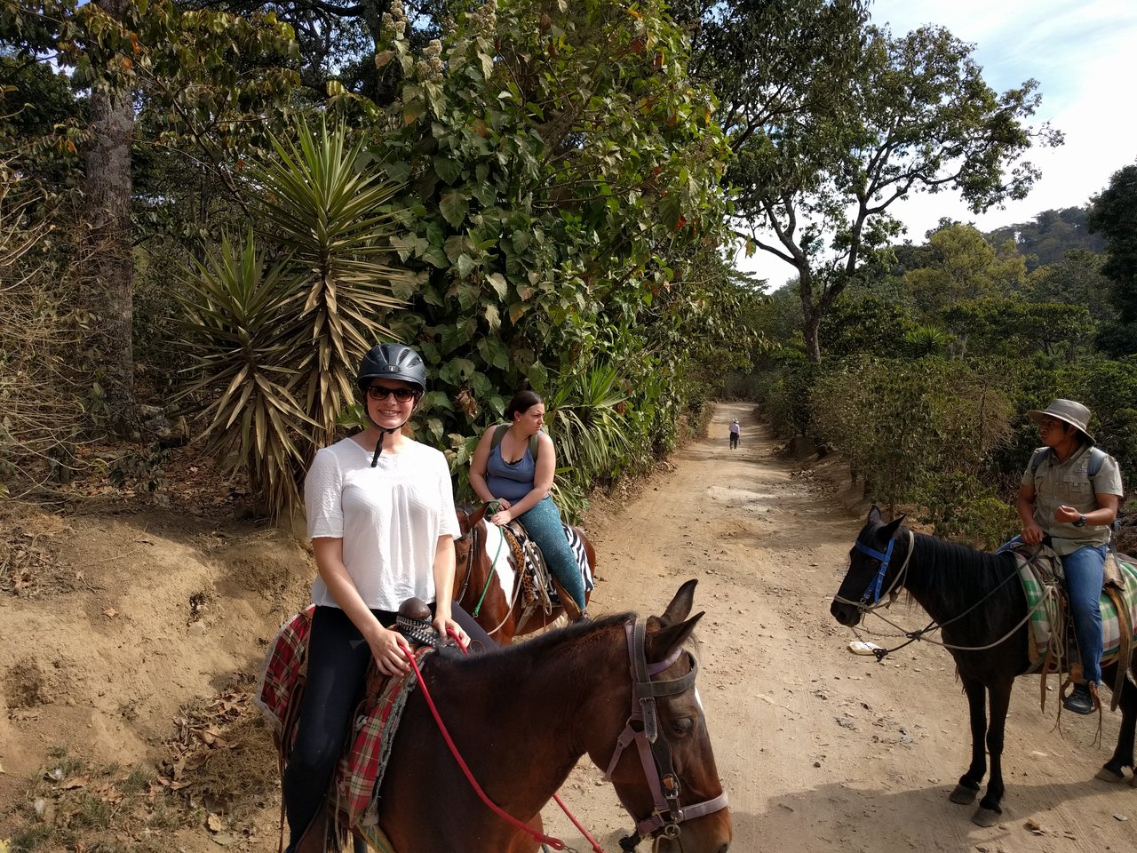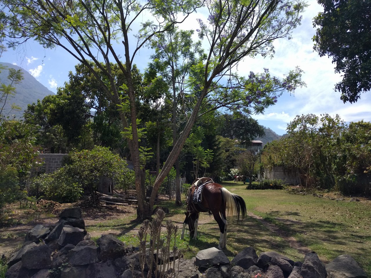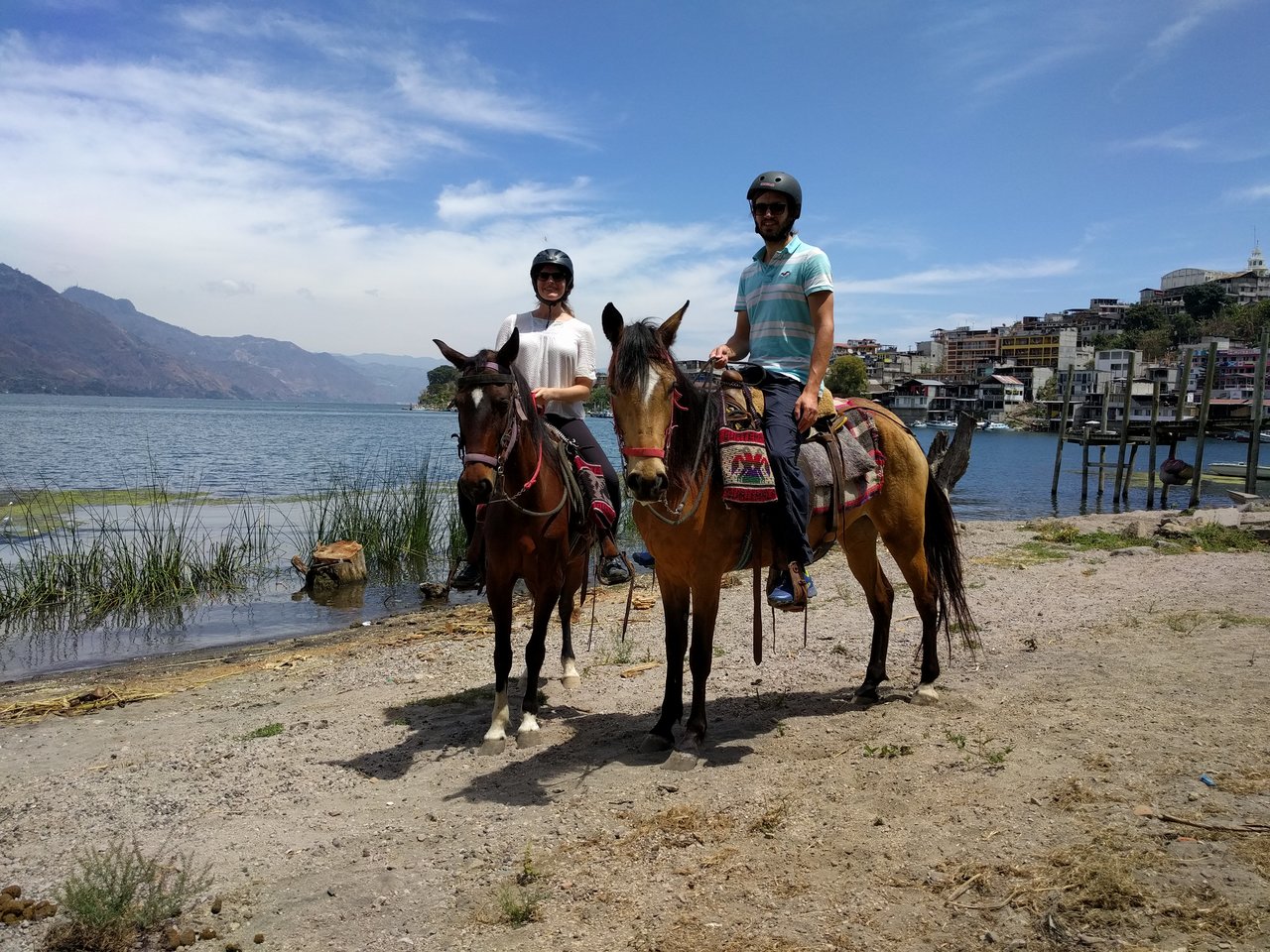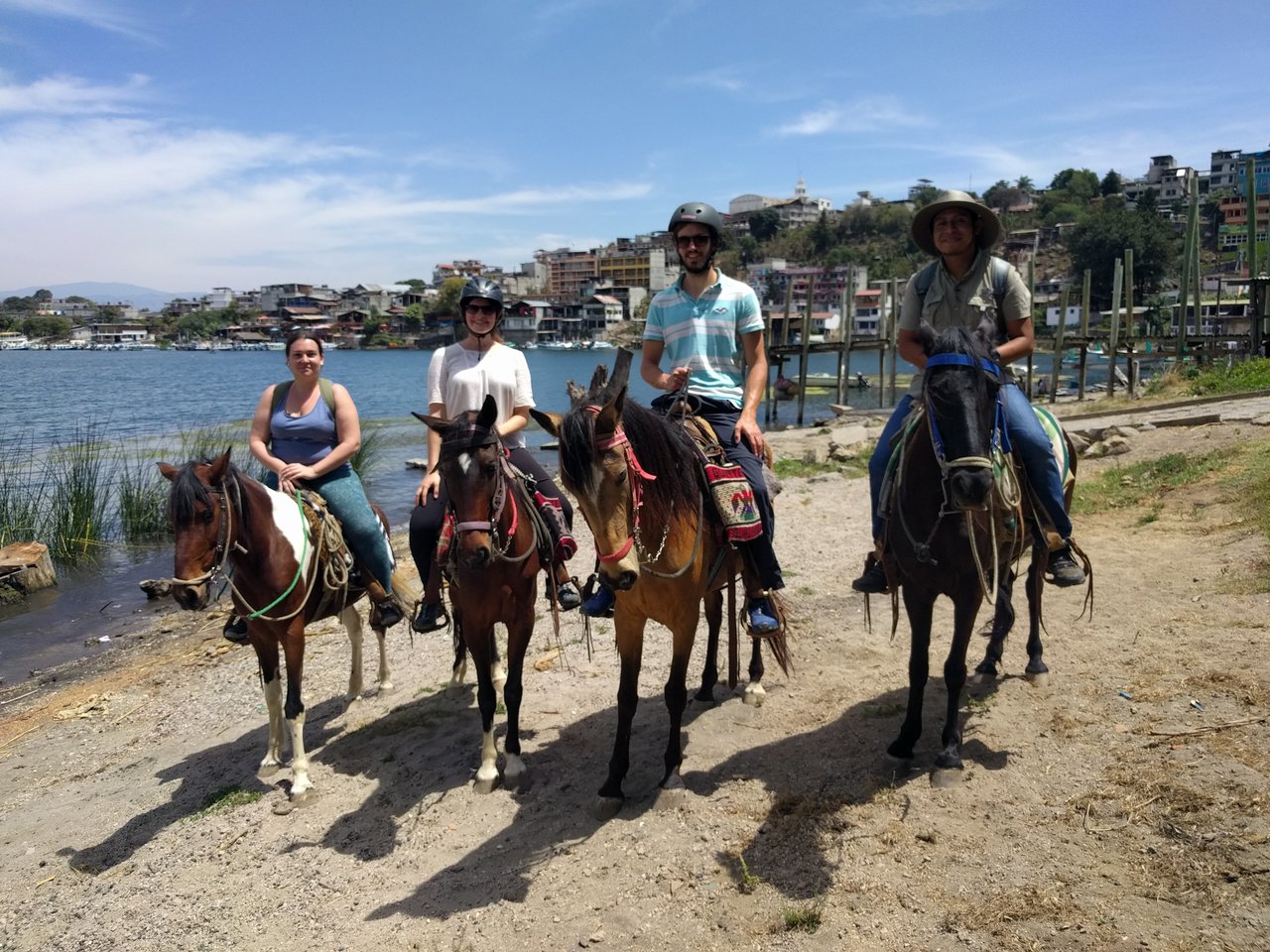 Über Stock und Stein reiten wir steile, gewundene Pfade am See entlang. Durch Wälder und Kaffeeplantagen geht es nach San Juan la Laguana, eins der malerischsten Dörfer am Lago de Atitlán. Unsere Pferde Ramba, Princesa und Paloma sind trittsicher und gut ausgebildet. Unser Guide Salvador ist freundlich zu uns und den Pferden, der Begleit-Guide José hängt dagegen schief auf seinem Pferd, das er immer wieder malträtiert und einmal auch Amélies Pferd einen Hieb versetzt, was sie gar nicht gut findet.