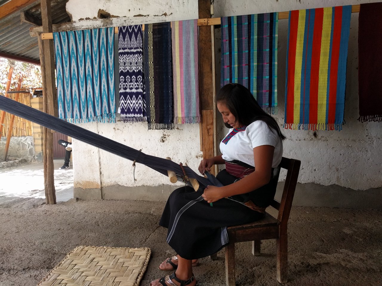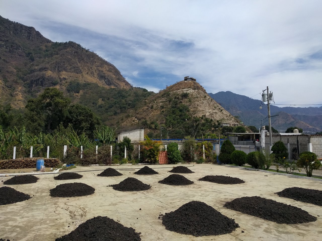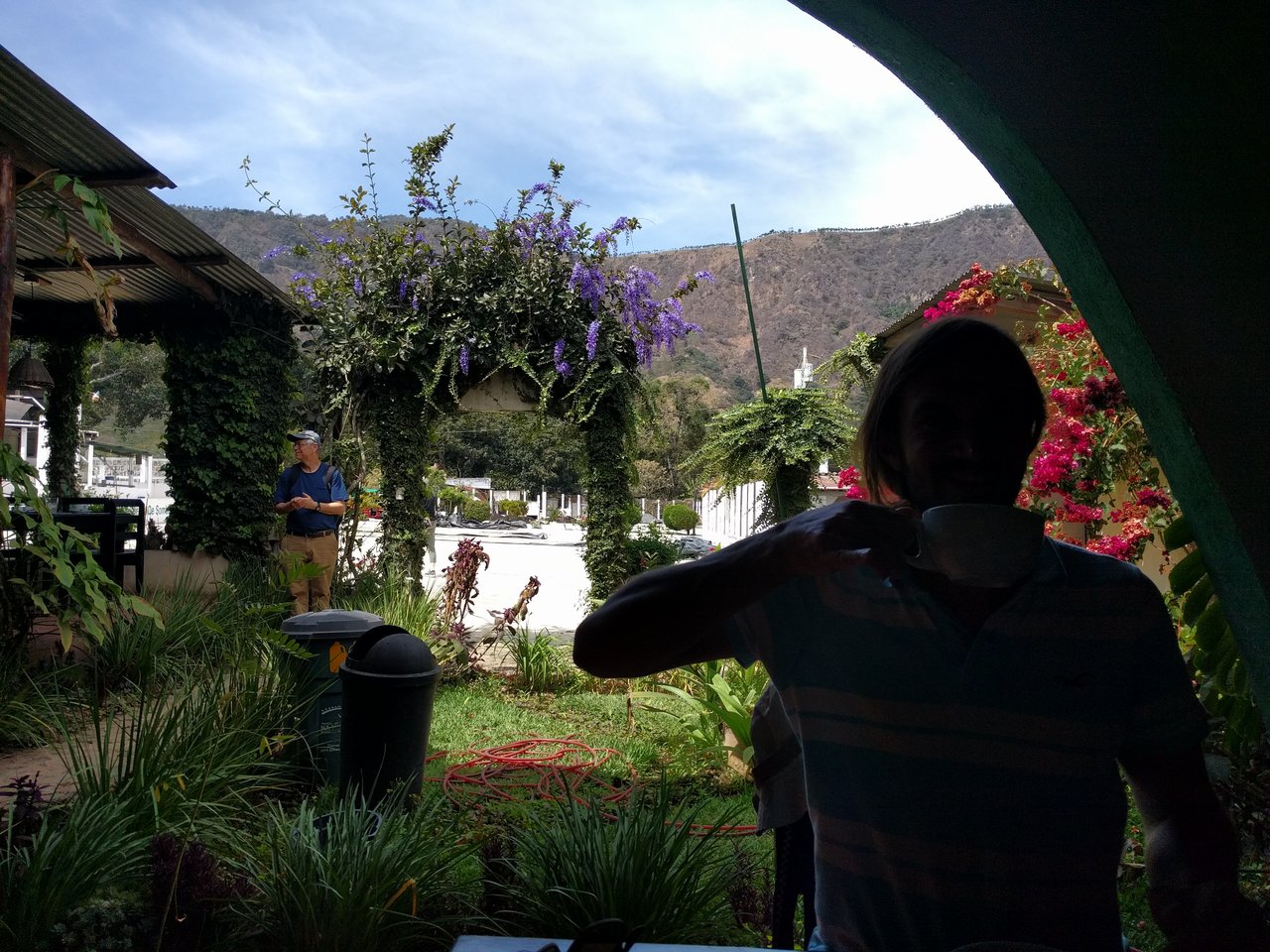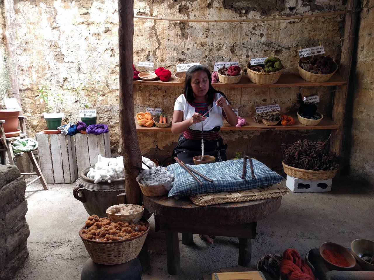 Von Salvador erfahren wir, dass der guatemaltekische Kaffee eine besonders hohe Qualität hat, da der Lavaboden sehr nährreich ist und in Guatemala die Kaffeebohnen erst geerntet werden, wenn sie rot und damit wirklich reif sind. Wir probieren ein paar Kaffeebohnen, die unter der roten Schale fruchtig schmecken. In einer Genossenschaft zur Kaffeeverarbeitung lernen wir die Verarbeitungsschritte der Bohnen kennen, von der Ernte bis zum Rösten der grün-gräulichen inneren Kaffeebohnen, die hier „oro“ (Gold) genannt werden. Hier kosten wir Kaffee, der stark und kaum bitter schmeckt, und leckeren Kaffee-Bananenkuchen. Traurig aber wahr: die Schulferien liegen in Guatemala so, dass die Kinder der Bauern von Oktober bis Dezember bei der Ernte mithelfen können. Abschließend besuchen wir die Webergenossenschaft Casa de Tejido, wo eine junge Dame uns näher bringt, wie aus der Baumwolle die Fäden gesponnen, gefärbt und gewoben werden. Witzigerweise meint diese, Anna sehe der spanischen Königin Letitia zum Verwechseln ähnlich. Soso ...