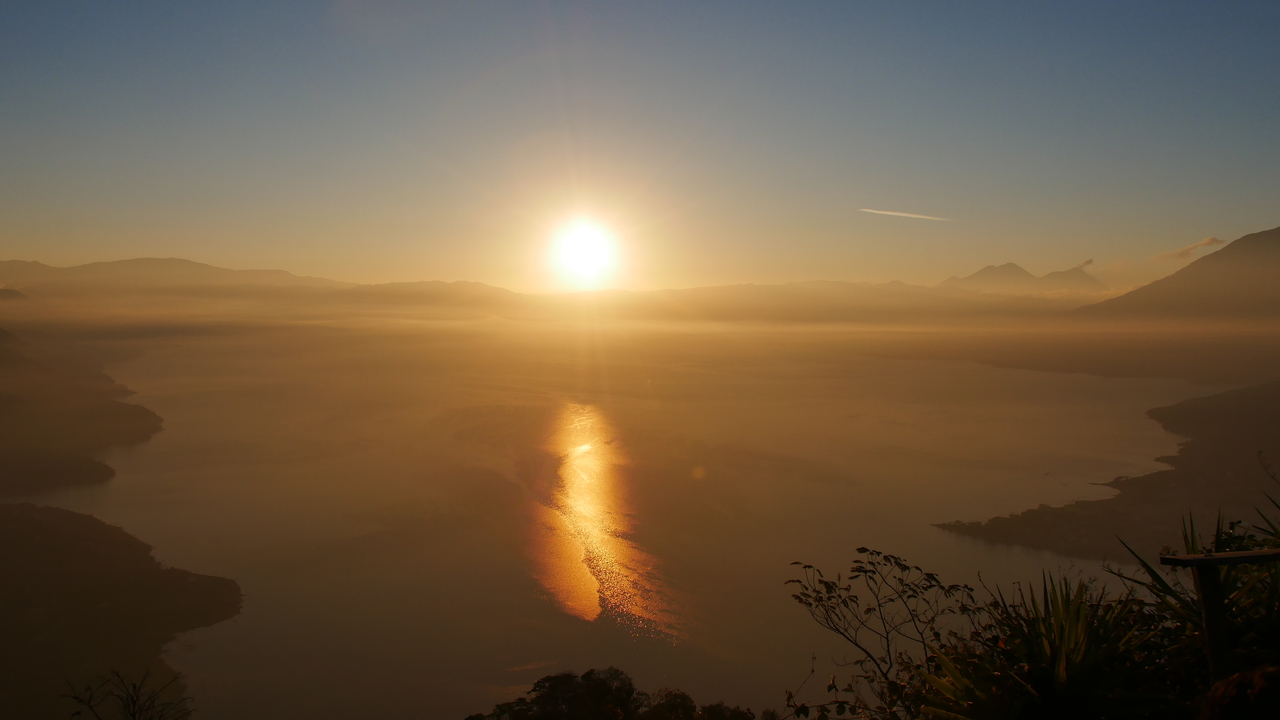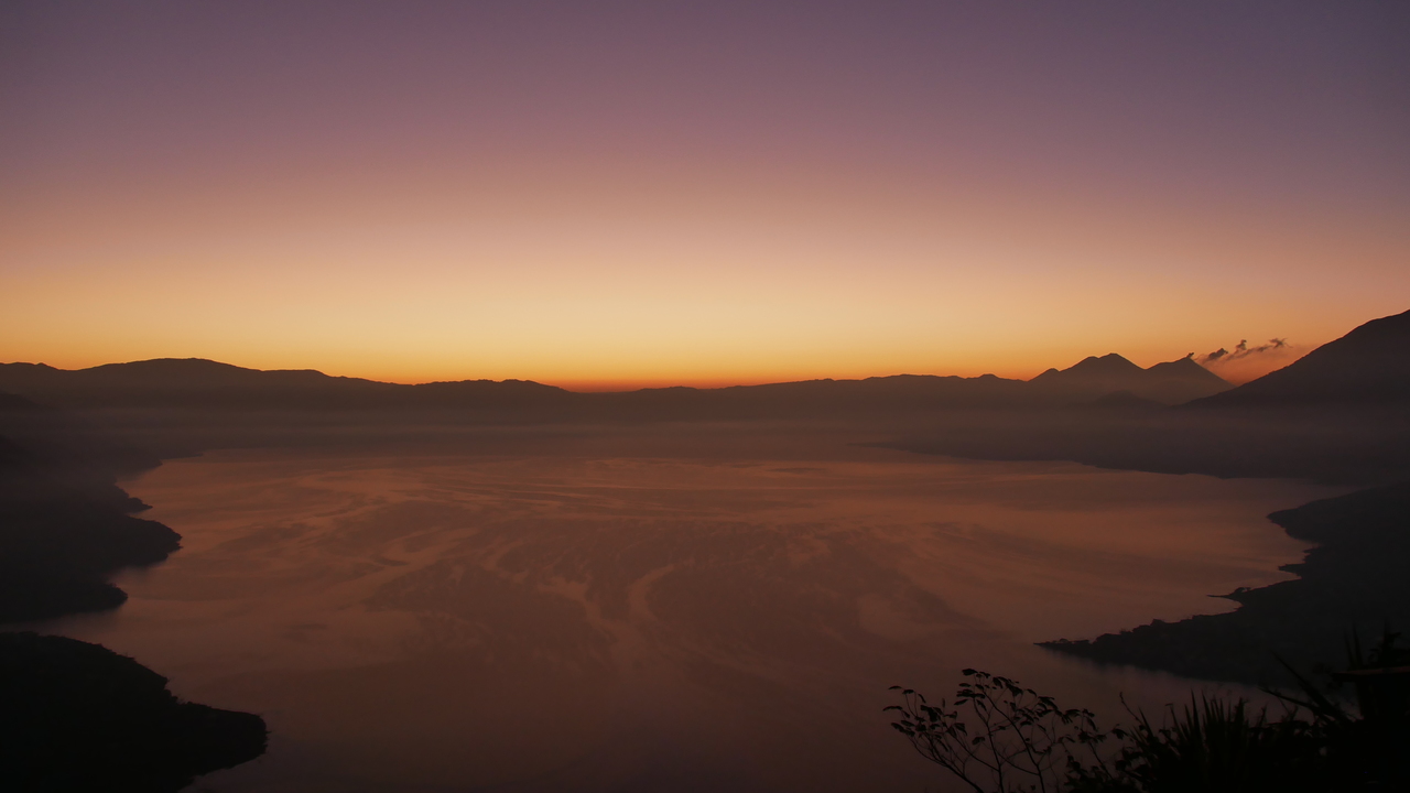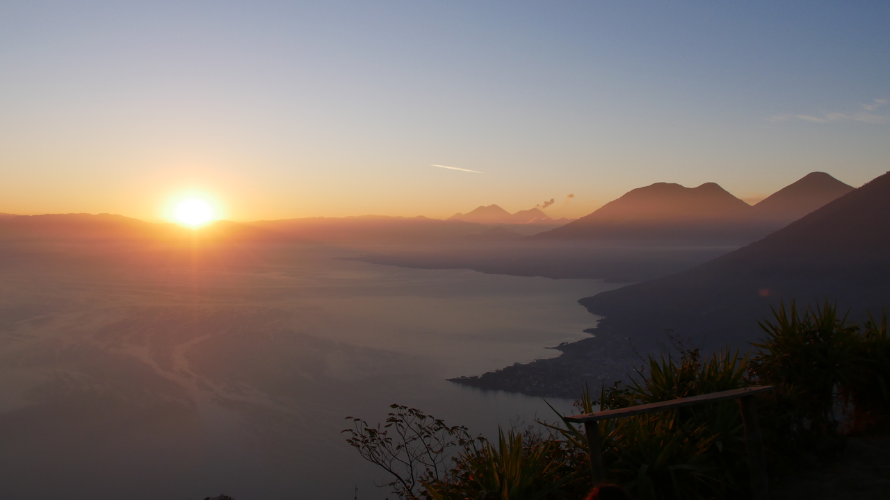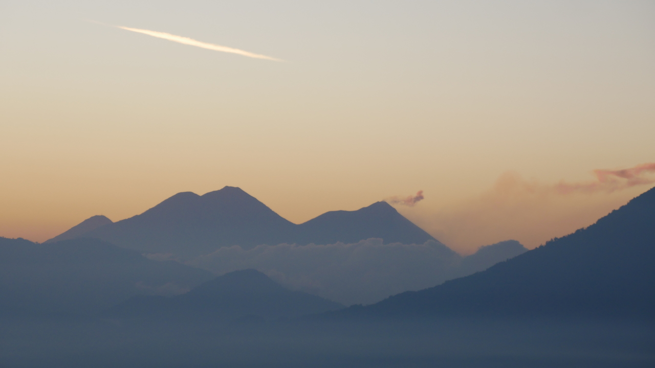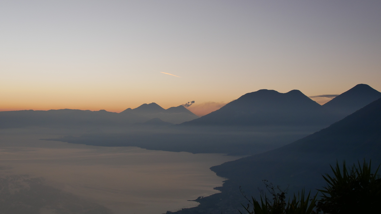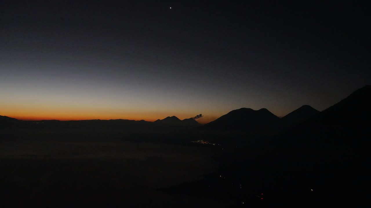 Steil geht es den Berg namens Rostro Maya („Indian Nose“) hinauf, teils über Leitern. Vom Lago aus betrachtet, gleicht der Berg einem menschlichen Profil, genauer einem Vorfahren der lokalen Maya. Nicolas erzählt uns, dass viele Fischarten seit der Einführung größerer Fische aus den USA im Lago verdrängt wurden und dass viele der hier lebenden Bauern seit dem Verfall des Kaffeepreises ein härteres Leben führen. Die Kirchen versprechen ein besseres Leben in der Zukunft. Nicolas gehört zu den wenigen, die dies für eine naive Lüge halten. Er wirkt gebildet, aufgeklärt, aber auch etwas depressiv. Obwohl es noch nahezu stockdunkel ist, zeichnen sich die Berge und Vulkane schon am Horizont ab und Fuego spuckt immer wieder Rauchwölkchen in den Himmel.