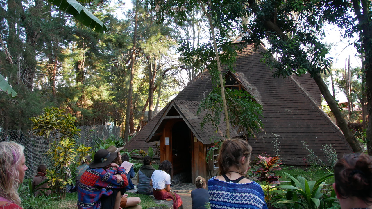 Im Yoga Forest nehmen wir an einer fortgeschrittenen Yogastunde auf einer runden, überdachten Holzplattform teil, von der wir den dichten Wald und den See in der Ferne überblicken können. Wir schnuppern auch in eine Einheit zu Meditationstechniken in den „Pyramids de Ká“ hinein, die Teil eines mehrwöchigen Retreats ist. Dass es sich dabei um eine Orakel-Meditation handeln würde, wussten wir nicht. Über einem unterirdischen Gang betreten wir die große Pyramide aus Holz durch eine Klappe im Boden. Überall sind religiöse Symbole wie Engel, Jesus, Shiva, Davidsterne zu sehen und der Kerzenschein hüllt die Pyramide in ein mystisches Licht. Mit etwa zwanzig vor allem jungen Retreat_Teilnehmern meditieren wir, bis der Orakel-Part beginnt: reihum zieht jeder Teilnehmer in der Mitte der Pyramide je eine Orakel-Karte für die Bereiche Erde (physisch), Wasser (emotional), Luft (mental) und Feuer (spirituell). Dann versucht man, im Kerzenlicht den darauf genannten Erzengel und die sonstigen Botschaften zu entziffern und in Zusammenhang mit der eigenen Fragestellung zu bringen. Für unseren Geschmack dann doch zu abgespaced …