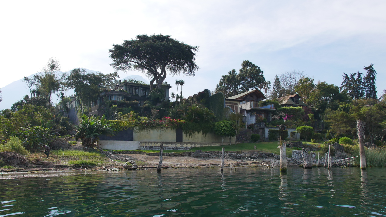 Sanft gleiten wir über den See, der in der Frühe des Morgens ruhig daliegt. Das hölzerne Cayuco ist mit Naturstoffen abgedichtet und für alle Fälle mit Holzspänen gefüllt. Max unterstützt Miguel beim Stehpaddeln, der ein Freund von Annas Gastfamilie ist. Wir passieren hübsche Gringo-Villen inmitten verwucherter Bäume und umrunden die Isla del Gato. Hier wurden früher unartige Katzen ausgesetzt, heute ist das Inselchen ein Rückzugsort für Vögel aller Art.