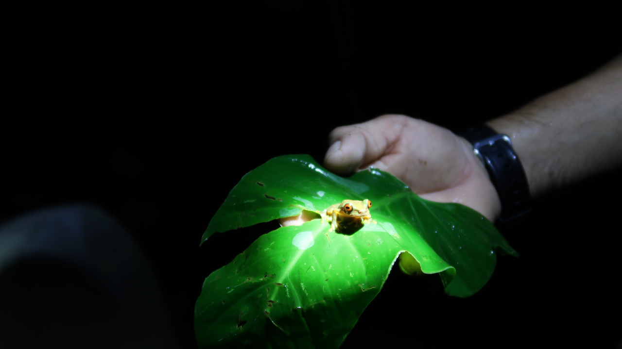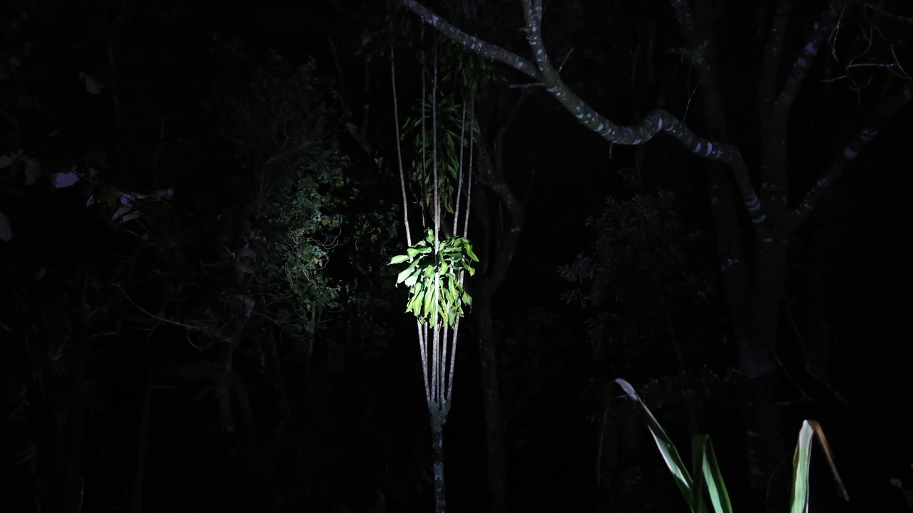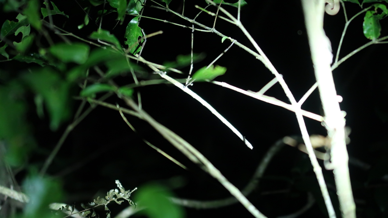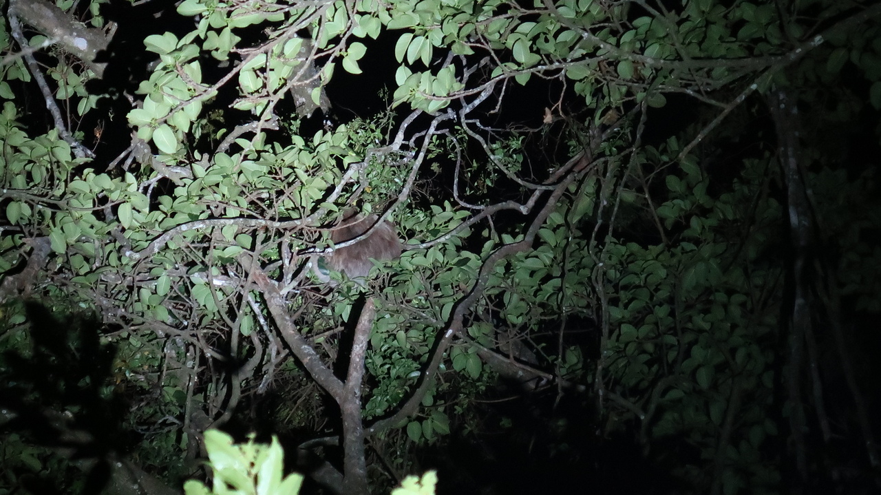 “Da oben hängt ein Faultier”, meint unser Guide Mario und deutet mit seiner Taschenlampe irgendwo weit oben ins Geäst. Etwas außer Atem treffen die übrigen unserer Gruppe ein. Mal wieder sind wir hastig durch den nächtlichen Nebelwald gehechtet, um ein wildes Tier zu sehen, von dem Mario übers Walkie Talkie erfahren hat. Vom Faultier sehen wir nur etwas braunes Fell, von einem Kingajou etwas schwarzes. Die Tiere sind zwar nacht-aktiv, hängen aber immer noch ziemlich weit oben ziemlich träge in den Bäumen ab. In einem Erdloch versteckt sich eine Tarantula mit orangenen Beinen, in einer kleinen Höhle eine Boa Constrictor, auf deren gemusterte Haut wir einen Blick werfen können. “Walking Sticks” sind kaum von Ästen zu unterscheiden und erinnern und an die Baummenschen bei Herr der Ringe. Einen rotäugigen Frosch findet Mario sogar selbst. Ansonsten scheinen ihm die anderen Guides der Kinkajou Night Tour in Erfahrung und Fachwissen weit überlegen zu sein. Dafür sind wir mit Abstand am sportlichsten im Wald unterwegs.