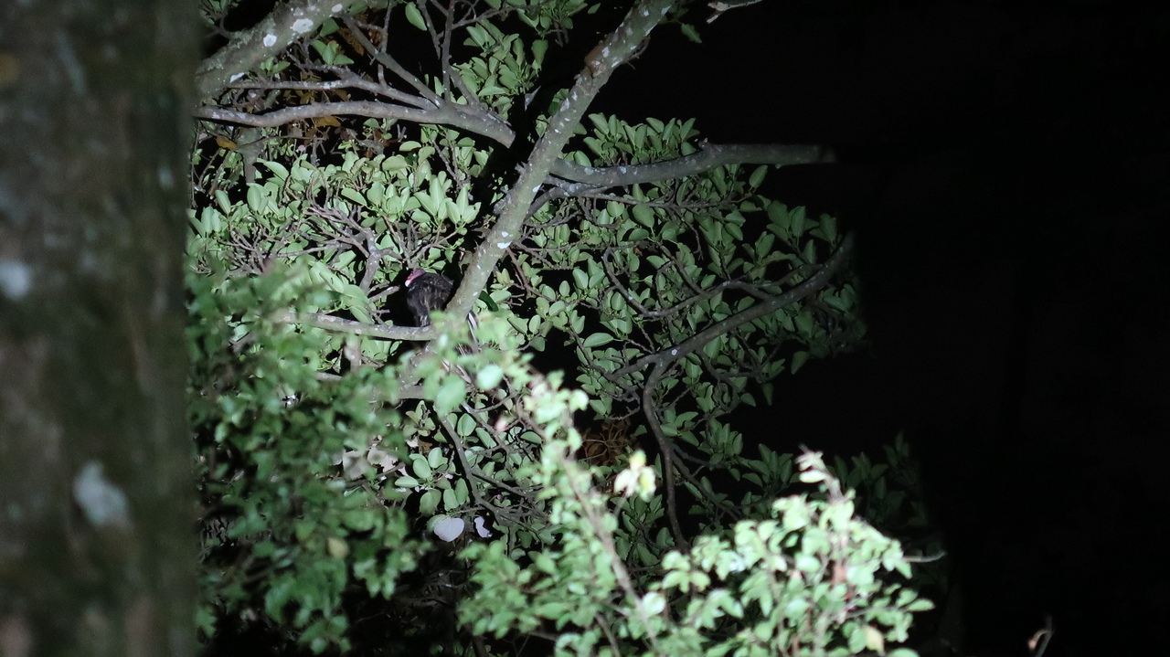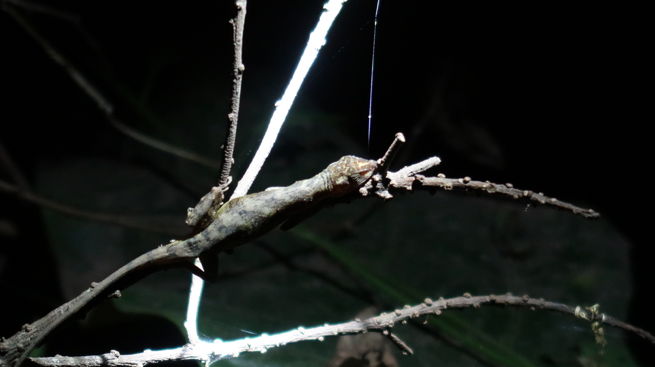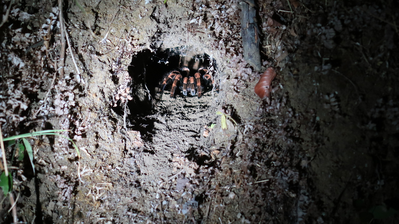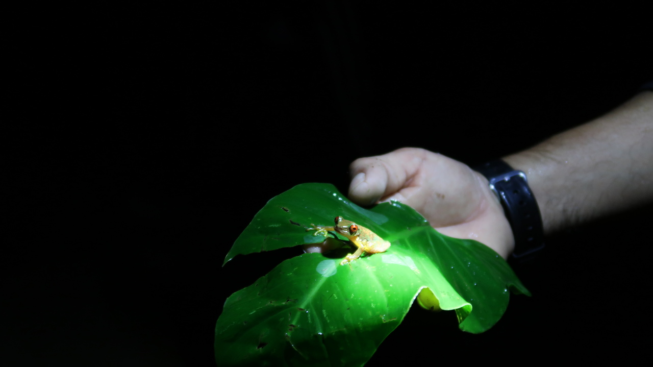 “Da oben hängt ein Faultier”, meint unser Guide Mario und deutet mit seiner Taschenlampe irgendwo weit oben ins Geäst. Etwas außer Atem treffen die übrigen unserer Gruppe ein. Mal wieder sind wir hastig durch den nächtlichen Nebelwald gehechtet, um ein wildes Tier zu sehen, von dem Mario übers Walkie Talkie erfahren hat. Vom Faultier sehen wir nur etwas braunes Fell, von einem Kingajou etwas schwarzes. Die Tiere sind zwar nacht-aktiv, hängen aber immer noch ziemlich weit oben ziemlich träge in den Bäumen ab. In einem Erdloch versteckt sich eine Tarantula mit orangenen Beinen, in einer kleinen Höhle eine Boa Constrictor, auf deren gemusterte Haut wir einen Blick werfen können. “Walking Sticks” sind kaum von Ästen zu unterscheiden und erinnern und an die Baummenschen bei Herr der Ringe. Einen rotäugigen Frosch findet Mario sogar selbst. Ansonsten scheinen ihm die anderen Guides der Kinkajou Night Tour in Erfahrung und Fachwissen weit überlegen zu sein. Dafür sind wir mit Abstand am sportlichsten im Wald unterwegs.