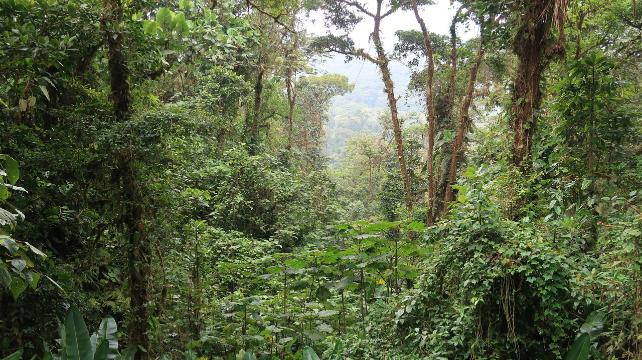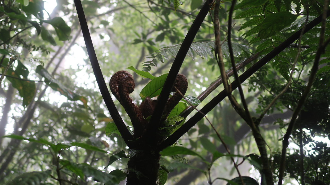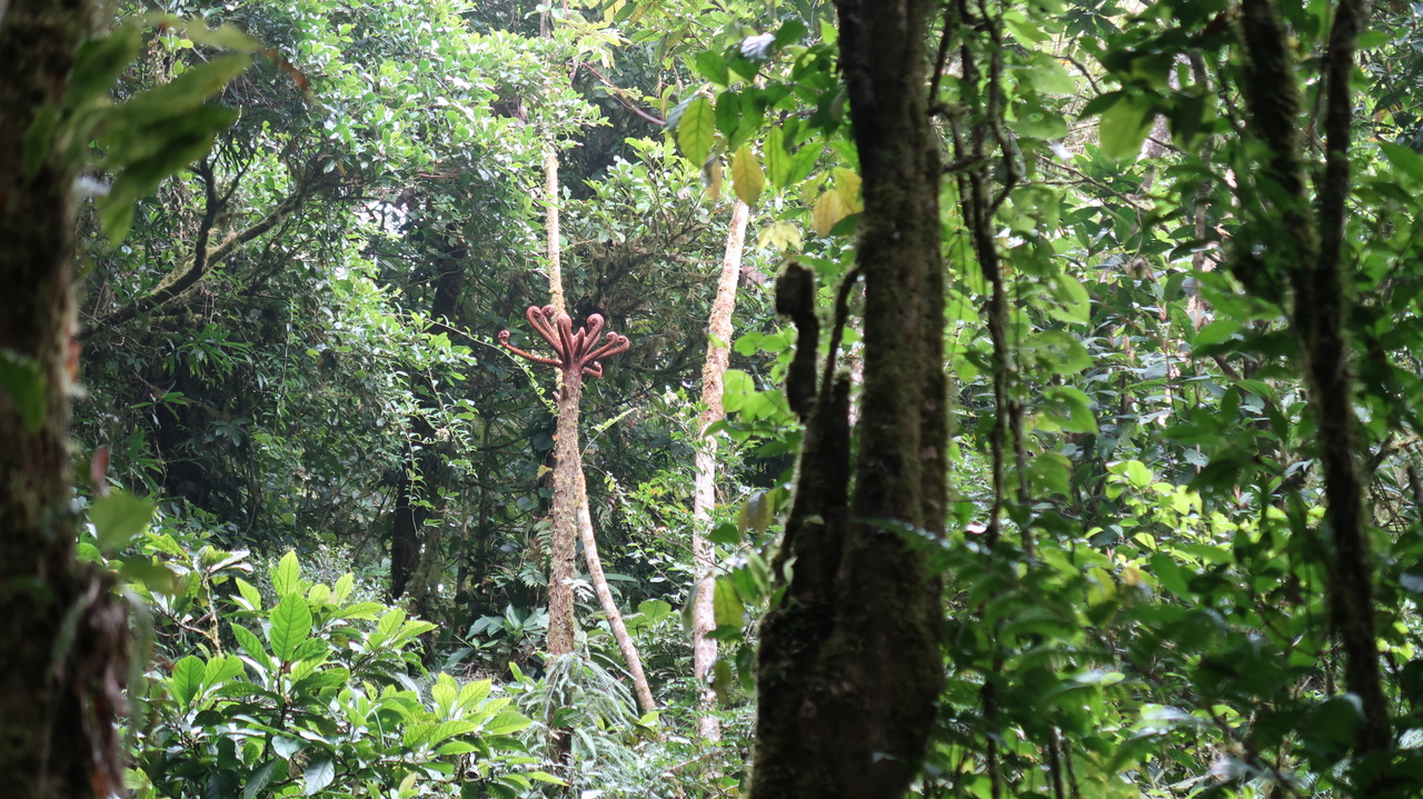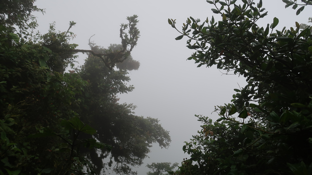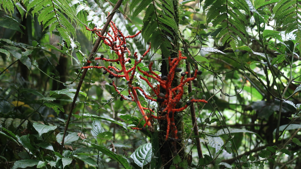 Imposanter und interessanter finden wir die Nebelwälder bei Tageslicht. Die morgendlichen Nebelschleier verwandeln sich ab und zu in Nieselschauer, als wir durch den zugewucherten Bosque Nuboso voller Mose, Flechten, gigantischer Lianen und Luftwurzeln wandern. Die Luft könnte frischer nicht sein und abgesehen vom Gezwitscher der Vögel und dem gelegentlichen Brüllen der Brüllaffen umgibt uns Stille. Wir treffen auf jede Menge exotische Tropenpflanzen, die geradezu dazu einladen, ihnen coole Namen zu geben – Coral Coffee zum Beispiel (offiziell “Mountain Corn”), rote Bush Berries, pinke Jungle Cherries und Farnbäume, die sich gerne mal in Alien-artige Calamares-Churros verwandeln.