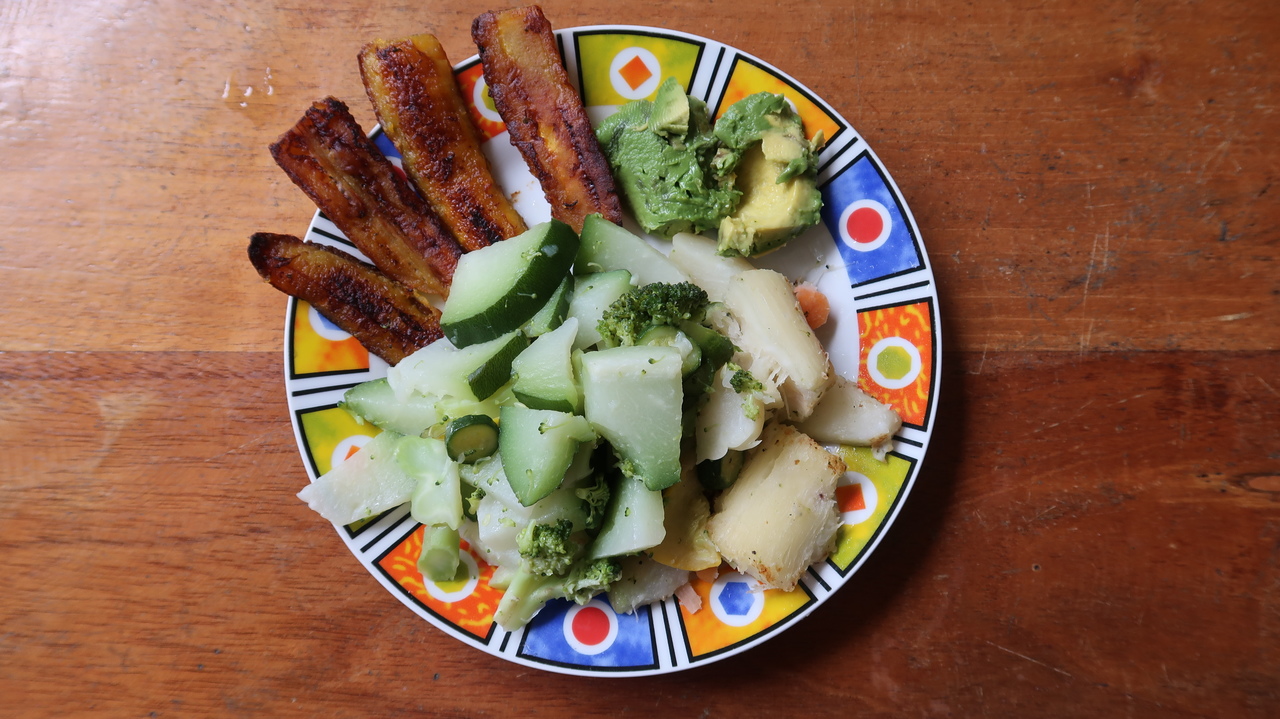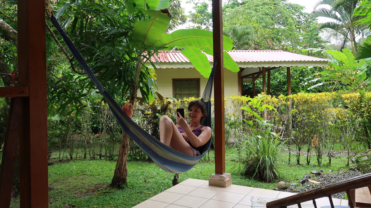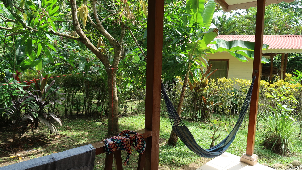 Noch vor Sonnenaufgang erwacht der Regenwald um uns herum zirpend, singend und brüllend. Da die kleine Bungalowanlage Luna Caribeña außerhalb des Orts und abseits der Straße liegt, sind wir hier auch tagsüber nur von den Geräuschen der Natur umgeben. Wie ein Wanderzoo schauen nach und nach Kolibris, Tukane, Agutis, riesige Grashüpfer, Tausendfüßler und Fledermäuse nach dem Rechten und ziehen weiter. Wir genießen es, eine Veranda mit Hängematte und Kochnische zu haben. So bereichern wir unser morgendliches Mango-Müsli mit Maracuja, Ananas und Papaya und kochen uns leckere Mahlzeiten – landesuntypisch mal ohne Reis und Bohnen, dafür mit Maniok, Chayote, Minikürbissen und gebratenen Kochbananen.