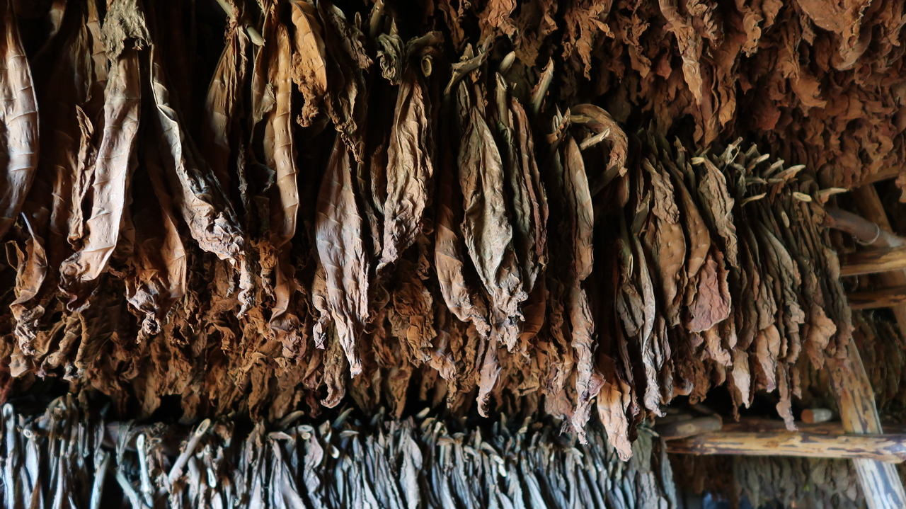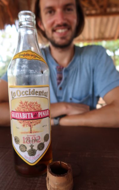 Unsere Pferde Rosillo und Caramelo sind trittsicher im Gelände, rangeln allerdings immer mal wieder um die Führerrolle. Da hilft es nicht, dass die meisten Touris ihre Pferde nicht im Griff haben und von den Guides keinerlei Reiteretiquette gelernt haben. Während einer Rast kosten wir Guayabita, den einzigen aus Guaven gewonnen Rum und sehen erstmals einen Guavenbaum. Ein starker Tabakgeruch umgibt uns in der Trockenkammer einer Zigarrenfarm, die voller brauner Blätter hängt. Hier zeigt uns ein ehemaliger Englischlehrer, wie Zigarren gedreht werden, während er und Max Puros paffen. Unser Zigarrenlehrer war schon in Deutschland und wir erfahren, dass Kubaner erst seit einigen Jahren ins Ausland reisen dürfen und hierfür eine spezielle Einladung benötigen.