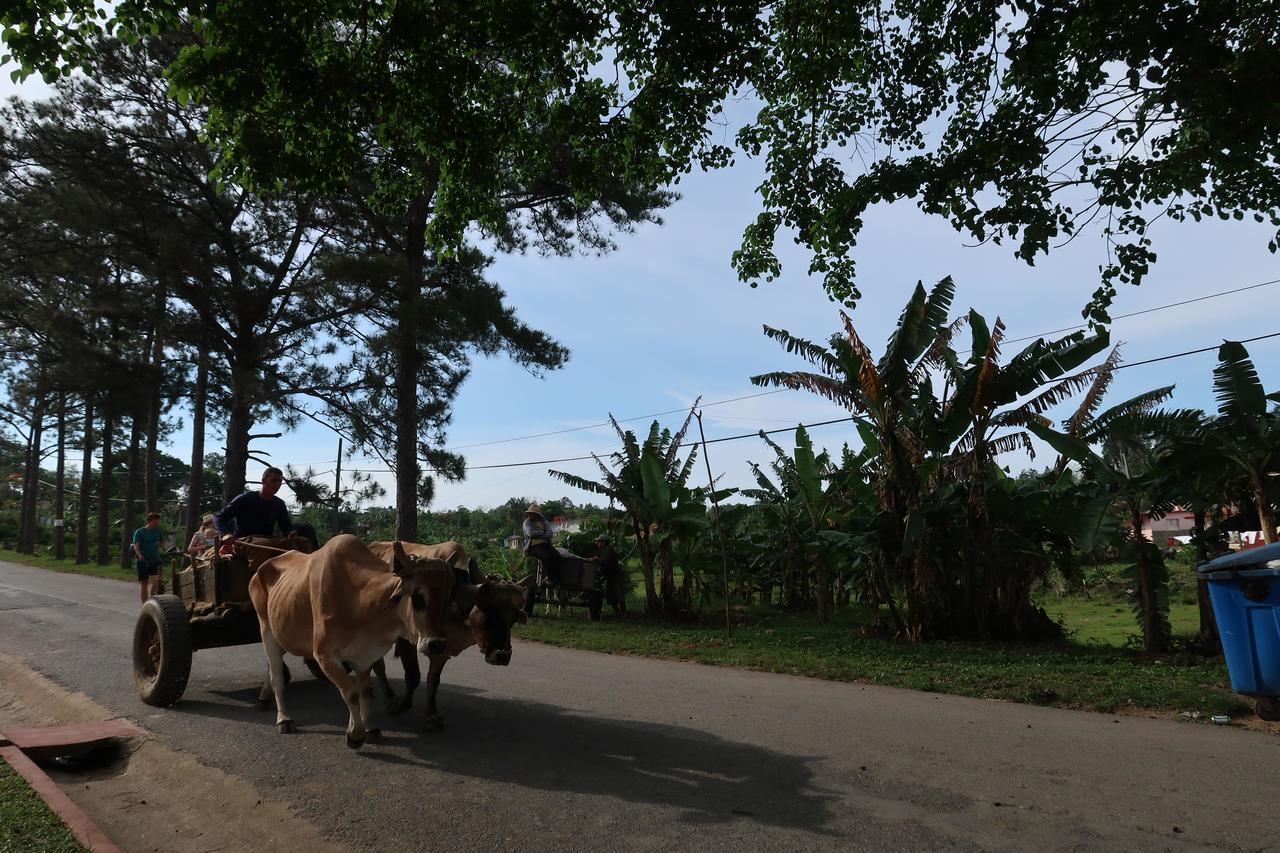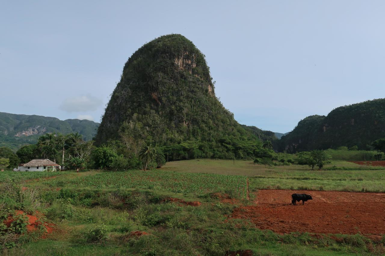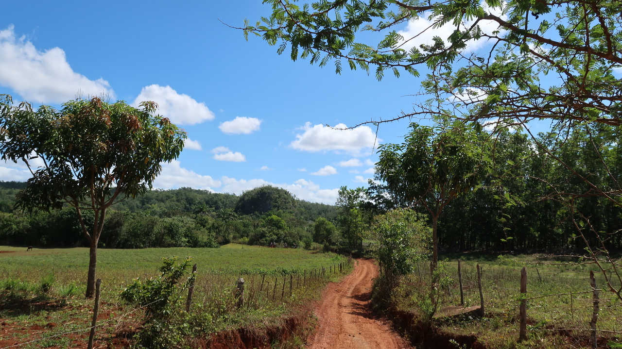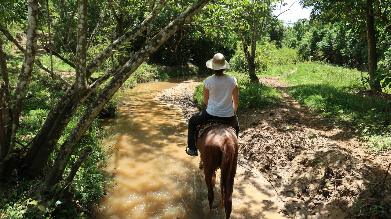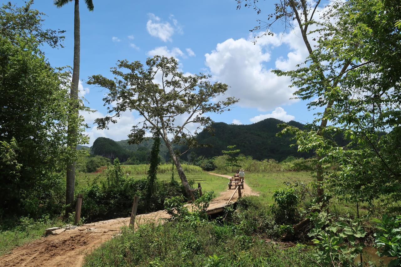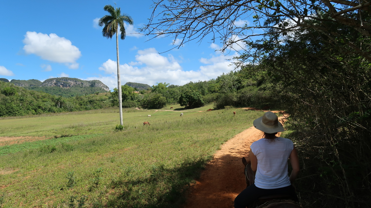 "Caballo", treibt der Kutscher das Pferd an, als er uns zu unseren Pferden bringt. Die Reitausrüstung stellt sich als authentisch kubanisch heraus: Helme gibt es genauso wenig wie verstellbare Steigbügel. Unser Guide Giovanni hat anfangs nicht einmal ein Pferd und stapft zu Fuß durch den Matsch, bis er mit dem Guide einer entgegenkommenden Gruppe tauscht. Wir reiten durch die idyllische Landschaft des Valle del Silencio - über rote Pfade und durch plätschernde Bachläufe, die sich durch saftige Wiesen zwischen schroffen Karstfelsen (mogotes) entlangschlängeln. Auf den Feldern wachsen Mais, Süßkartoffeln und Maniok, wobei die Maniokpflanzen wie Hanf aussehen, worauf uns Giovanni aufmerksam macht.