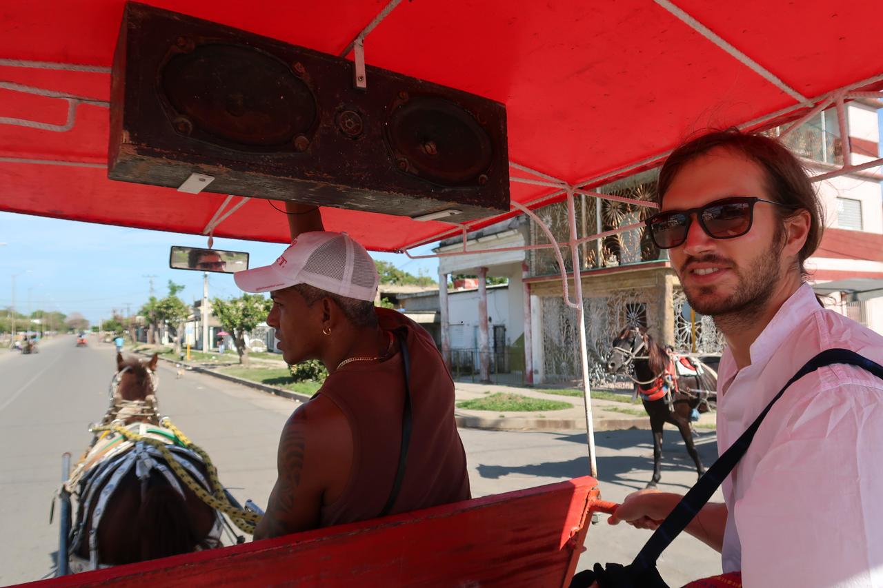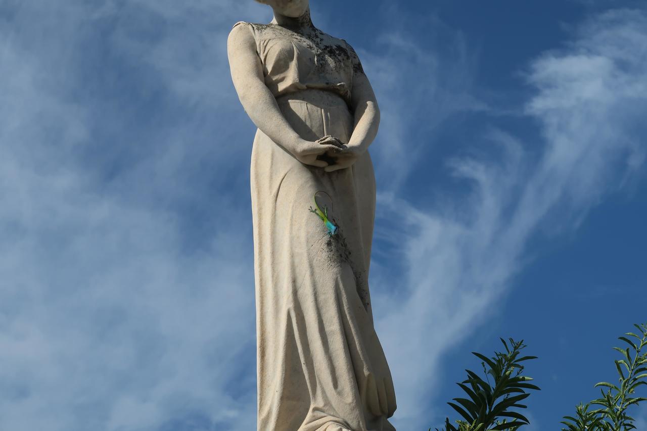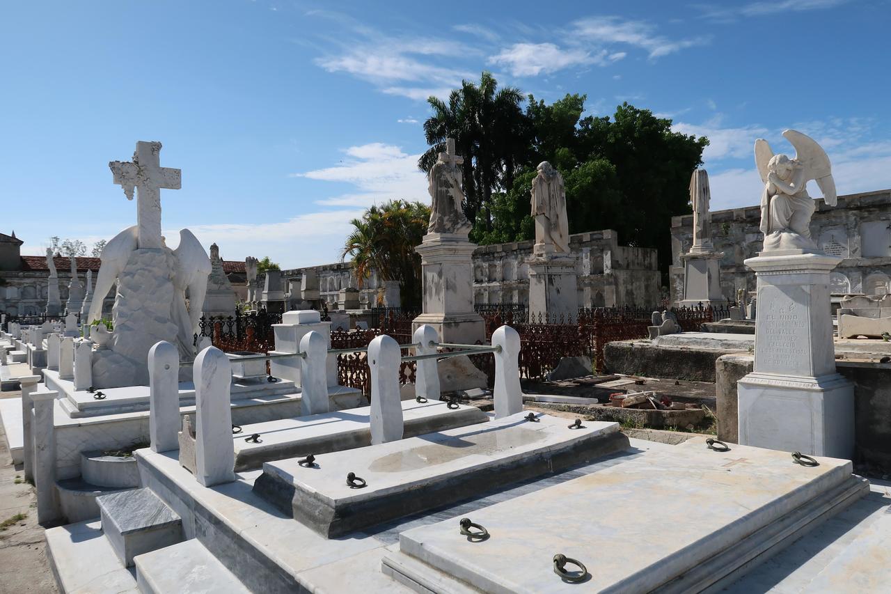 Per Pferdekutsche fahren wir durch den Slum-ähnlichen Vorort, während aus den Boxen schrille Latino-Musik dröhnt. Wie in Havanna sind viele der weißen Gräber auf dem Cementario de la Reina mit Engelsstatuen verziert. Auf einer sonnt sich gerade ein blau-grünes Chamäleon. Wegen des hohen Grundwasserspiegels sind die Gräber in Cienfuegos oberirdisch, so auch in den Friedhofsmauern. Auf der Rückfahrt bitten wir unseren Chauffeur, die Lautstärke der jetzt noch schrilleren Musik zu drosseln...