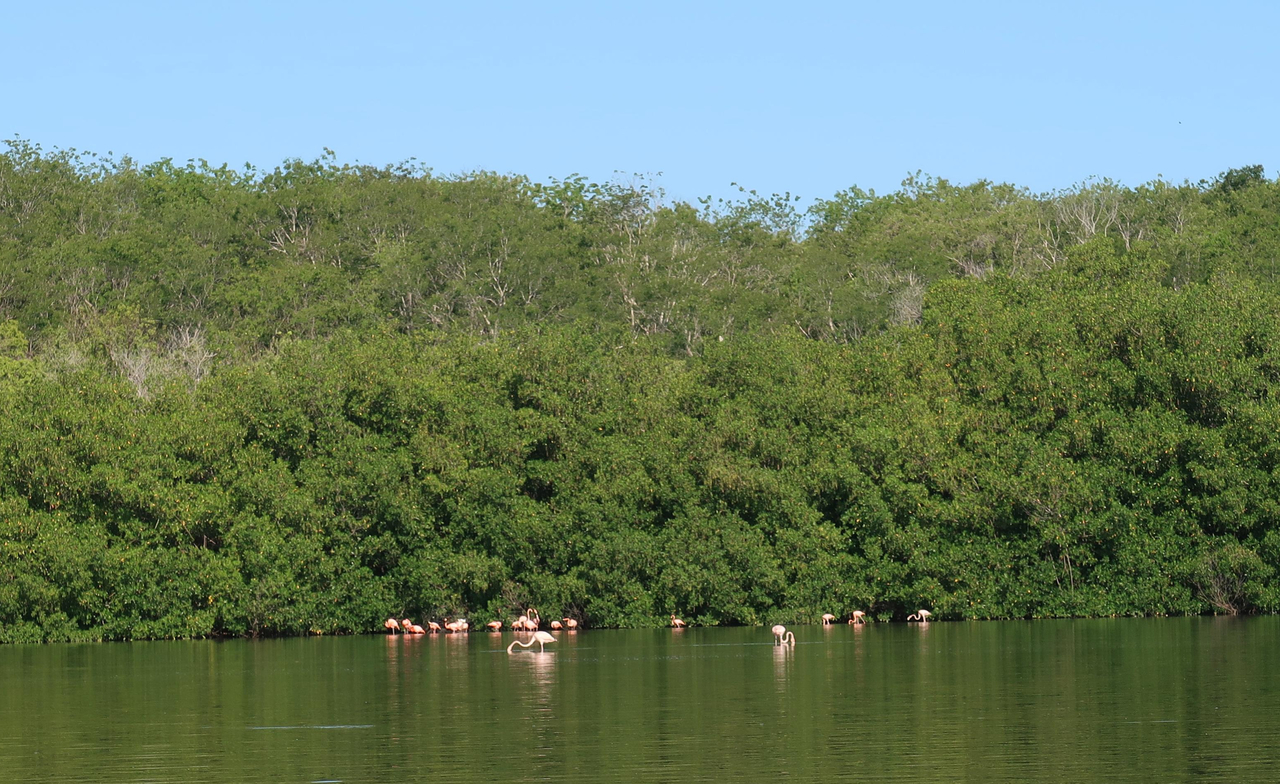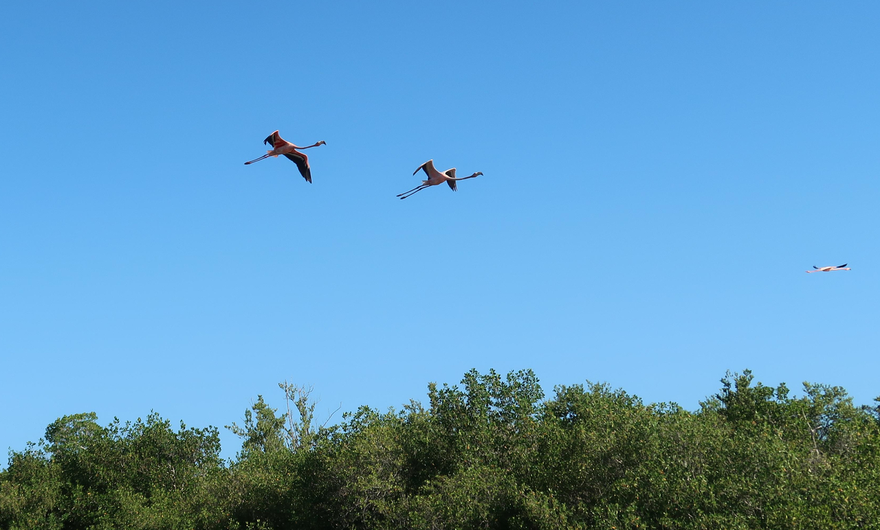 Pelikane landen toll-platschig im Wasser und ein Kanarienvogel breitet seine Flügel schützend über seine Küken aus, während unsere Guides die Boote über die Laguna Guanaroca rudern. Das Highlight des flachen Salzsees sind die Flamingos, die sich am Ufer der Mangroven ihr Shrimp-Frühstück schmecken lassen. Zuerst sehen wir sie nur aus der Ferne, da die Boote einen Abstand von mindestens 100 Metern einhalten. Als die Flamingos majestätisch über uns hinwegfliegen, können wir die noch weißen Jungtiere von den rosafarbenen Ausgewachsenen unterscheiden, die schon mehr Shrimps intus haben. Momentan halten sich in der Lagune nur etwa 200 junge und verwitwete Flamingos auf, während über 2000 weitere zur Paarungszeit nach Florida geflogen sind. Damit wären Flamingos gegenüber Menschen klar im Vorteil, was unbürokratische Reisemöglichkeiten zwischen Kuba und den USA angeht.