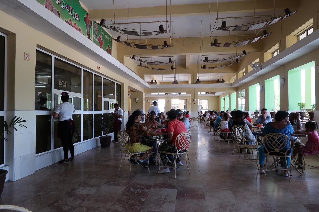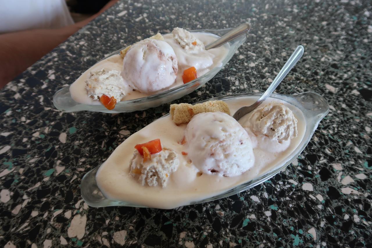 „Eis für alle“ könnte der Slogan der staatlichen Eisdiele Coppelia heißen - wenn ein Slogan an sich nicht zu kapitalistisch wäre. Zuerst heißt es auf der Straße Schlange stehen, wobei die Wartezeit umso länger ist, je mehr Eisspezialitäten auf der Tafel angeschlagen sind. Vom Türsteher bekommt man einen Tisch zugewiesen, was in der Regel bedeutet, dass man sich zu wildfremden Leuten setzt. Es gilt offenbar, möglichst viele Leute möglichst schnell mit möglichst viel Eis zu versorgen und das mit möglichst wenig Arbeitsaufwand (wie Tische abwischen), ergo zu möglichst niedrigen Preisen. Das Ambiente erinnert eher an den Pausenraum einer Fabrik als an eine Eisdiele, nach Chlor schmeckendes Wasser wird ungefragt auf den Tisch geknallt, das Eis wird in zweckmäßigen Plastikschüsseln serviert. Jetzt heißt es schnell sein, denn bei 30 Grad plus schmilzt es vor unseren Augen dahin. Manchmal gibt es nur eine Eissorte, manchmal mehr - Rizado de Chocolate, Almendra, Moscatel, Naranja Piña - , manchmal dazu noch ein Stück Schokokuchen. Die Krönung sind die Preise. Hier wird in Moneda Nacional bezahlt, sodass eine Kugel Eis umgerechnet nur 0,02 Euro (!) kostet. Auch für die Einheimischen scheint es ein Schnäppchen zu sein, da sich viele gleich mehrere Schüsseln voller Eis bestellen. Vielleicht sind die Kubaner so lebensfroh, weil es Eis und Rum praktisch umsonst gibt?