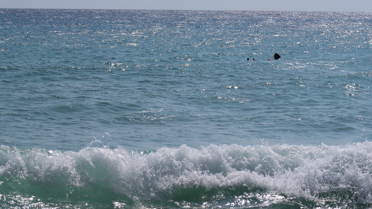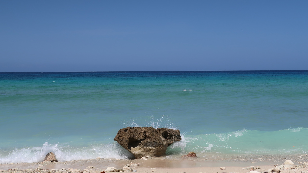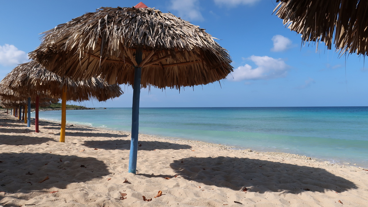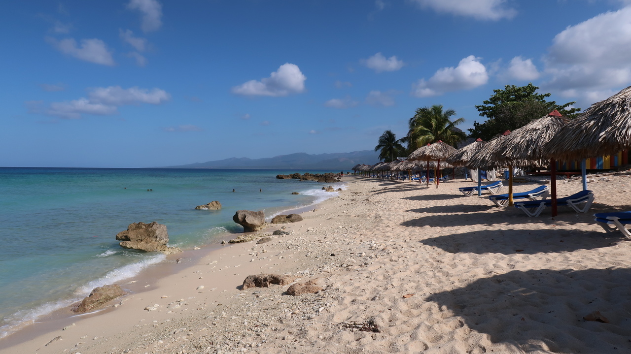Trinidads Hauptverbindungsstraße zum Meer ist der Länge nach aufgebohrt und so bugsieren wir unsere Räder über den zwei Meter tiefen, gut einen Meter breiten Schacht. Dann heißt es Slalom um die Schlaglöcher fahren und den Blick aufs Meer und die Feuerbäume (Flamboyant) genießen. Türkises Wasser, weißer Sand, Sonnenschirme und Liegen, die am Freitagmorgen noch völlig unbesiedelt sind überzeugen uns, den Tag am Strand des Restaurants Grill Caribe zu verbringen. Nervig finden wir, dass die Strandjungs ständig Geld kassieren, so auch für die Bewachung unserer abgeschlossenen Fahrräder auf dem Parkplatz. Dafür entschädigt die tolle Unterwasserwelt, die wir weiter draußen entdecken mit vielseitigen Korallen, Fischen und Seeigeln.