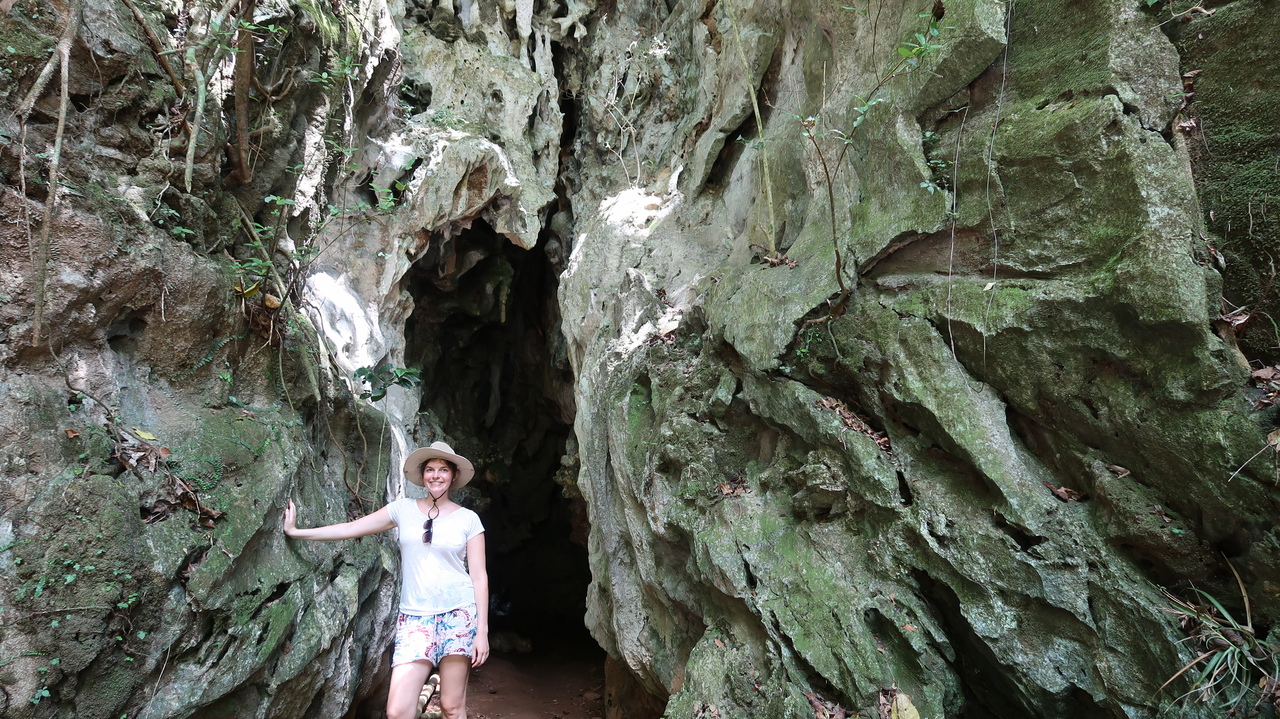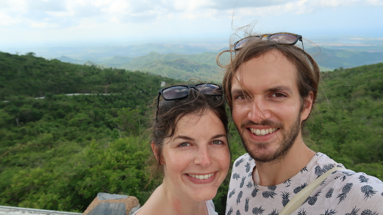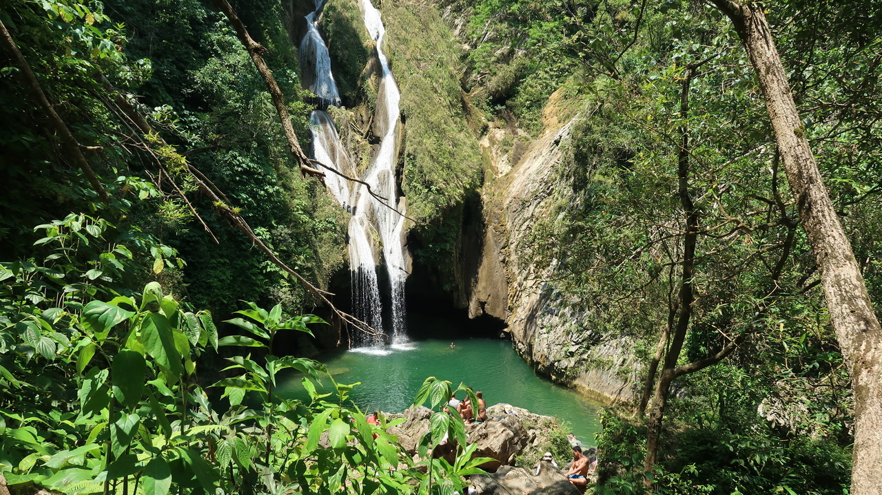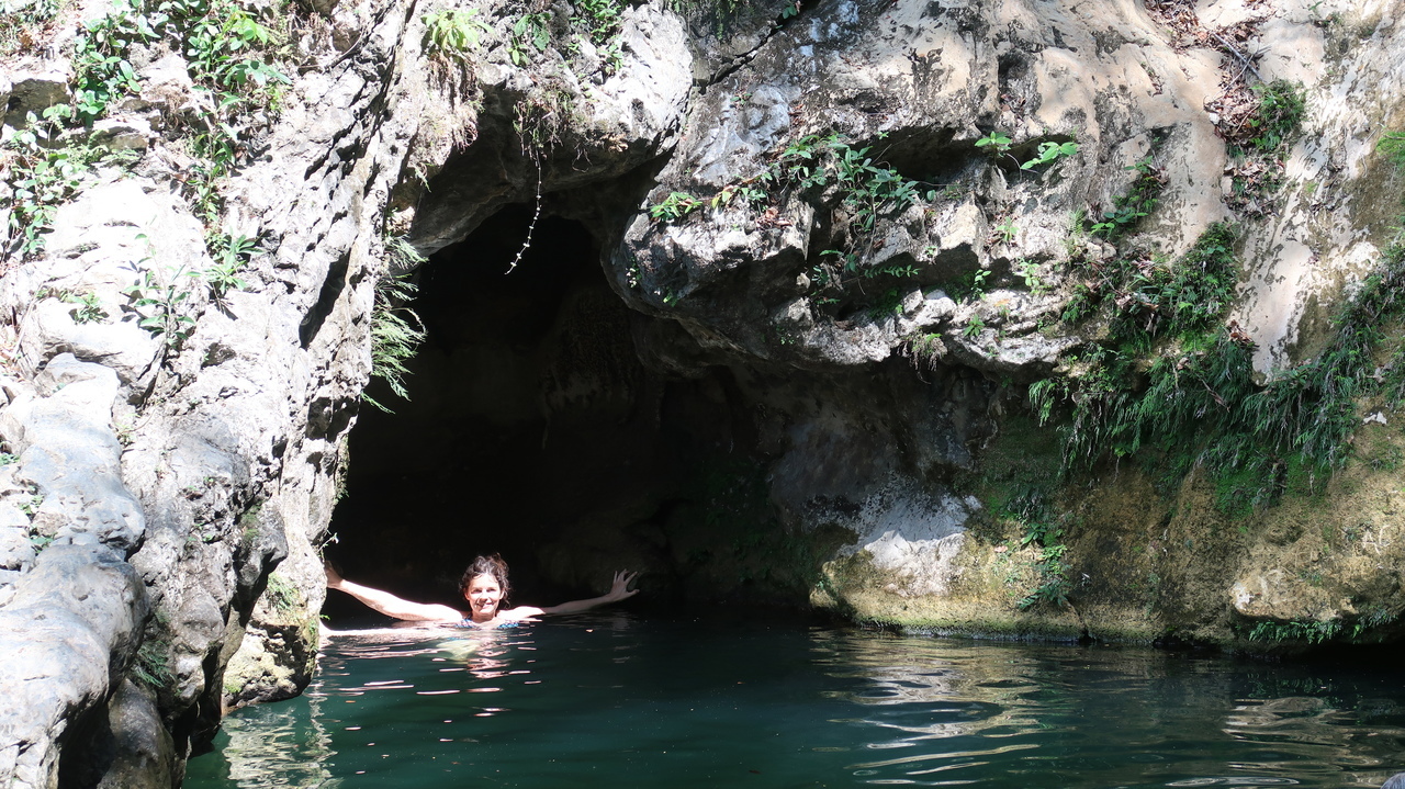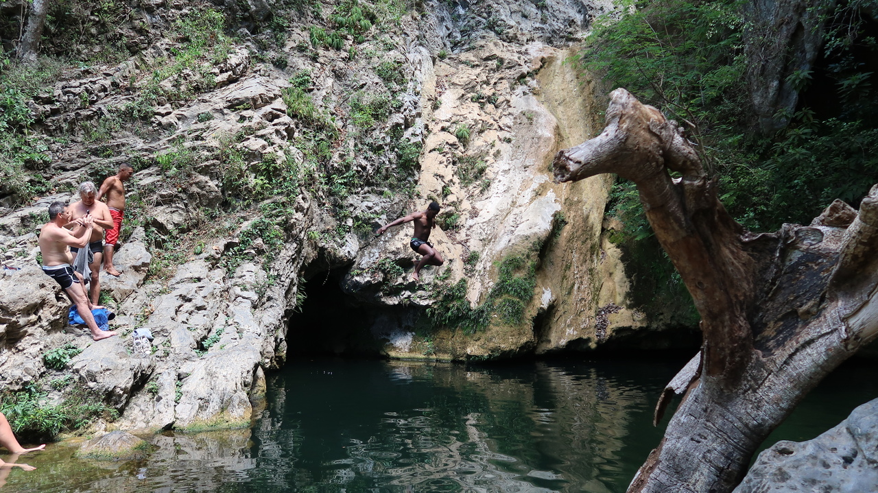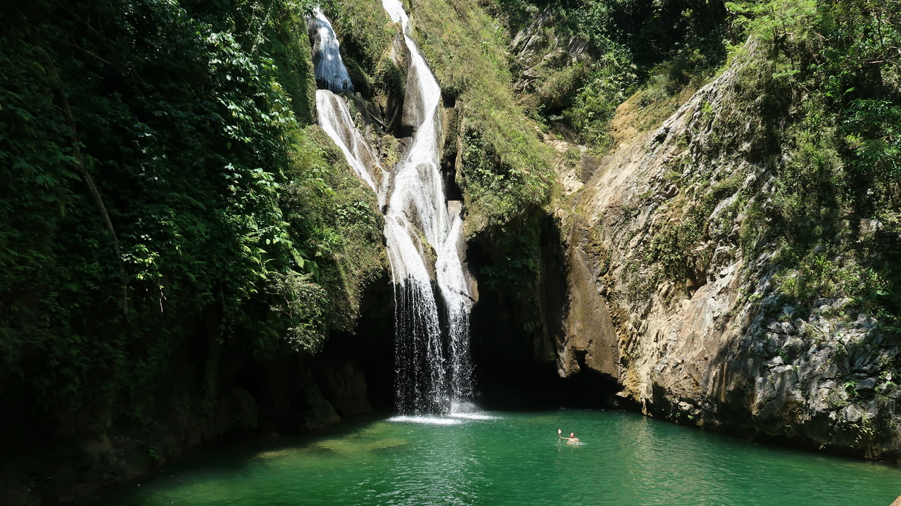 Über lehmfarbene Pfade wandern wir vorbei an riesigen Palmen, Kiefern, durch die saftig grüne Natur und eine kühle Höhle und genießen die Vielfalt des Nationalparks Topes de Collantes. Als wir ins Tal hinabsteigen, taucht einer der schönsten Wasserfälle unserer Weltreise auf - Schleifen weißer Milch fallen sanft in ein türkises Felsbecken mit kristallklarem Wasser, umgeben von Felsen, Farnen und Schlingpflanzen. Hinter dem Wasserfall schwimmen wir durch eine offene Tropfsteinhöhle, das eisige Wasser der Vegas Grandes erinnert uns an Maguk in Australien. Magisch!