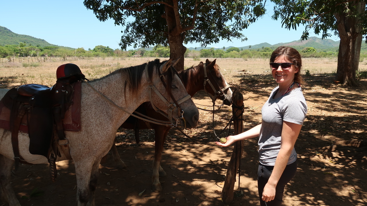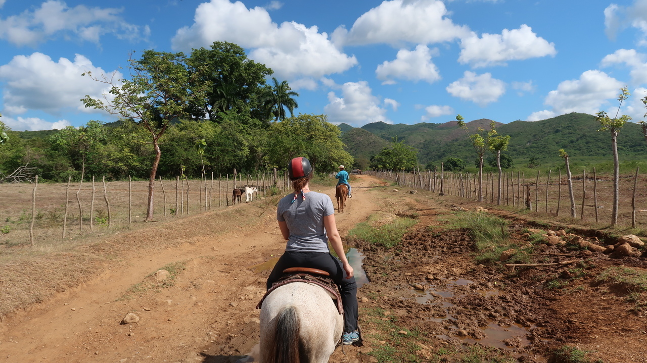 Im Valle de los Ingenios reiten wir vorbei an einer Backsteinfabrik und einer Genossenschaft zur Milcherzeugung. Unsere Pferde Bamboleo und Barijo sind bemerkenswert gut ausgebildet und reagieren auf die feinsten Signale. Der Saldo de Cubano erinnert in der Trockenzeit eher an ein Wasserloch als an einen Wasserfall, bietet aber eine angenehme Abkühlung. Genauso auch die grüne Kokosnuss, die wir trinken. Auf Josés Ranch trinken wir leckeren Guarapo, also Zuckerrohrsaft mit Limette, zum Mittagsmenü und füttern unsere Pferde mit Mangos, die unter den Bäumen liegen.