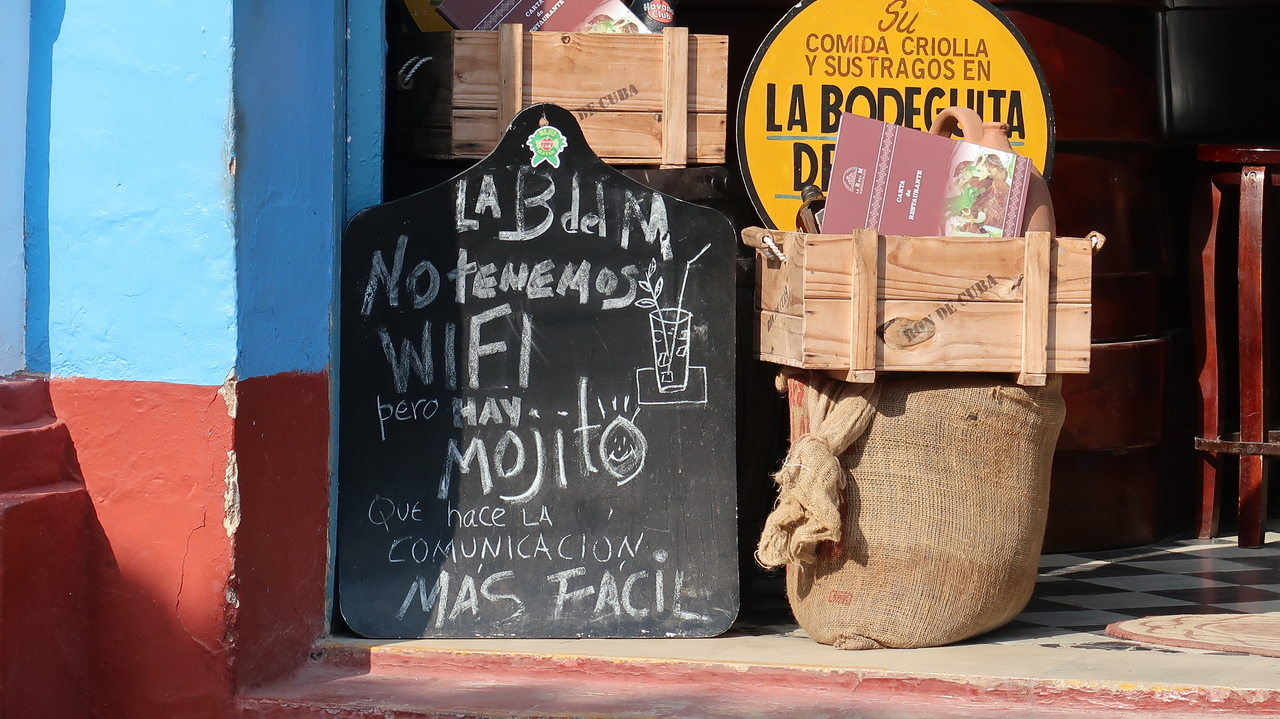 Wir sitzen im Parque Céspedes und warten darauf, ins öffentliche WLAN zu kommen, um uns dann mit unserer Karte (1 Euro pro Stunde) ins Internet einwählen zu dürfen. Um dann an der Zeitlupen-Geschwindigkeit des kubanischen Internets zu verzweifeln. Ja, es gibt inzwischen Internet in Kuba. Allerdings erlaubt das System nicht, durchgehend online zu sein. Der Vorteil: die Menschen reden miteinander. In vielen Bars weisen Tafeln Smartphone-süchtige Touris augenzwinkernd darauf hin, es gebe zwar kein WLAN, aber Mojito, der die Kommunikation erleichtere. Der Nachteil: man braucht starke Nerven, wenn man doch mal online gehen muss.