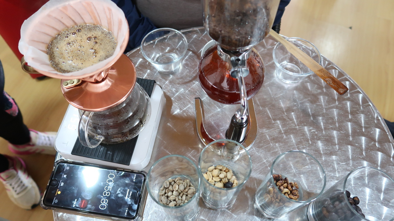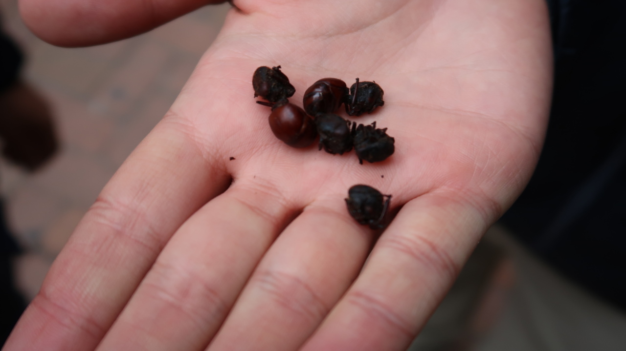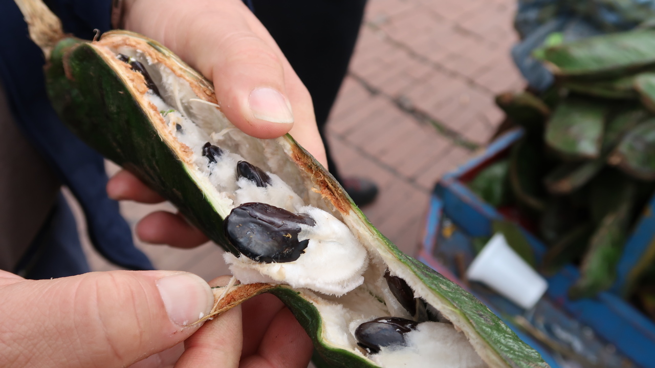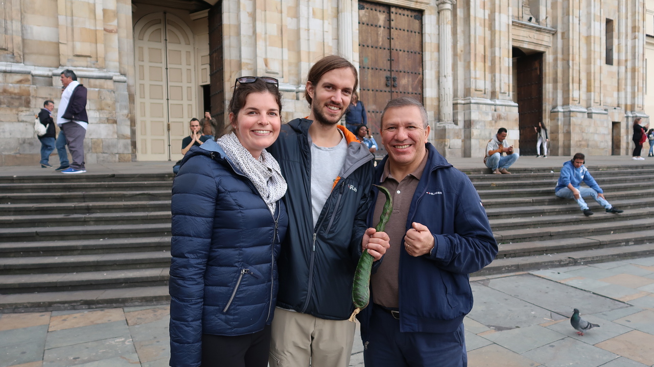 Bogotá liegt 2.600 Metern über dem Meeresspiegel, was wir hin und wieder merken. Auf Carlos Vorschlag hin trinken wir einen Coca Tee, der den Kreislauf wieder in Schwung bringt. Im Barista Café kosten wir kolumbianischen Kaffee, der auf unterschiedliche Art gebrüht wird: einmal mit einem japanischen Siphon, das uns an den Chemie-Unterricht erinnert, und mit einem einfachen Filter. Dazu gibt es einen veganen Schokoladenkuchen, der die Geschmacksnoten des Kaffees noch besser hervorbringt. ¡Qué rico! Gar nicht unser Fall sind dagegen die frittierten Ameisen, die Carlos an einem Straßenstand kauft und uns begeistert anbietet, eine Spezialität in der kolumbianischen Bergregion. Immerhin haben wir sie probiert. Die Obleados con dulce de leche (hauchdünne Waffeln mit Milchkaramellcreme) können sich dagegen wieder sehen lassen und besonders lecker ist die Guama, eine lange grüne Frucht mit flauschig weißem Fruchtfleisch. Zwischendurch interviewen uns auf der Plazoleta zwei Schülerinnen für ein Schulprojekt zu unseren Eindrücken von Bogotá. Ob wir uns vorstellen könnten, hier zu wohnen. Gute Frage. Im Winter eher nicht.