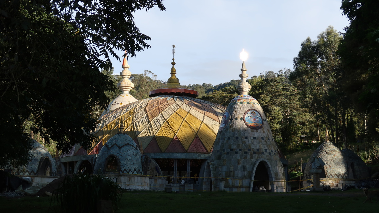 Verschnörkelte Gebäude, exotisch blühende Pflanzen, ein gepflegter Gemüsegarten und indisch anmutende Tempelchen empfangen uns. Ein paar Leute in weiten Kleidern spazieren über das Gelände, aber es ist niemand da, um uns zu empfangen. Wir stehen ein Weilchen herum, bis jemand uns ins Gästehaus führt. Es riecht muffig und steht voller Hochbetten, auch das Eingangszimmer. Wir bekommen einen Schlüssel, den wir uns mit einem weiteren Voluntario teilen sollen. Kurz darauf lernen wir Marco aus Italien kennen, der Halb-Amerikaner ist und gerade das Freshman Year seines Studiums in New York abgeschlossen hat. Er ist seit zwei Wochen als Freiwilliger hier und wirkt ziemlich begeistert, aber auch etwas verstimmt, da am Vortag sein Rucksack gestohlen wurde. Wir entschließen, unsere Wertsachen fürs erste ständig mit uns herumzutragen.