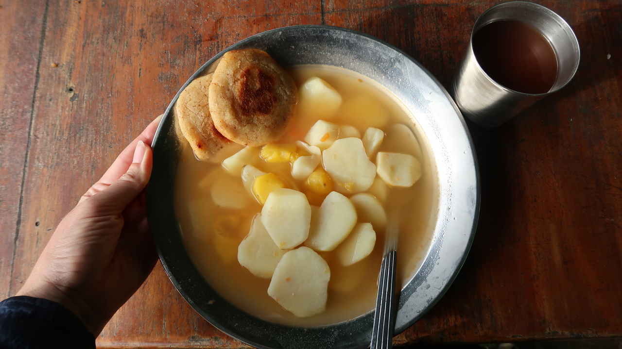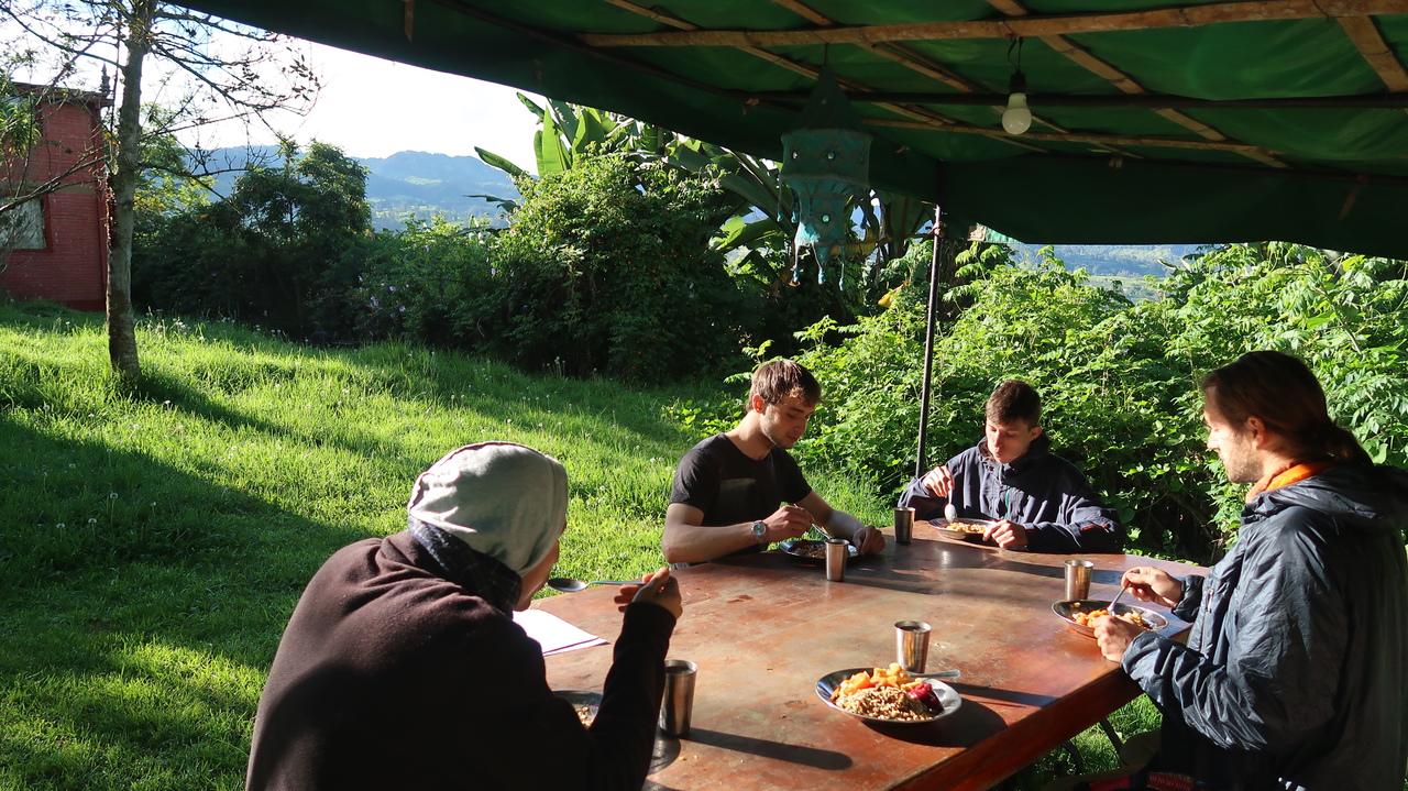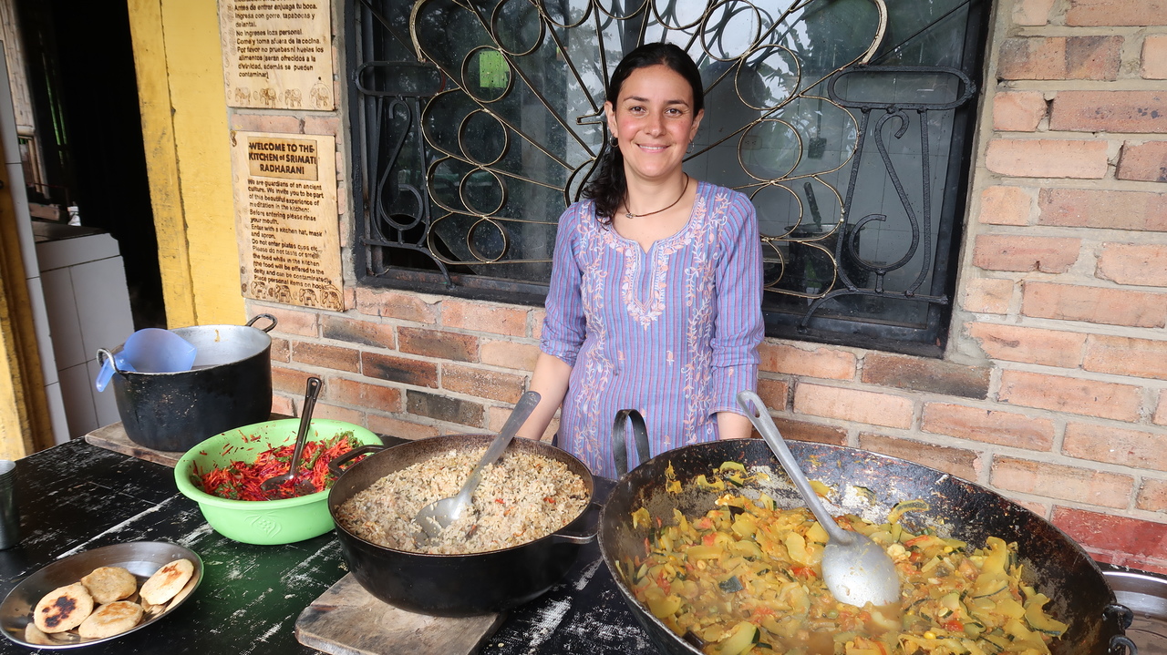 Morgens werden wir von Sonnenschein und einem leckeren Frühstück entschädigt: es gibt Kartoffelsuppe, Arepas (Maisküchlein) und heiße Schokolade. „Hare Krishna“ grüßen einige Mitglieder der Community - spätestens jetzt hätten wir Bescheid gewusst. Die Koordinatorin Premi heißt uns willkommen und erklärt uns grob den Tagesablauf. Wir erfahren, dass morgens ab 4 Uhr schon Meditationssitzungen und eine Vorlesung zur Hare Krishna Philosophie stattgefunden haben. Seltsam, dass es keinen Zeitplan wie im Bodhinyana Kloster oder im Nilambe Meditation Centre gibt und alle Angaben recht vage klingen.