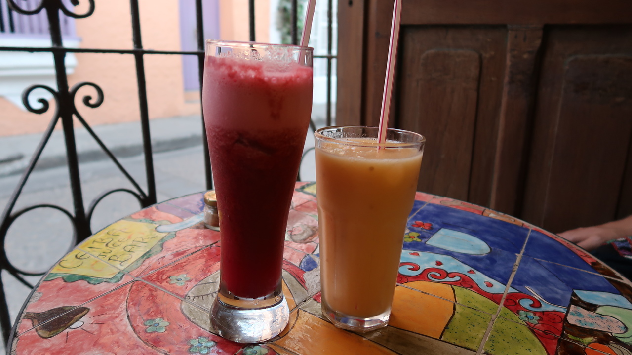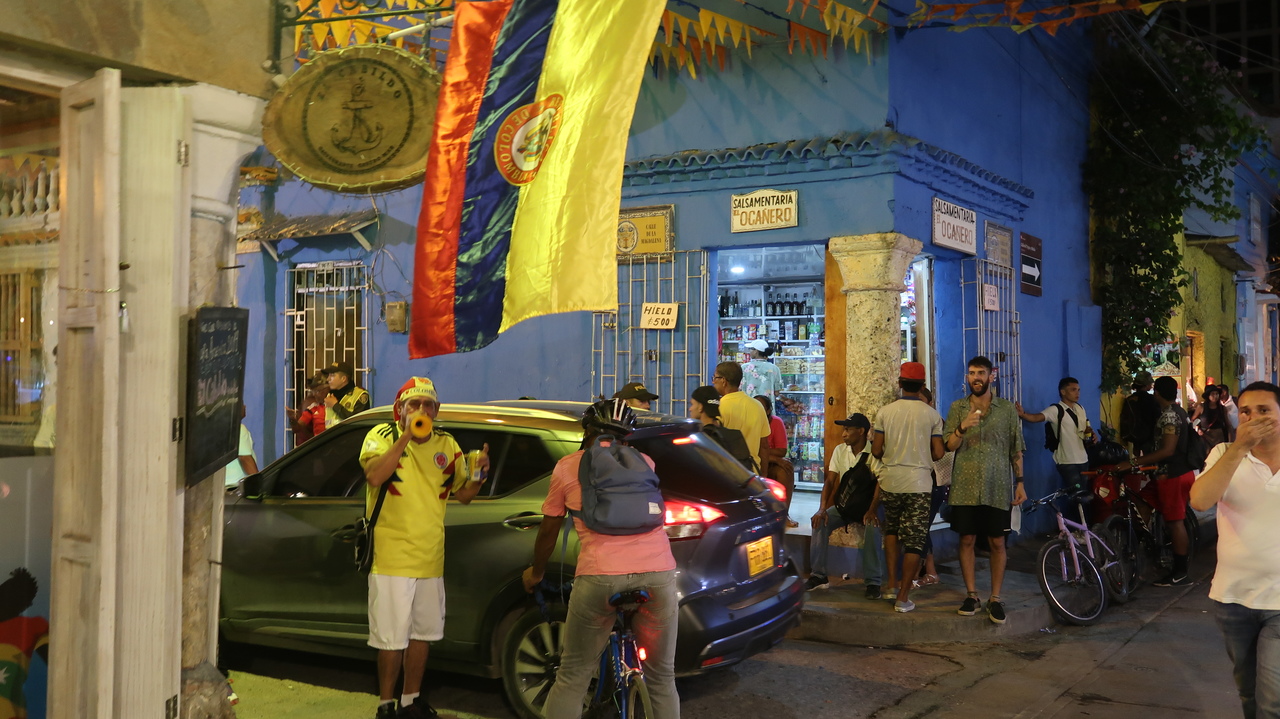 “¡Gol!” - Tor für Kolumbien! Überall in Cartagena Jubelschreie und trötende Vuvuzelas. Geschossen hat das Tor gerade ein Sohn der Stadt, wie uns eine der ausgelassenen Kellnerinnen im Beyrú stolz erklärt. Hier lassen wir uns gerade Maniok-Tortillas und Corozo-Saft schmecken, der an Rote Grütze erinnert. Kurz darauf ein weiteres Tor. Und so schlägt Kolumbien Argentinien 2:0 im ersten Gruppenspiel des Copa America. Wir erleben die Kolonialstadt an der Karibikküste im Siegestaumel, als wir abends durch die beleuchteten Gassen des Kolonialstädtchens spazieren.