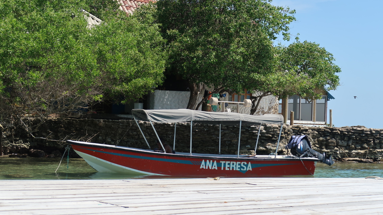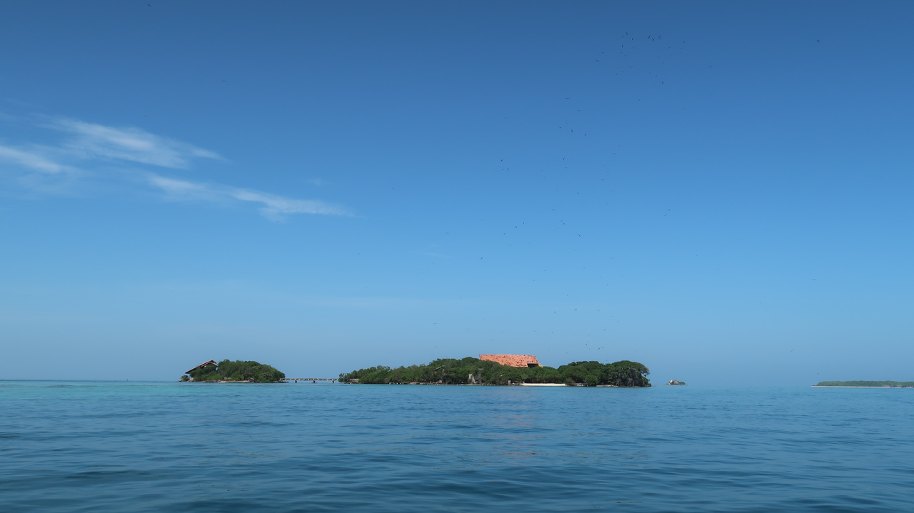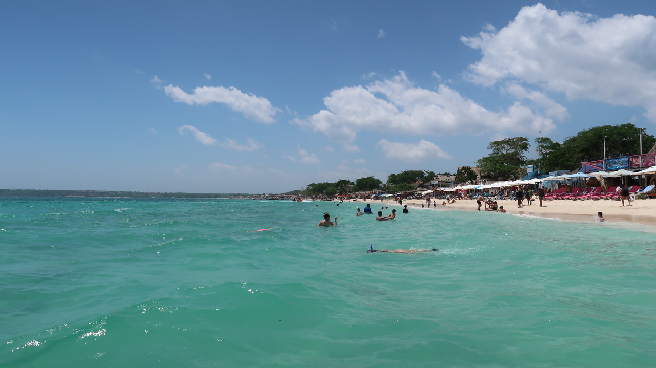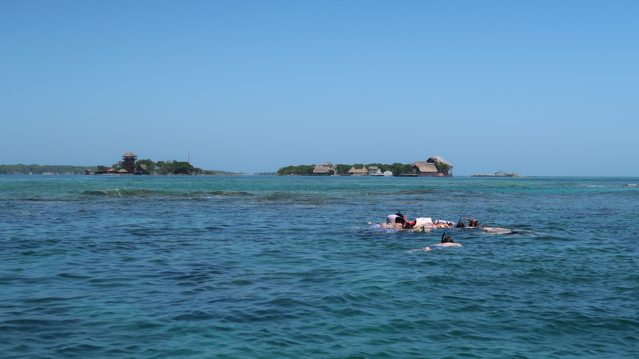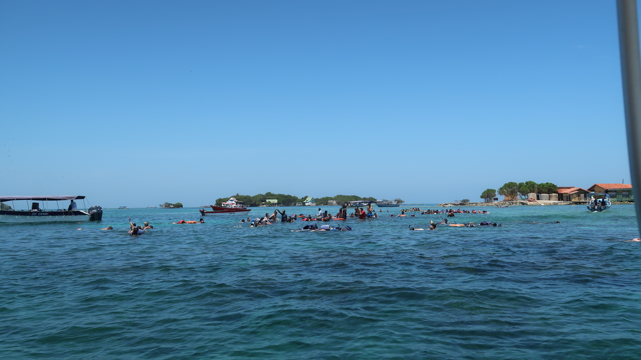 24 der 27 Islas del Rosario sind in Privatbesitz, an denen wir an Bord der Francesca Prince vorbeisausen. Eine davon gehörte einst Pablo Escobar, jetzt fliegt gerade ein riesiger Schwarm großer Vögel darüber umher. Alle Ansagen unserer Bootsjungs sind in karibisch-kolumbianischen Spanisch, was selbst ihre Mitbürger aus der Hauptstadt kaum verstehen, geschweige denn französische Touris, die noch dazu so gut wie kein Englisch sprechen. Nach einer Reihe witziger Missverständnisse ist in der Nähe der winzigen Isla de San Martín de Pajaroles endlich Schnorcheln angesagt. Zu unserer Enttäuschung sind die Korallen verblichen und versandet und die Sicht so naja. Es sind kaum Fische zu sehen und obwohl wir beide unsere Schnorchel austauschen, sind sie immer noch undicht. Als unser Schnorchel-Guide die Fische anfüttert, sind wir auf einmal von riesigen Schwärmen bunter Papageienfische umgeben, die Anna zweimal neugierig anknabbern. Schockierend finden wir, dass auch Nichtschwimmer mit schnorcheln, die an Rettungsringen hängen und auf den Korallen stehen. Nach Aussage der Guides dürfen auch Nichtschwimmer explizit mitmachen, da man überall stehen könne. Leider scheint hier Geldmacherei über Umweltschutz und Sicherheit gestellt zu werden, weshalb wir von diesen Ausflügen zu den Islas del Rosario nur abraten können.