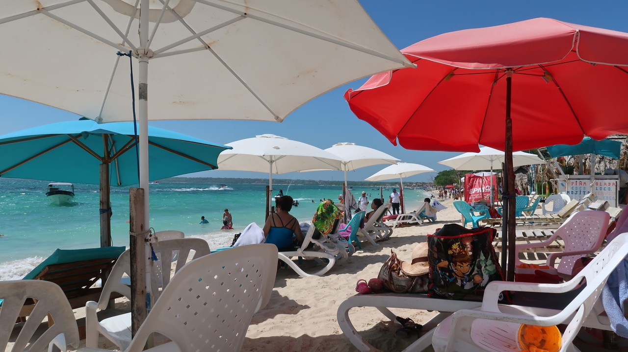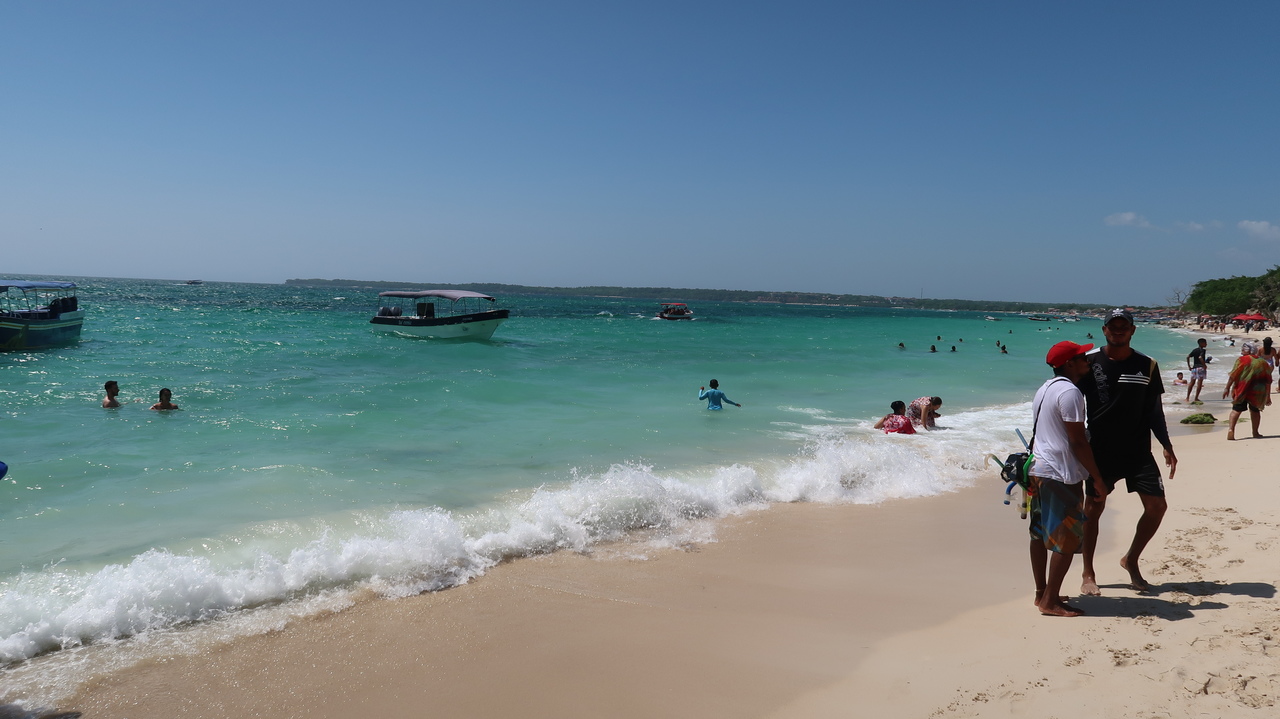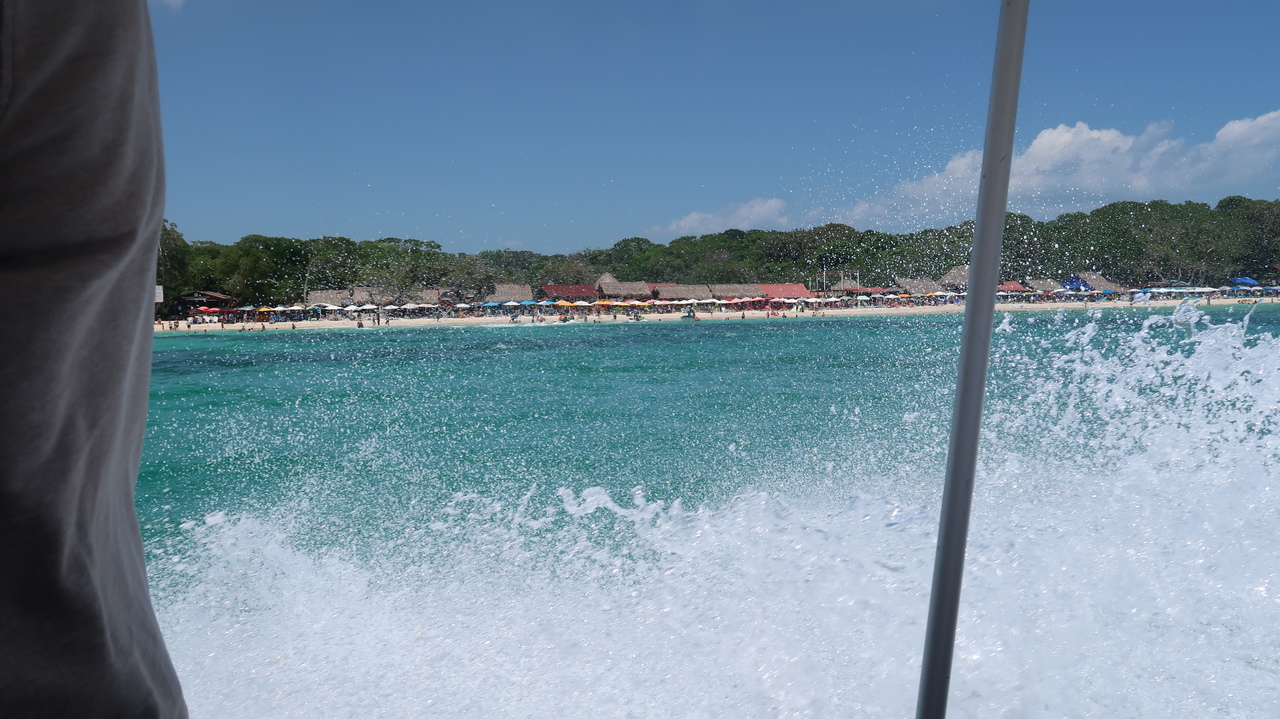 Weißer Sand und türkises Wasser – von ihren natürlichen Gegebenheiten her ist die Playa Blanca auf der Halbinsel Barú ein Postkartenstrand. Oder war dies zumindest, bis sie Unmengen von Touristen anzog, die wiederum ganze Horden von Strandverkäufern mit allerlei geldeinbringender Schnick-Schnack-Infrastruktur mit sich brachten. Der Strand ist so zugebaut mit Liegen, Schirmen, Restaurants, Ständen und voller Menschen, dass eine Frau ganz aufgelöst und verzweifelt ihren kleinen Sohn sucht, den sie vor lauter Gewimmel aus den Augen verloren hat. Zum Glück finden sich die beiden wieder. Alle zehn Sekunden möchte uns jemand etwas verkaufen - Seepferdchen-Bürsten, Massagen, Obstsalate, Fußkettchen, Cocadas … Entspannung? Fehlanzeige. Immerhin schmeckt die Coco Loco köstlich, die wir uns hier gönnen. Dieser Karibik-Klassiker bezeichnet eine mit Rum versetzte “verrückte Kokosnuss” und passt buchstäblich ausgezeichnet hierhin. Ansonsten sind wir froh, als wir die Massenveranstaltung wieder verlassen können. Auf der Rückfahrt durch die Bahía de Cartagena springt die Francesca Prince meterhoch und -weit über die inzwischen riesigen Wellen – die reinste Achterbahnfahrt.
