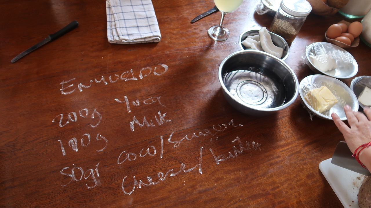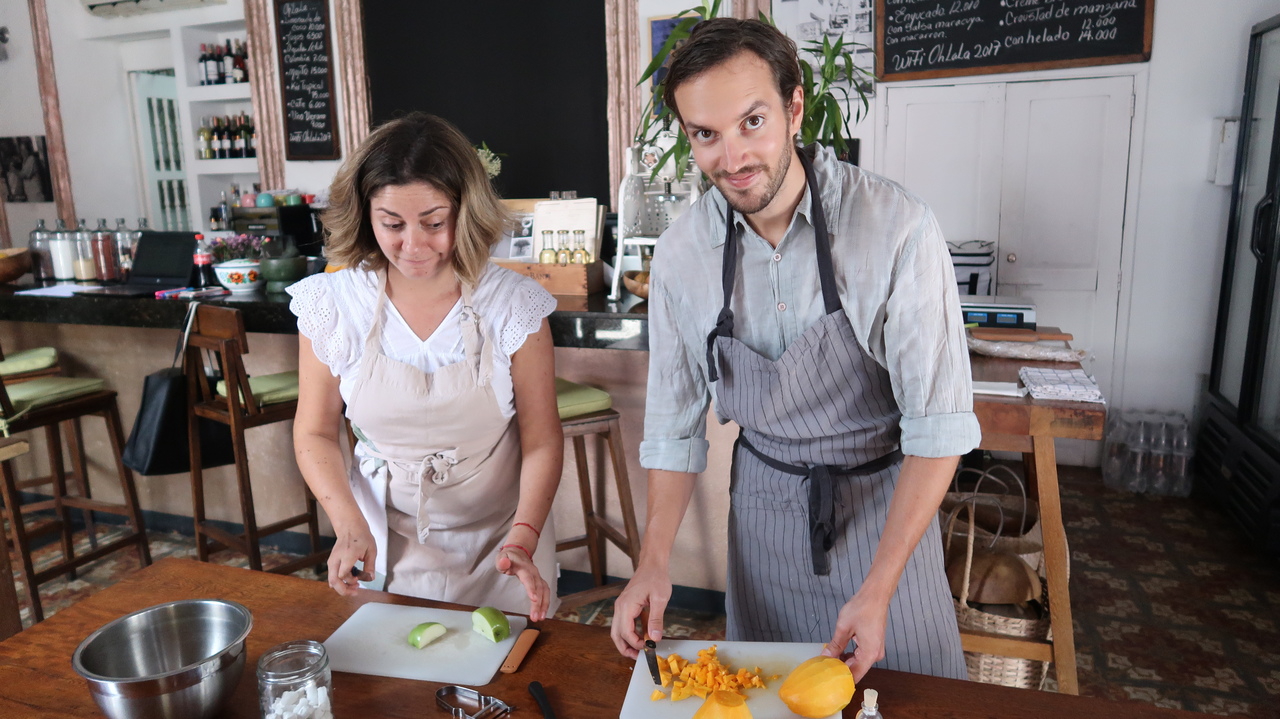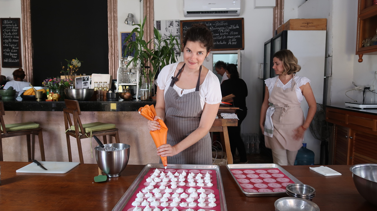 “Oh Lá Lá”. Hier wird kolumbianische Traditionsküche der mit der Raffinesse französischer Kochkunst kombiniert. Carolina weiht uns in einem grandiosen Kochkurs in die Rezepte ihrer Familie ein. Sie stammt aus Cartagena und hat zwölf Jahre in Paris gelebt, wo sie ihre Liebe zum Kochen entdeckte. Wir lernen eine ganze Reihe vegetarischer Gerichte kochen, die wir aus marktfrischen Zutaten zaubern, während wir neue Schneide- und Zubereitungstechniken kennen lernen und uns sehr nett mit Carolina unterhalten. Unser Kochkurs findet im Restaurant Oh Lá Lá selbst statt, wo eine familiäre Wohnzimmer-Atmosphäre herrscht. Viele der europäischen Gäste sind mit Carolina und ihrem französischen Mann befreundet und kommen interessiert an unseren Tisch.