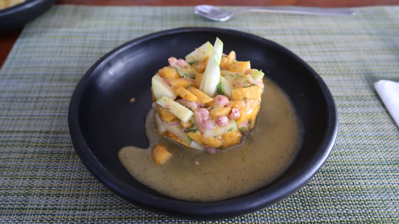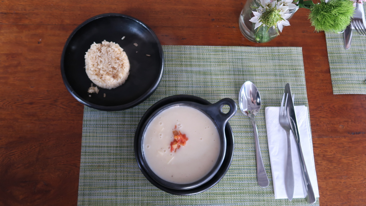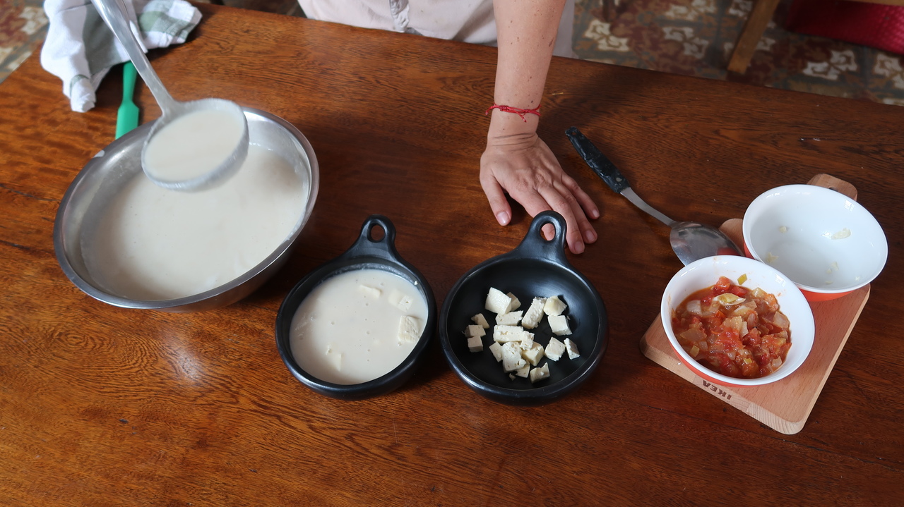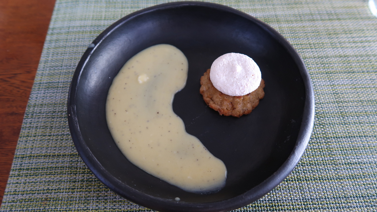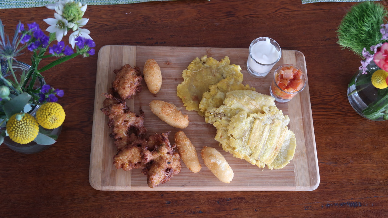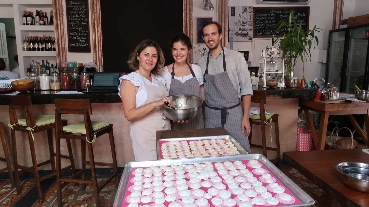 Schließlich ist alles bereit für das Déjeuner Colombien. Als Vorspeise gibt es allerlei Frittiertes: Patacones (zerdrückte Kochbananen), Bananenchips, Carimañolas aus Maniok, Arepas aus dunklem Bio-Mais, dazu eine Tomaten-Zwiebel-Sauce namens Hogao, außerdem Mango-Ceviche mit dem sogenannten Tiger Milk Dressing aus Limettensaft, Chili und Zwiebeln. Das Hauptgericht ist Ñame-Suppe aus Yam-Knollen mit Queso Costeño und Hogao, dazu Kokosnuss-Reis mit Karamell. Gekrönt wird das ganze von Enyucado (Maniokkuchen-Muffins) und Kokos-Macarons mit Maracuja-Soße und weißer Schokolade. Oh Lá Lá!