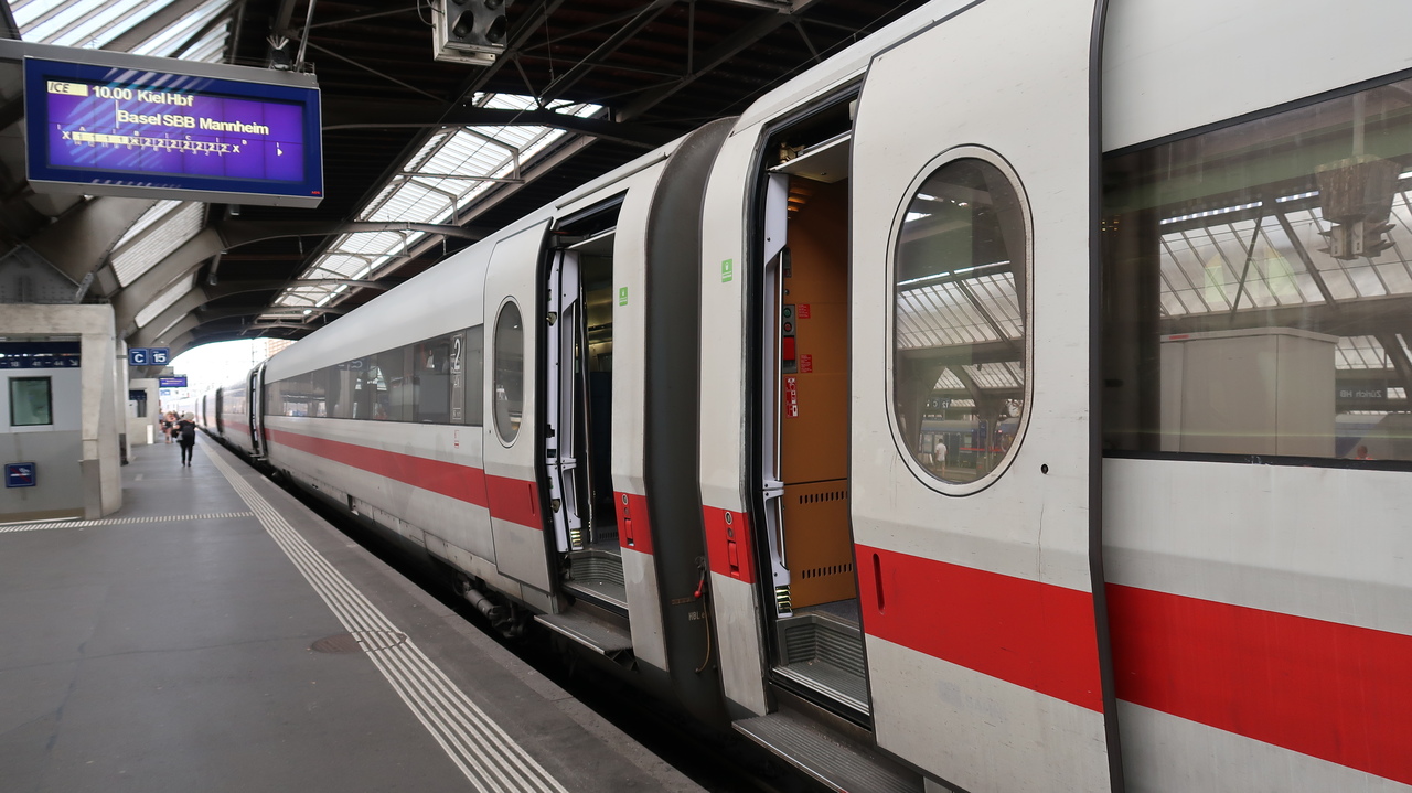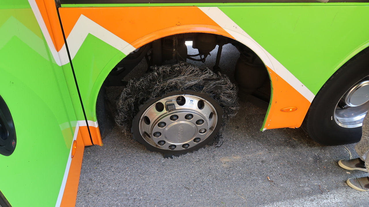 Überraschend komfortabel empfinden wir unsere erste Fahrt in einem Flixbus, den wir in Mailand Richtung Norden nehmen, bis – was ist das für ein Vibrieren? - der Bus im Tessin einen Platten hat. Ein Weilchen warten wir auf dem Standstreifen, bis zwei Polizisten in Warnwesten uns Fahrgäste bitten, uns doch bitte nach ganz vorne links zu setzen. So eskortiert die Polizei den lahmen Flixbus bis zum nächsten Parkplatz. Während nebenan schicke Teslas Strom tanken, sieht der ramponierte Reifen unseres Busses aus als hätte er versucht, sich in Luft aufzulösen.