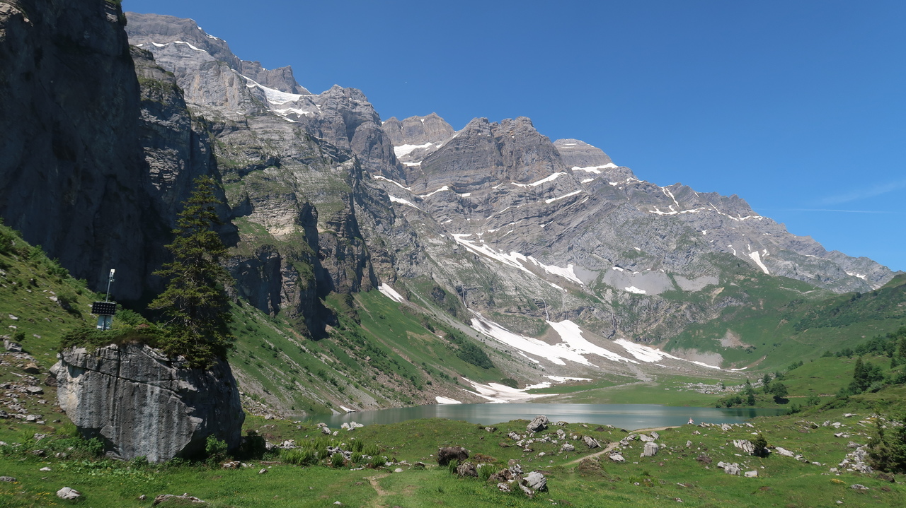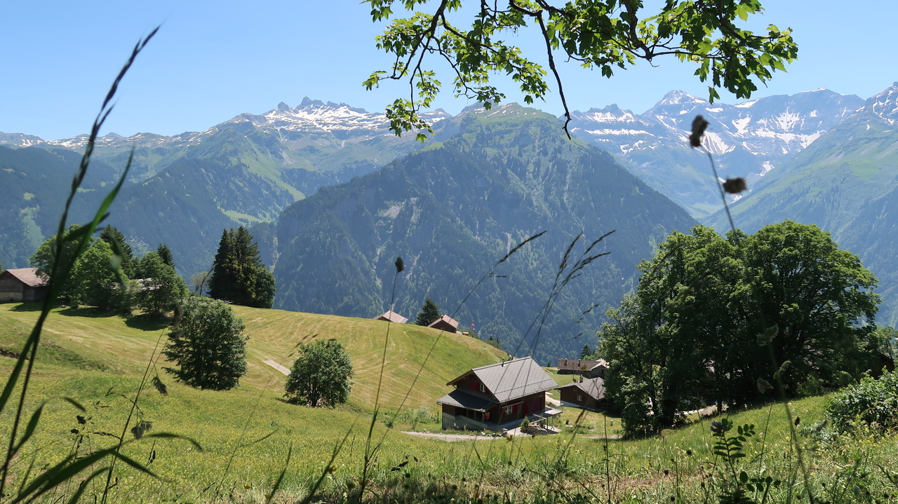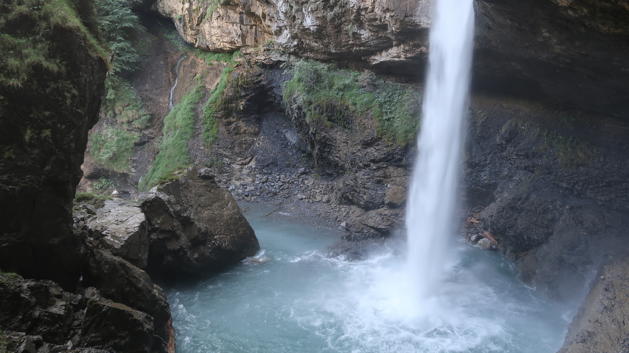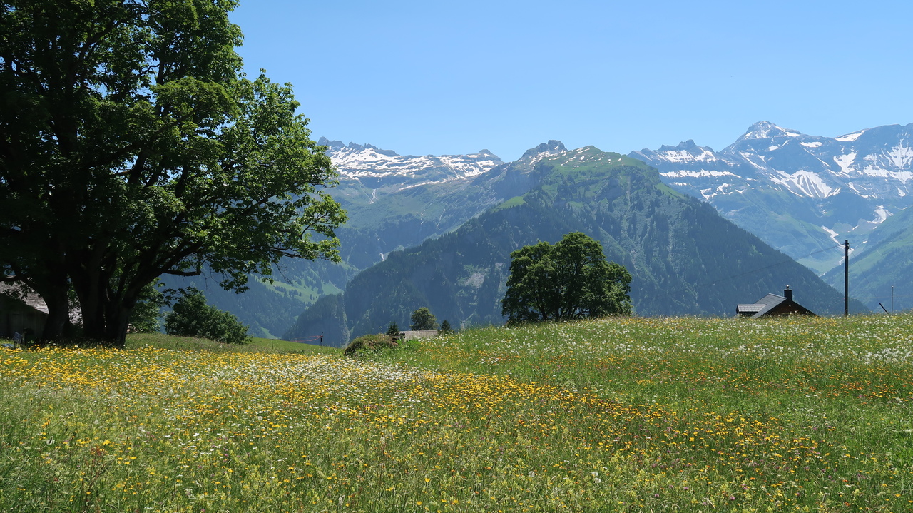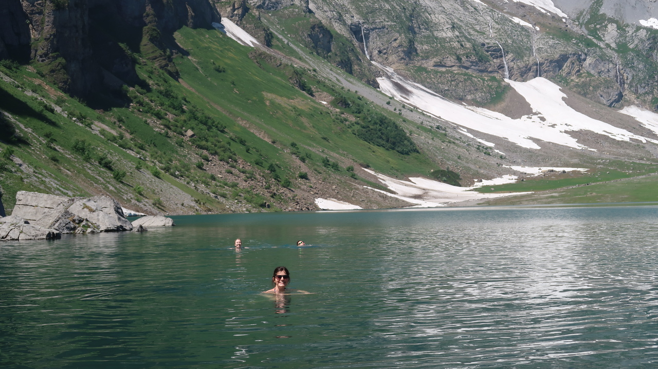 In nur sieben Minuten bewältigt die Braunwaldbahn 600 Höhenmeter. Von Braunwald aus wandern wir zu viert durch Alpenlandschaften à la Heidi: blühende Alpenwiesen vor tiefen Tälern, schneebedeckten Gipfeln und rauschen Wasserfällen. Selbst hier in den Bergen ist es noch über 30 Grad heiß, sodass die Abkühlung im Oberblebisee gerade richtig kommt. Der zulaufende Schmelzwasserbach und das Schneefeld direkt neben dem See sorgen dabei für eisig kaltes Wasser. Auch der Berglistüber Wasserfall profitiert von den gewaltigen Mengen Schmelzwasser, die mit Wucht in das Felsbecken hinabstürzen.