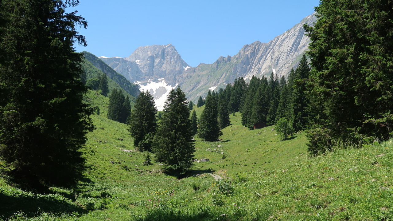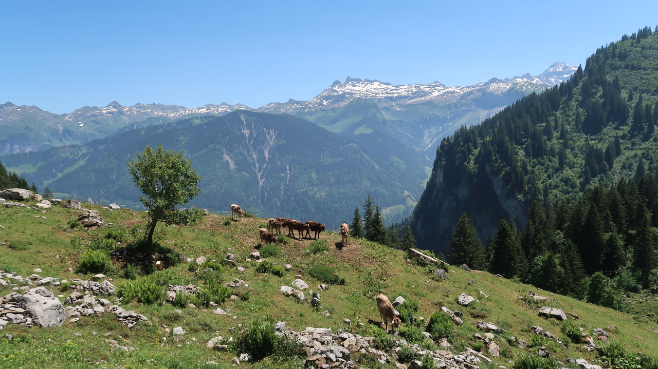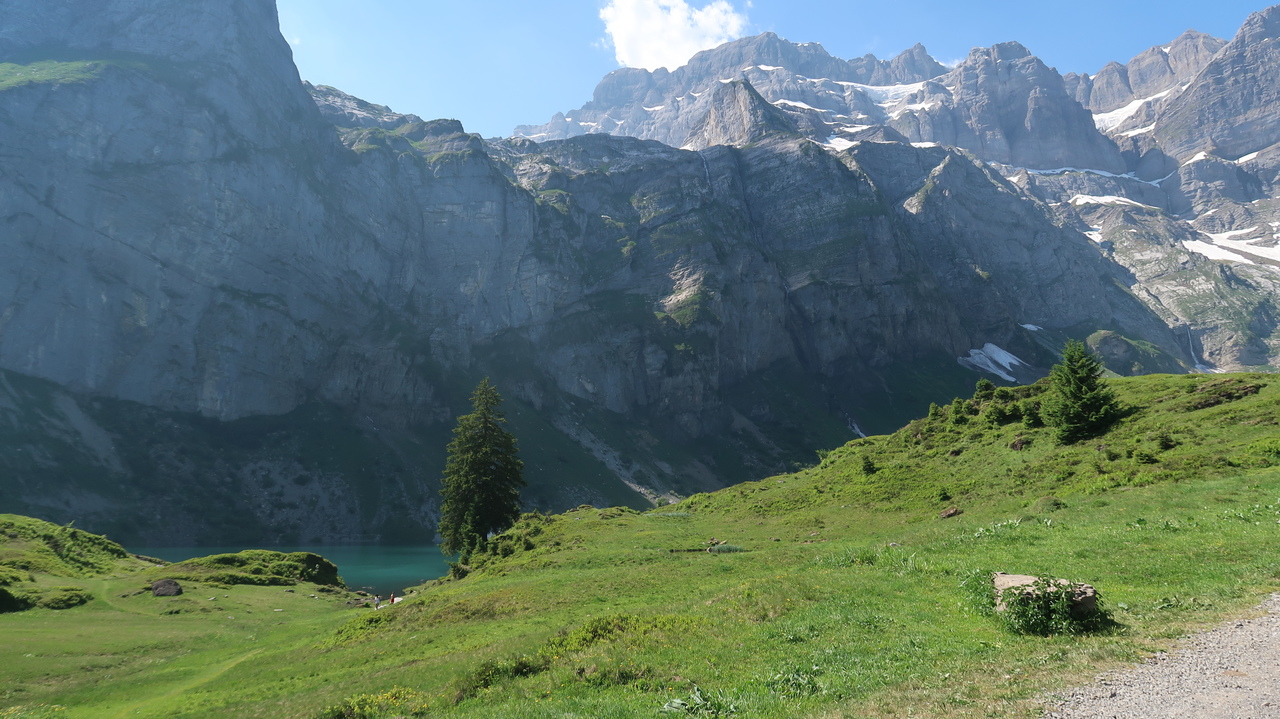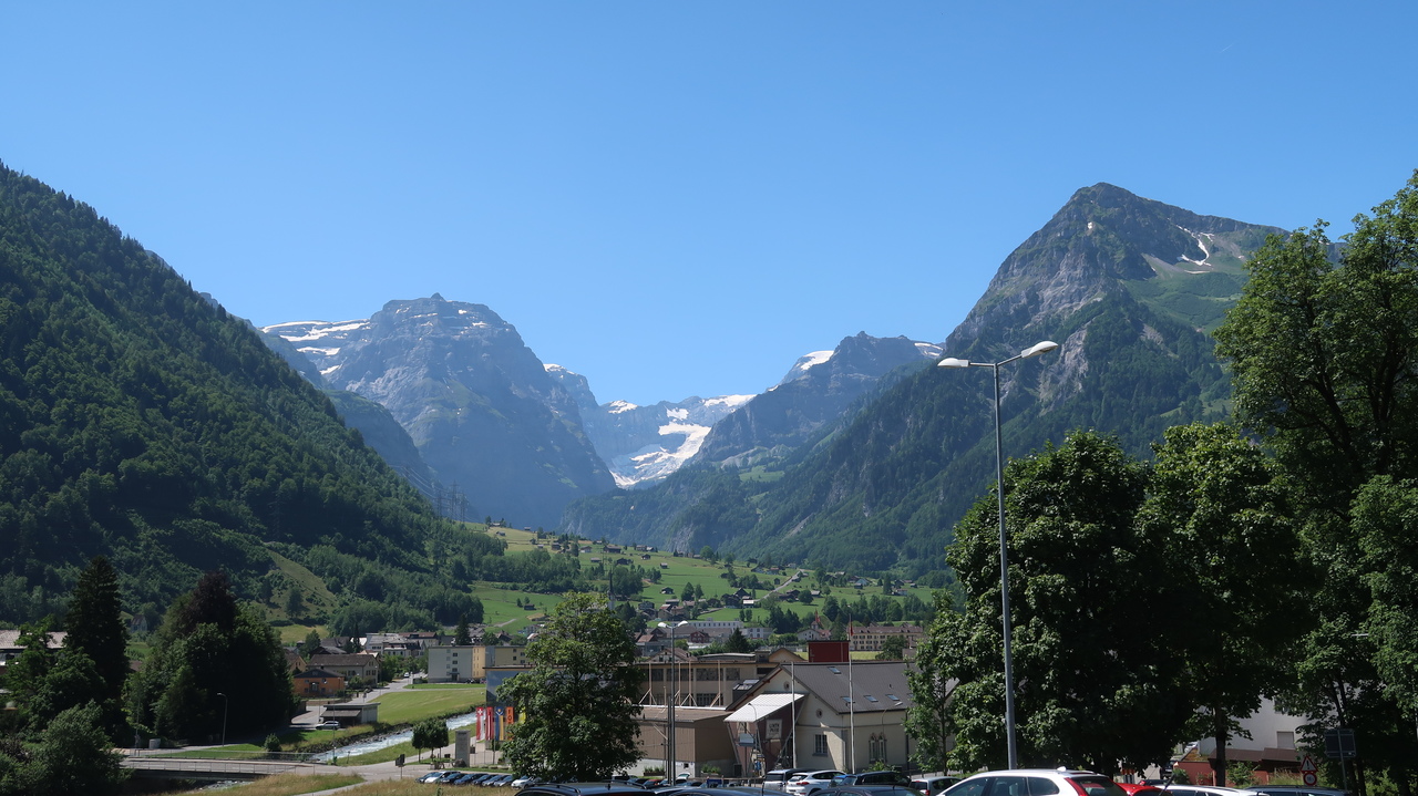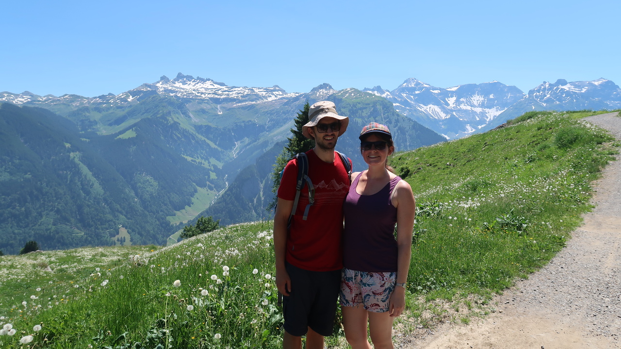 In nur sieben Minuten bewältigt die Braunwaldbahn 600 Höhenmeter. Von Braunwald aus wandern wir zu viert durch Alpenlandschaften à la Heidi: blühende Alpenwiesen vor tiefen Tälern, schneebedeckten Gipfeln und rauschen Wasserfällen. Selbst hier in den Bergen ist es noch über 30 Grad heiß, sodass die Abkühlung im Oberblebisee gerade richtig kommt. Der zulaufende Schmelzwasserbach und das Schneefeld direkt neben dem See sorgen dabei für eisig kaltes Wasser. Auch der Berglistüber Wasserfall profitiert von den gewaltigen Mengen Schmelzwasser, die mit Wucht in das Felsbecken hinabstürzen.