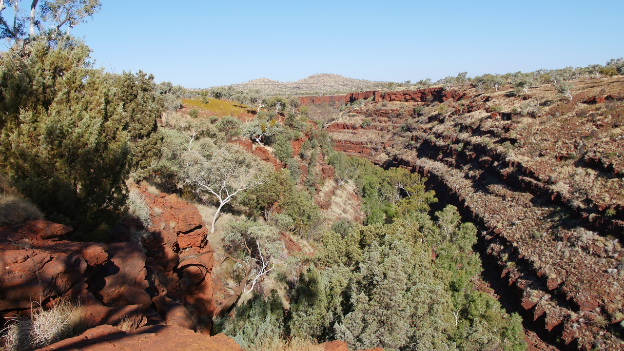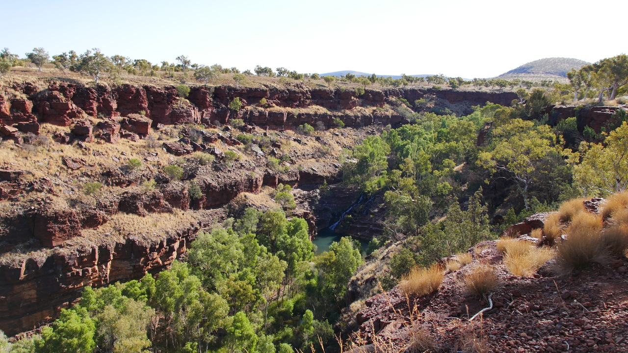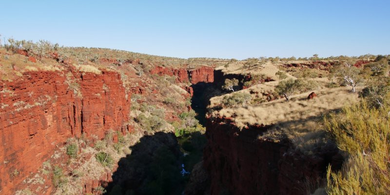Da die Schluchten des Karijini Nationalparks in der Hamersley Range quasi Einschnitte in der Erdoberfläche sind, sehen wir sie erst, als wir uns ihnen nähern. Plötzlich stehen wir vor einer 100 Meter tiefen Schlucht mit roten Felswänden und steigen hinab ins Abenteuer…